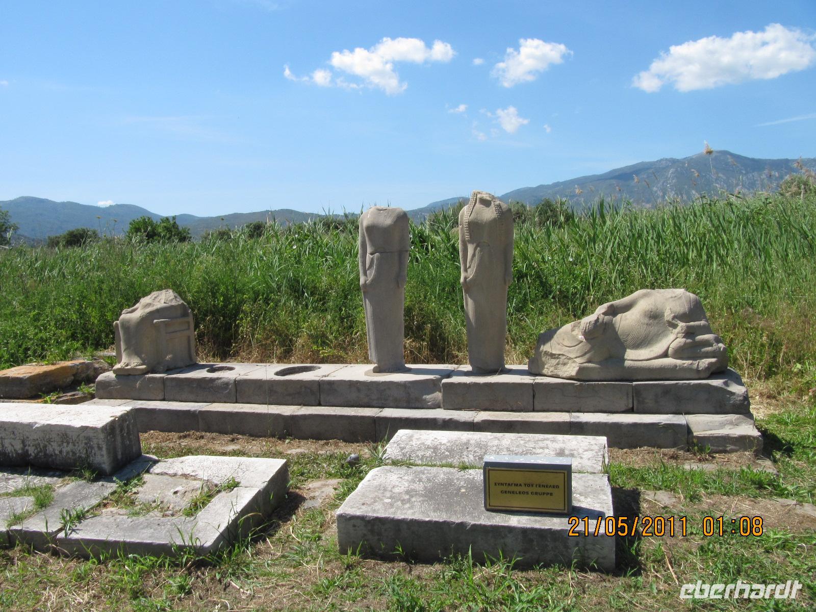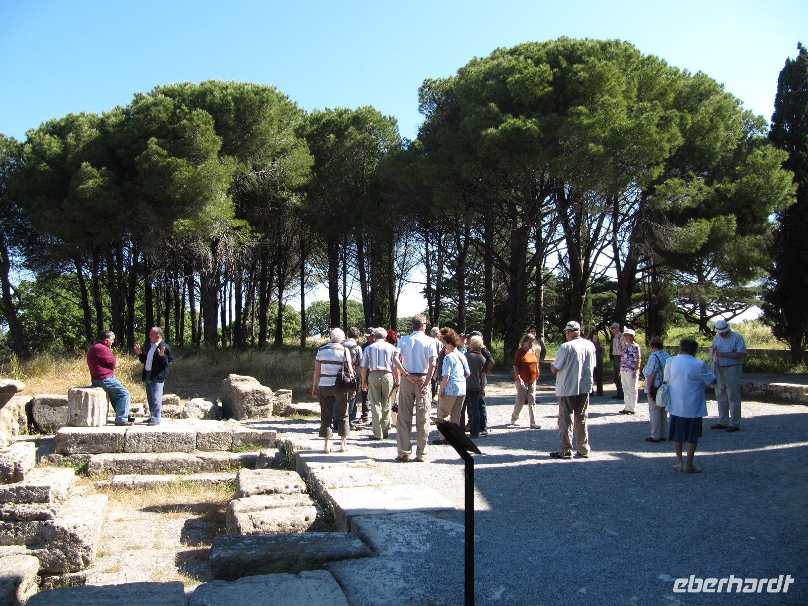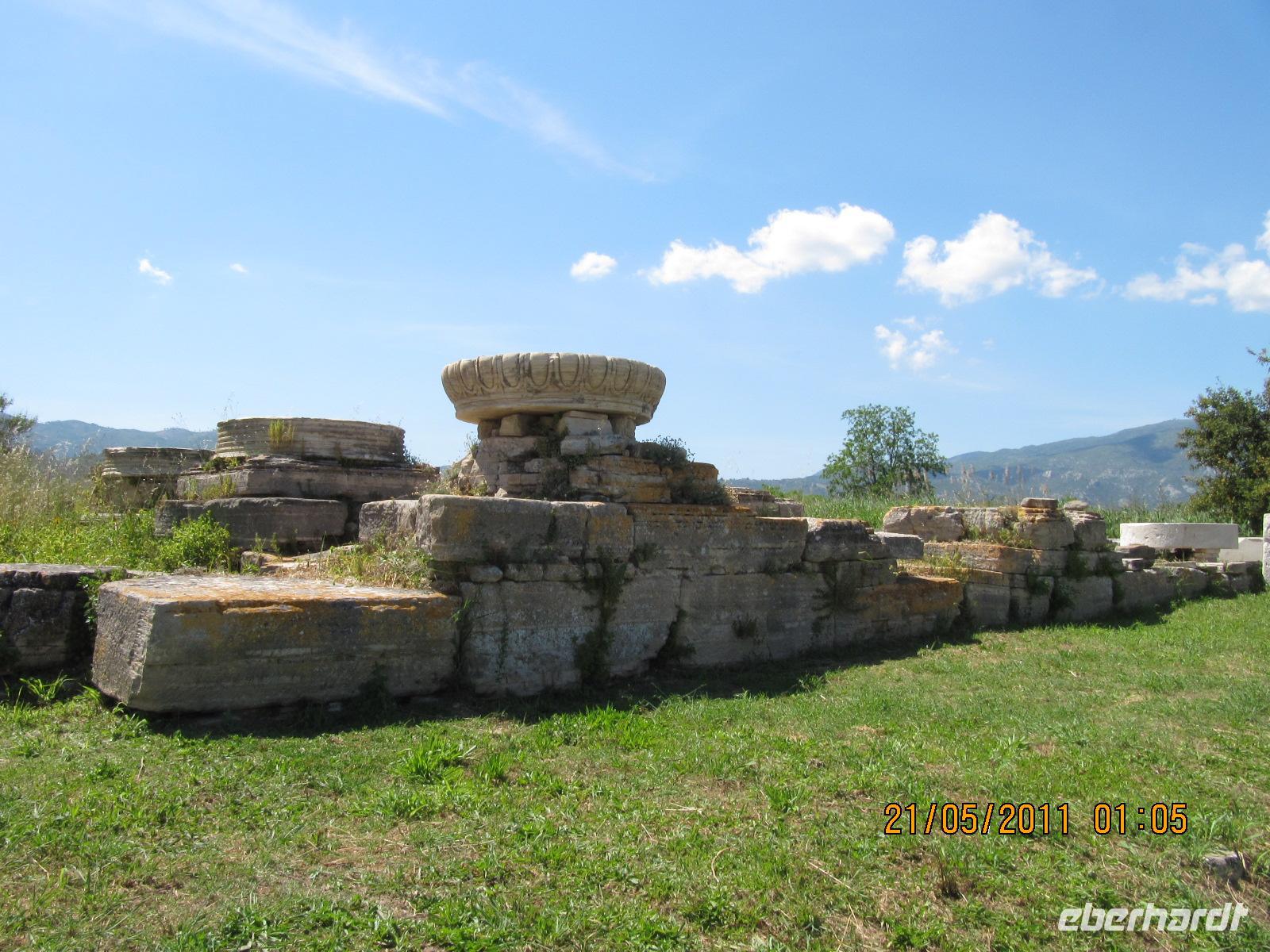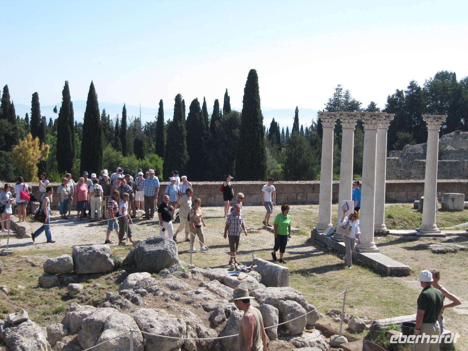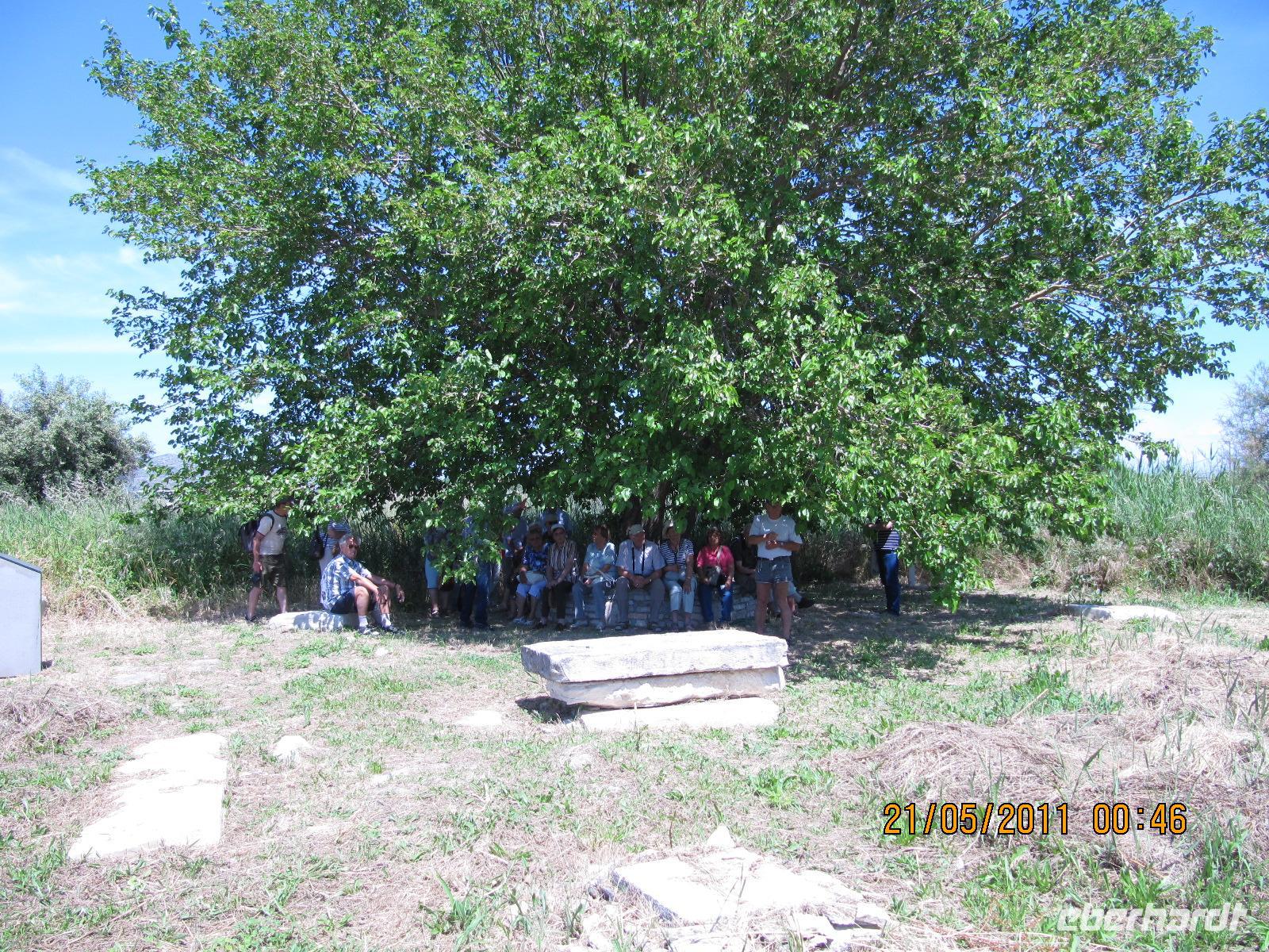 Platz nehmen. Auf der Fahrt sehen wir stets zu unserer Rechten die türkische Küste, aber wir fahren auch mit flotten 50 km/h an vielen kleinen griechischen Inseln vorbei. Immer wieder sehen wir einzelne griechische Dörfer, die sich mit ihren weißen Häusern und Kirchen strahlend von der Küste abheben. Am Hafen von Samos werden wir erwartet. Während unser Gepäck zu dem Hotel gebracht wird, werden wir das Heraíon - die Ruinen der Hera - besichtigen. Entlang der fruchtbaren Ebene am südwestlichen Ende der Tigániou-Bucht erstreckt sich diese vorarchaische Kultstätte. Nach mythologischer Überlieferung wurde die Göttin Hera hier unter dem Lygosbaum geboren. Eine 6 kilometerlange heilige Straße verlief hier in der Blütezeit von Samos. Der Kult der Hera erreichte seinen kulturellen Höhepunkt im 6. Jh. v. Chr. Simeon versteht es sehr gut, durch präzise Erläuterung und Führung unsere Phantasie an diesem monumentalen Ort zu wecken. Uns werden allmählich die Ausmaße dieser Akropolis bewusst. Die Kólona, die letzte heute noch stehende Säule vom großen Hera-Tempel, lassen uns die Maße des Tempels erkennen. Der Tempel hatte einen Grundriss von 112 x 55 Metern, was der Fläche des Kölner Doms entspricht. Überwältigt von den Ausmaßen dieses antiken Heiligtums fahren wir zu unserem 3-Sterne-Hotel Zefiros Beach in Mykáli. Das schnuckelige Hotel wurde noch in diesem Jahr frisch renoviert. Wir gehören zu den ersten Gruppen, die Leben in die wunderschöne Anlage bringen. Es ist hier sehr ruhig und der Strand ist wunderschön. In nur 1,2 km Entfernung sehen wir die türkische bergige Küste. Am Strand oder wahlweise bei einem gemütlichen Spaziergang können wir unsere Seele baumeln lassen. Zum Abendessen treffen wir uns um 19 Uhr im Restaurant des Hotels. Der Wirt hat uns eine schöne lange Tafel zusammengestellt. So können wir unseren Abend bei einem köstlichen Samoswein und wunderbarem Buffet verbringen.