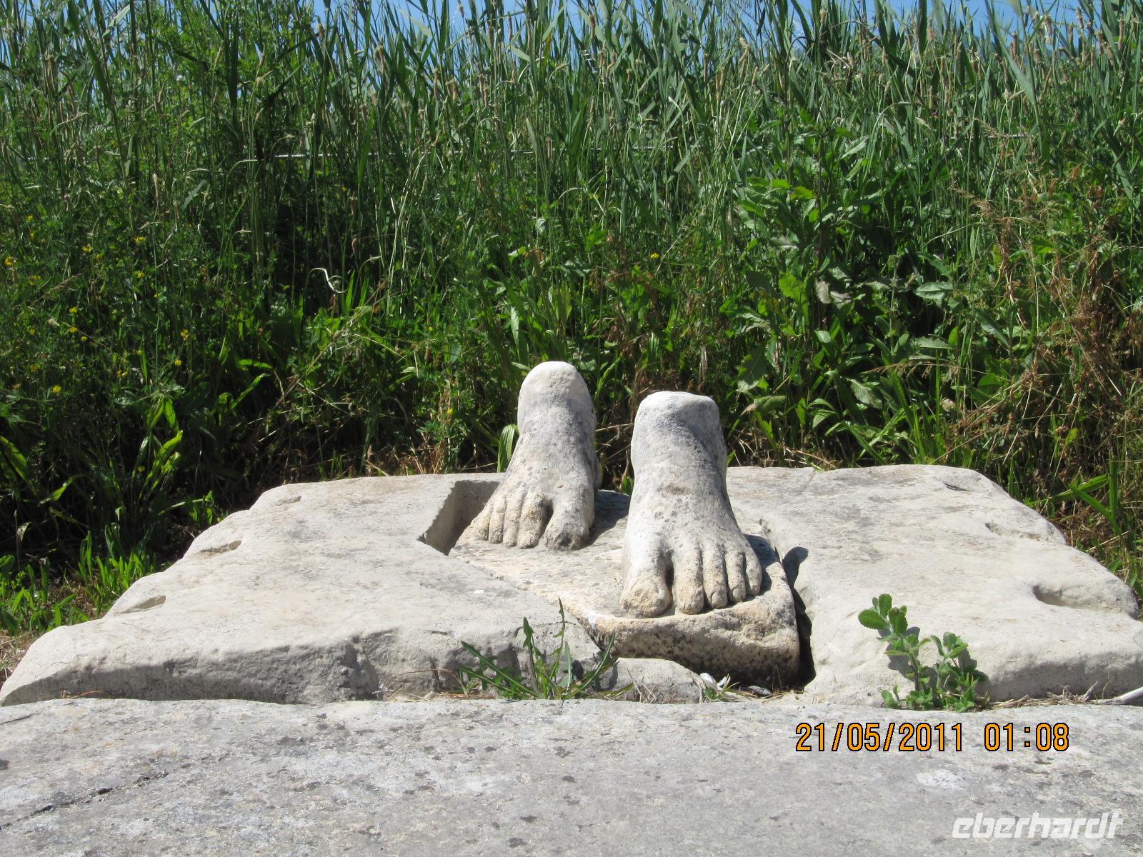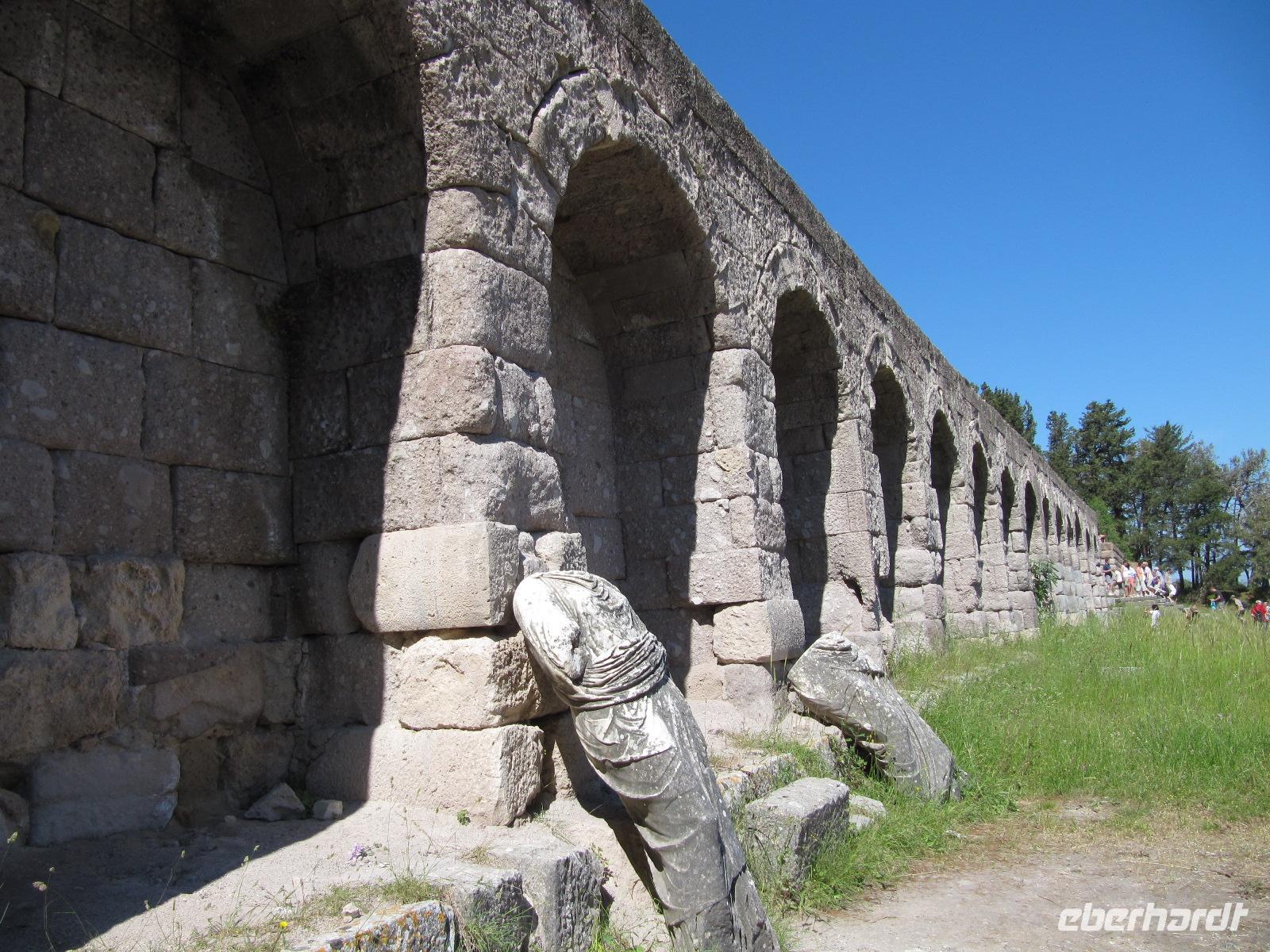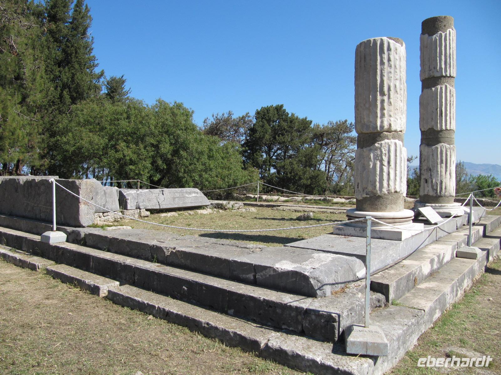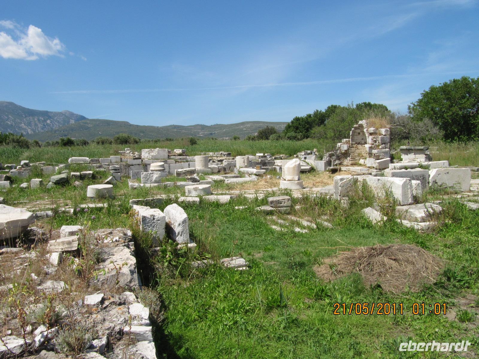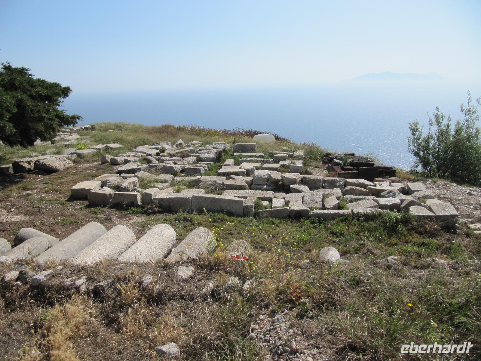 Platz nehmen. Auf der Fahrt sehen wir stets zu unserer Rechten die türkische Küste, aber wir fahren auch mit flotten 50 km/h an vielen kleinen griechischen Inseln vorbei. Immer wieder sehen wir einzelne griechische Dörfer, die sich mit ihren weißen Häusern und Kirchen strahlend von der Küste abheben. Am Hafen von Samos werden wir erwartet. Während unser Gepäck zu dem Hotel gebracht wird, werden wir das Heraíon - die Ruinen der Hera - besichtigen. Entlang der fruchtbaren Ebene am südwestlichen Ende der Tigániou-Bucht erstreckt sich diese vorarchaische Kultstätte. Nach mythologischer Überlieferung wurde die Göttin Hera hier unter dem Lygosbaum geboren. Eine 6 kilometerlange heilige Straße verlief hier in der Blütezeit von Samos. Der Kult der Hera erreichte seinen kulturellen Höhepunkt im 6. Jh. v. Chr. Simeon versteht es sehr gut, durch präzise Erläuterung und Führung unsere Phantasie an diesem monumentalen Ort zu wecken. Uns werden allmählich die Ausmaße dieser Akropolis bewusst. Die Kólona, die letzte heute noch stehende Säule vom großen Hera-Tempel, lassen uns die Maße des Tempels erkennen. Der Tempel hatte einen Grundriss von 112 x 55 Metern, was der Fläche des Kölner Doms entspricht. Überwältigt von den Ausmaßen dieses antiken Heiligtums fahren wir zu unserem 3-Sterne-Hotel Zefiros Beach in Mykáli. Das schnuckelige Hotel wurde noch in diesem Jahr frisch renoviert. Wir gehören zu den ersten Gruppen, die Leben in die wunderschöne Anlage bringen. Es ist hier sehr ruhig und der Strand ist wunderschön. In nur 1,2 km Entfernung sehen wir die türkische bergige Küste. Am Strand oder wahlweise bei einem gemütlichen Spaziergang können wir unsere Seele baumeln lassen. Zum Abendessen treffen wir uns um 19 Uhr im Restaurant des Hotels. Der Wirt hat uns eine schöne lange Tafel zusammengestellt. So können wir unseren Abend bei einem köstlichen Samoswein und wunderbarem Buffet verbringen.