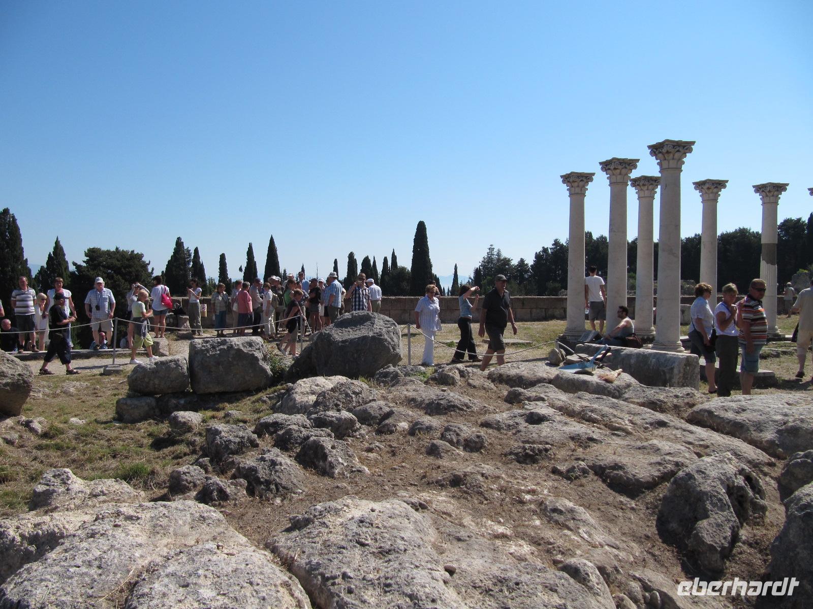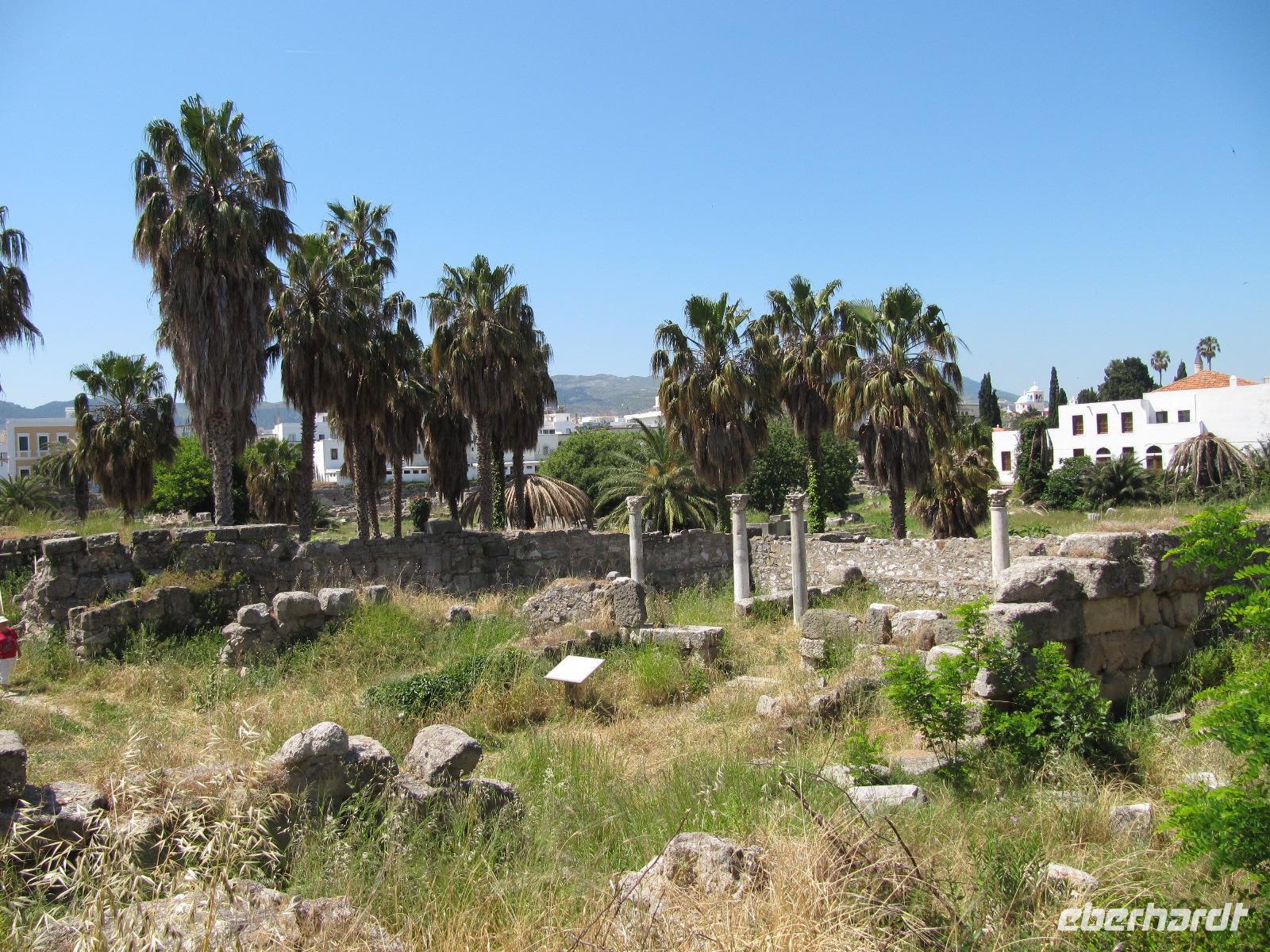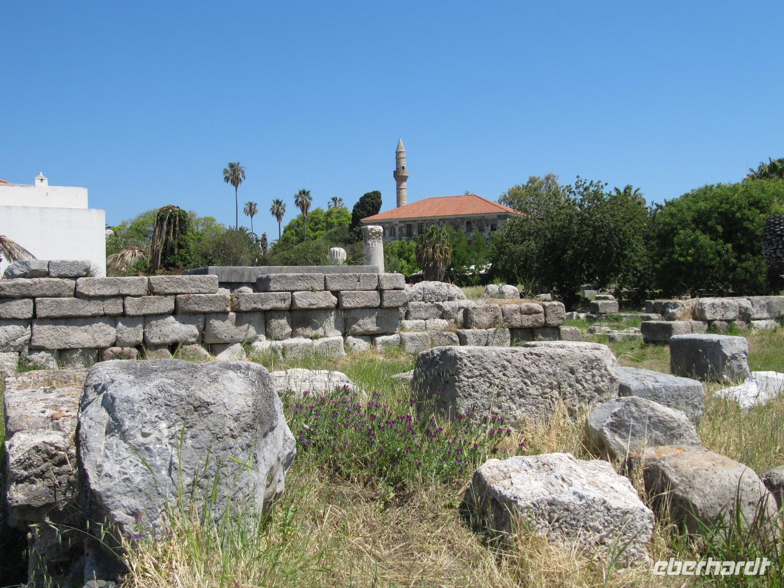 Wir setzen heute unsere Reise nach Kos fort. In einem großen Katamaran fahren wir, immer die türkische Küste zu unserer Rechten, zur drittgrößten Insel des Dodekanes, die nordwestlich von Rhodos liegt. Die Fährüberfahrt ist ein wirkliches Highlight, da sind wir uns einig. Wir fahren in den Hafen von Kos am späten Nachmittag ein und besichtigen die Stadt. In Kos-Stadt lässt sich beeindruckend die Geschichte der griechischen Welt erkennen. Hinter den Ruinen der Agora ragt die Chatze-Hassan-Moschee auf und prägt das Stadtbild. Die Ausgrabungen der Agora sind weitläufig und an vielen Stellen beeindruckend gut erhalten. Wir sehen unter anderem den Dionysos-Tempel (3. Jh. v. Chr.), das Haus der Europa (2.Jh. v. Chr.), aber auch römische Thermen (3. Jh. n. Chr.). Wir gehen weiter in die quirlige Stadt. Am Hauptplatz sehen wir die schöne Moschee und die verlockende Markthalle, wo wir die Möglichkeit haben Honig, Gebäck und Gewürze, aber auch Seifen, Schwämme und vieles mehr zu kaufen. Nachdem wir noch ausreichend Zeit haben den Stadtkern zu besichtigen, treffen wir uns und fahren zu unserem 4-Sterne-Hotel Platanista in Psalidi. Der