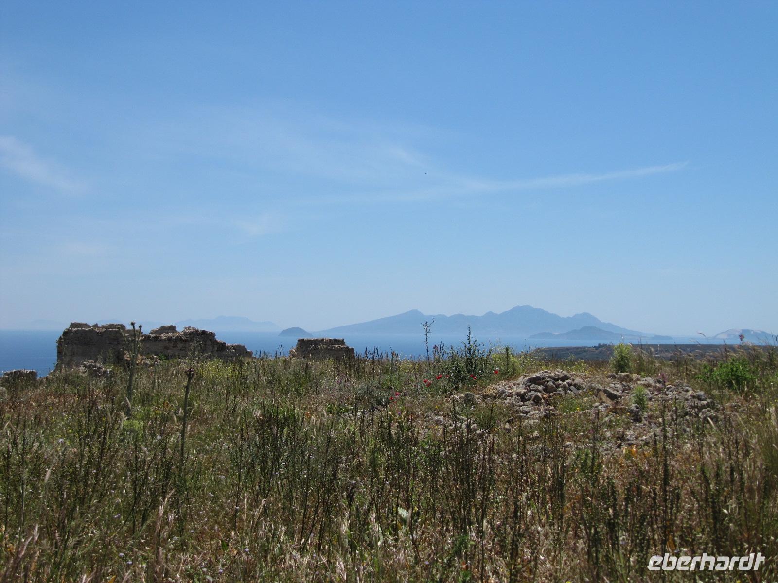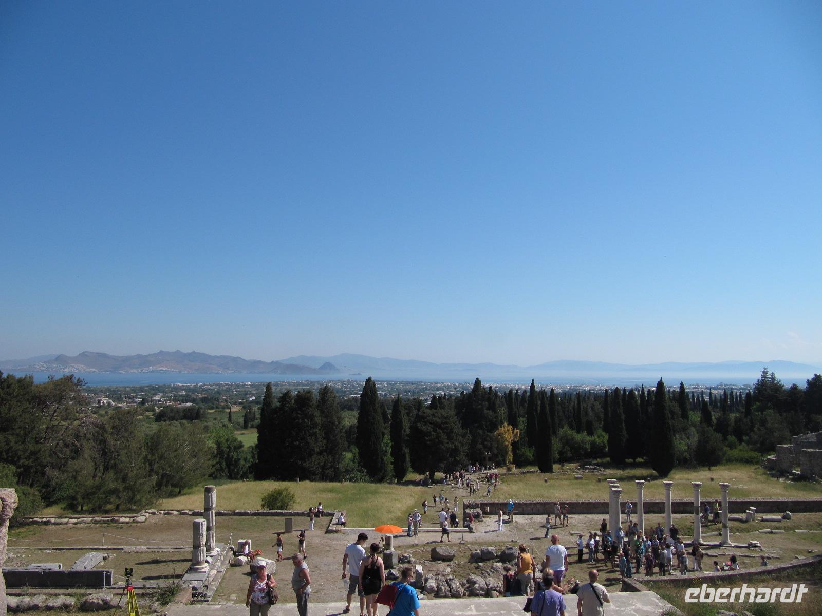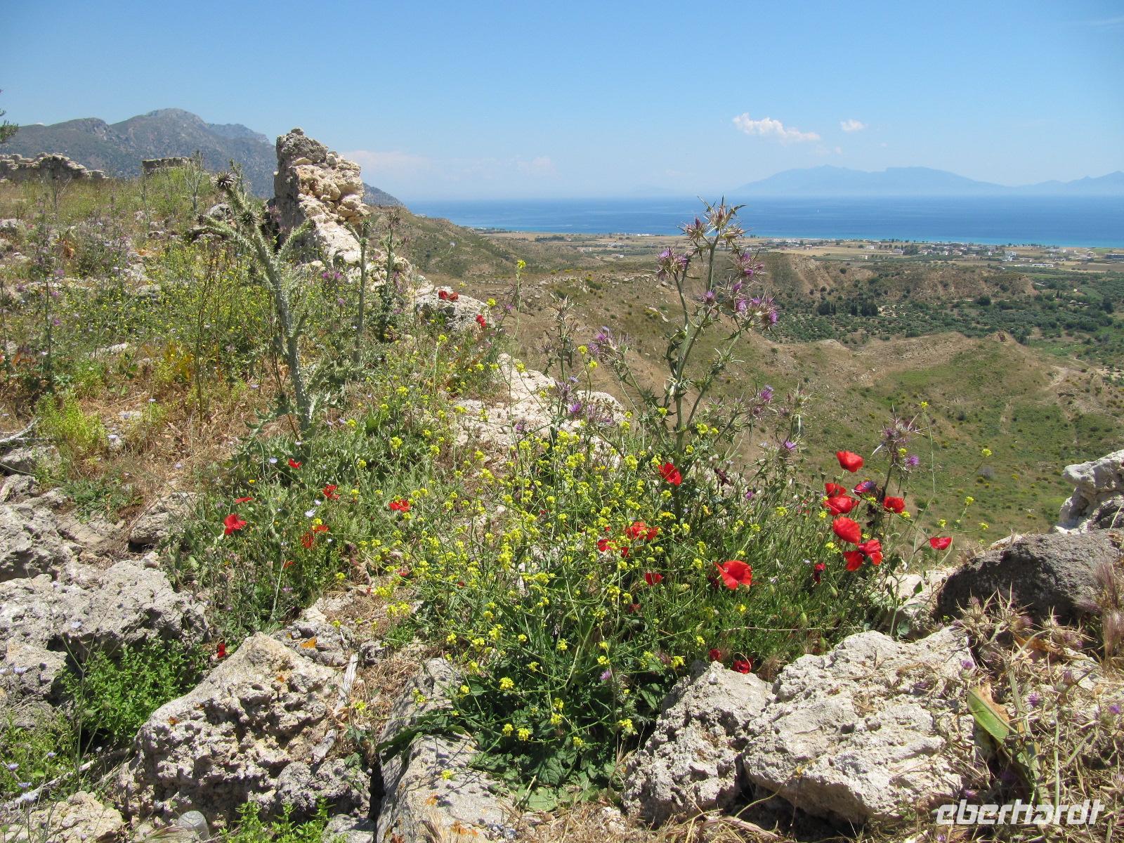 Mit einem höchst schmackhaften und abwechslungsreichen Frühstück beginnen wir unseren Tag. Besonders lecker finden wir die frisch zubereiteten Pfannkuchen. Heute brechen wir auf, um uns von Simeon die Insel zeigen zu lassen. Kos ist wie Rhodos ebenfalls bergig. Ein Kreidekalkrücken durchzieht die Insel von Ost nach West. Die Vegetation ist üppig und steht in Blüte. Wir fahren nach Westen zum Asklepieion, der