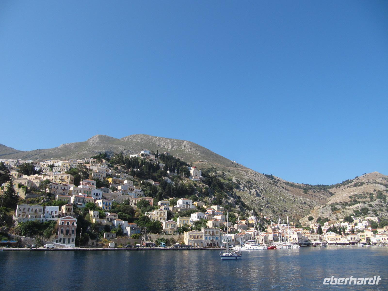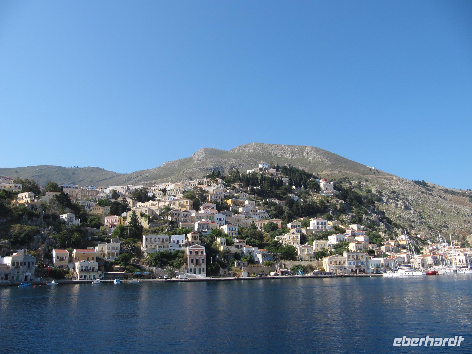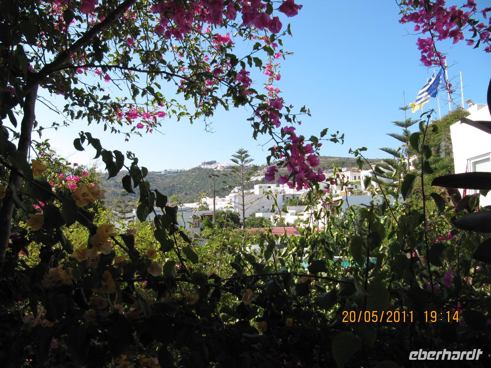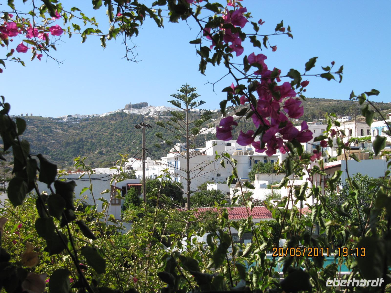 ist. Man kann die Stadt am Hügel ruhen sehen und das rege Treiben am Hafen beobachten. Am späten Vormittag fahren wir mit dem Katamaran der Dodekanisos Seaways, der Pride Dodekanisos, nach Patmos. An Deck ist es sehr windig, da wir mit über 50 km/h durch die griechische Inselwelt fahren. Vorbei führt uns heute die Fahrt an unterschiedlichen Inselgruppen. Wir machen Zwischenhalt an den Häfen von Kálimos, Léros und Lipsós. Im Hafen von Skála, der Inselhauptstadt, legen wir an und werden für unseren Koffertransfer erwartet. Ein gemächliches, christlich-orthodoxes Leben dominiert die Stimmung der Insel. Neben dem Fähranleger sehen wir Fischerbote und dahinter den Jachthafen. Unser Hotel erreichen wir in wenigen Gehminuten und unser Gepäck erwartet uns bereits, sodass wir rasch unsere Zimmer beziehen können. Wir erfreuen uns an der prächtigen Blütenpracht der Boganvillen, welche unsere Balkone umranken. Hibiskus und Jasmin verströmen einen herrlichen Duft im Innenhof unseres Hotels. Den Nachmittag haben wir zur freien Verfügung. Wir schlendern in aller Ruhe durch die schmalen Gassen der Stadt und erfreuen uns an dem reichen Angebot griechischer Tavernen und Cafés. Da es heute wieder schön warm ist, nutzen wir die Gelegenheit am nahen Strand oder in unserem Hotelpool zu baden. Erholt und mit Appetit treffen wir uns am Abend, um in einer griechischen Taverne zu schlemmen. Bei Wein und Wasser inklusive genießen wir unser 3-Gänge-Menü. Wir bekommen griechischen Salat, anschließend diverse Vorspeisen und als Hauptgang gegrillte Brasse serviert. Abgerundet wird das Mahl mit Sahnepudding und Schokoladensauce.