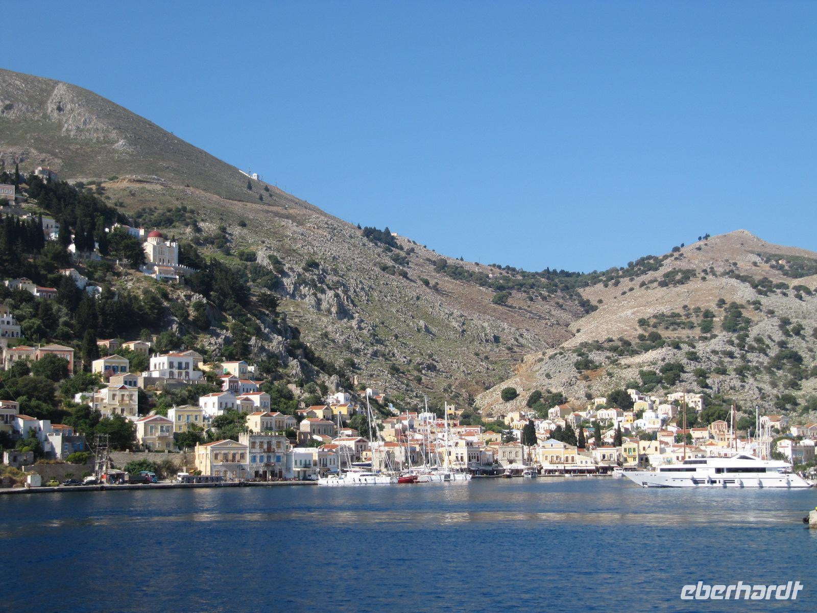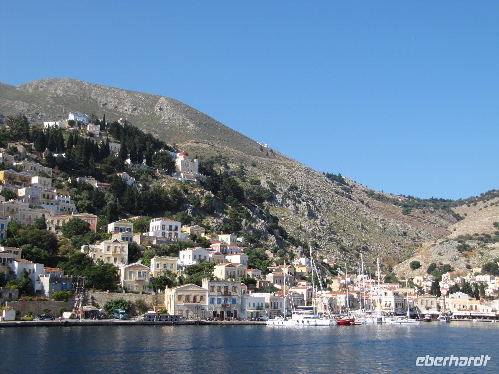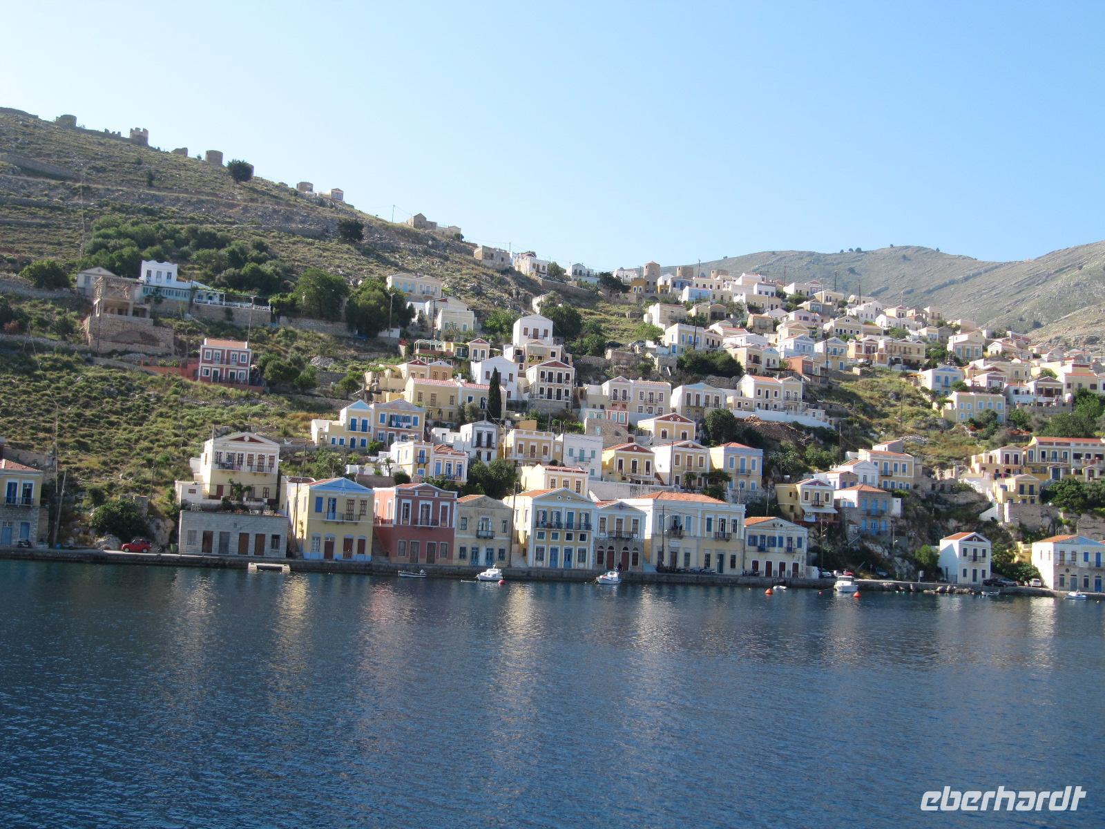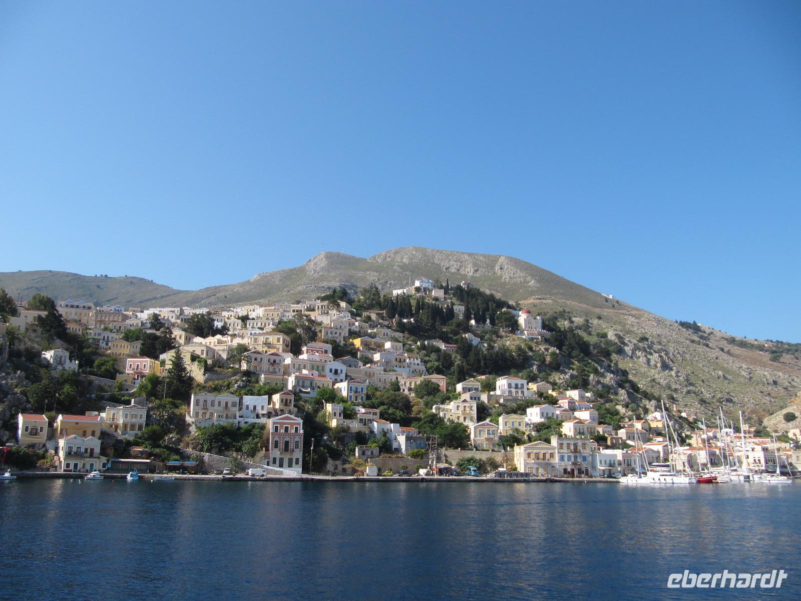 ist. Man kann die Stadt am Hügel ruhen sehen und das rege Treiben am Hafen beobachten. Am späten Vormittag fahren wir mit dem Katamaran der Dodekanisos Seaways, der Pride Dodekanisos, nach Patmos. An Deck ist es sehr windig, da wir mit über 50 km/h durch die griechische Inselwelt fahren. Vorbei führt uns heute die Fahrt an unterschiedlichen Inselgruppen. Wir machen Zwischenhalt an den Häfen von Kálimos, Léros und Lipsós. Im Hafen von Skála, der Inselhauptstadt, legen wir an und werden für unseren Koffertransfer erwartet. Ein gemächliches, christlich-orthodoxes Leben dominiert die Stimmung der Insel. Neben dem Fähranleger sehen wir Fischerbote und dahinter den Jachthafen. Unser Hotel erreichen wir in wenigen Gehminuten und unser Gepäck erwartet uns bereits, sodass wir rasch unsere Zimmer beziehen können. Wir erfreuen uns an der prächtigen Blütenpracht der Boganvillen, welche unsere Balkone umranken. Hibiskus und Jasmin verströmen einen herrlichen Duft im Innenhof unseres Hotels. Den Nachmittag haben wir zur freien Verfügung. Wir schlendern in aller Ruhe durch die schmalen Gassen der Stadt und erfreuen uns an dem reichen Angebot griechischer Tavernen und Cafés. Da es heute wieder schön warm ist, nutzen wir die Gelegenheit am nahen Strand oder in unserem Hotelpool zu baden. Erholt und mit Appetit treffen wir uns am Abend, um in einer griechischen Taverne zu schlemmen. Bei Wein und Wasser inklusive genießen wir unser 3-Gänge-Menü. Wir bekommen griechischen Salat, anschließend diverse Vorspeisen und als Hauptgang gegrillte Brasse serviert. Abgerundet wird das Mahl mit Sahnepudding und Schokoladensauce.