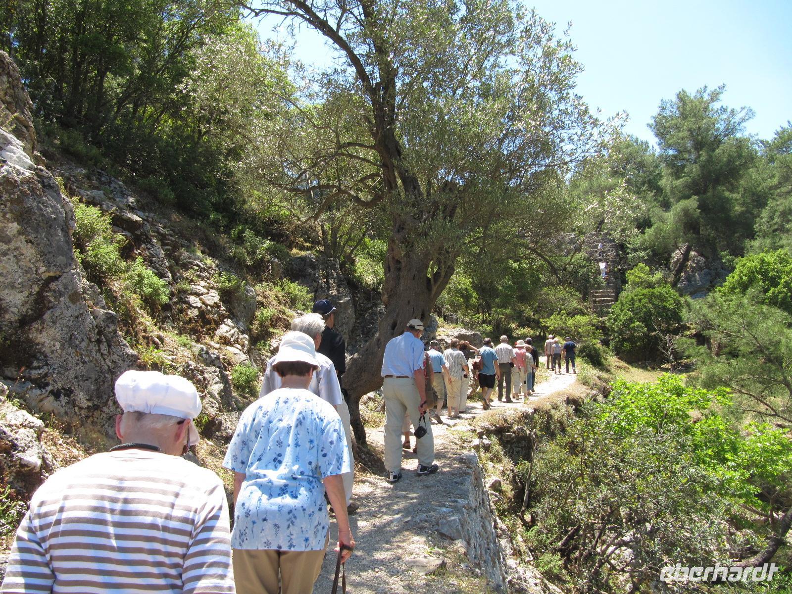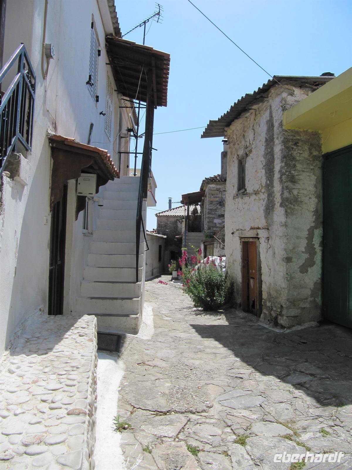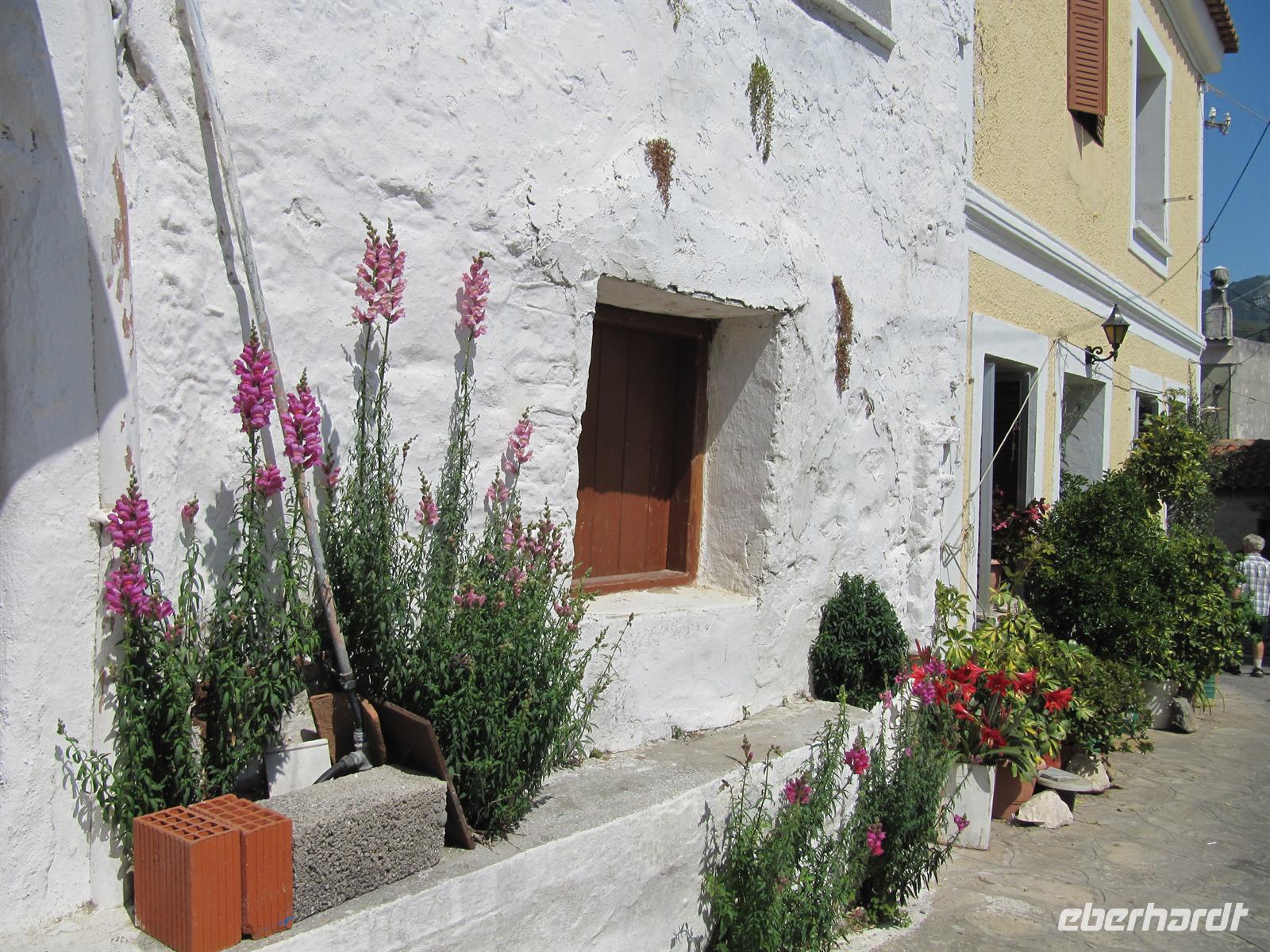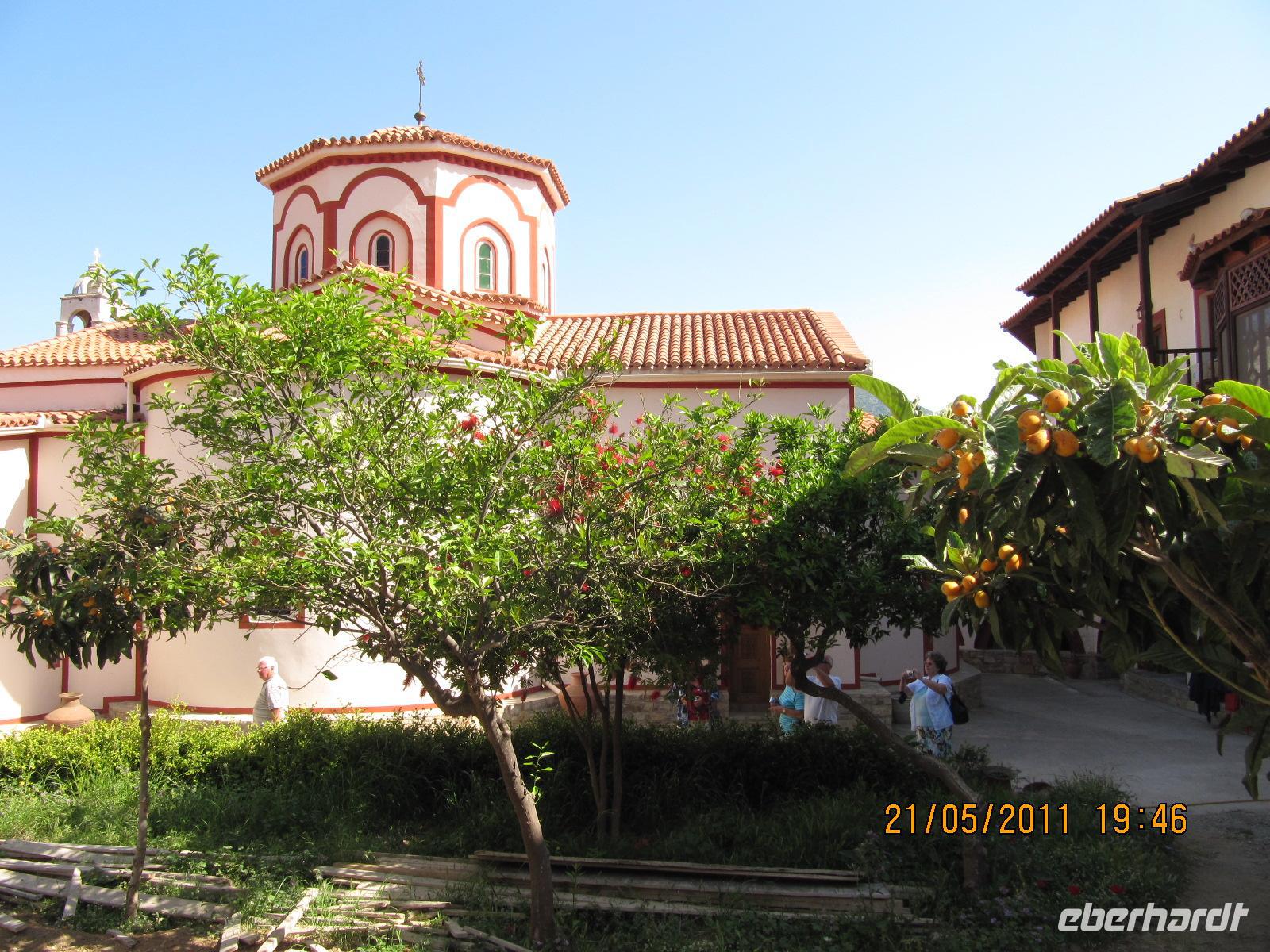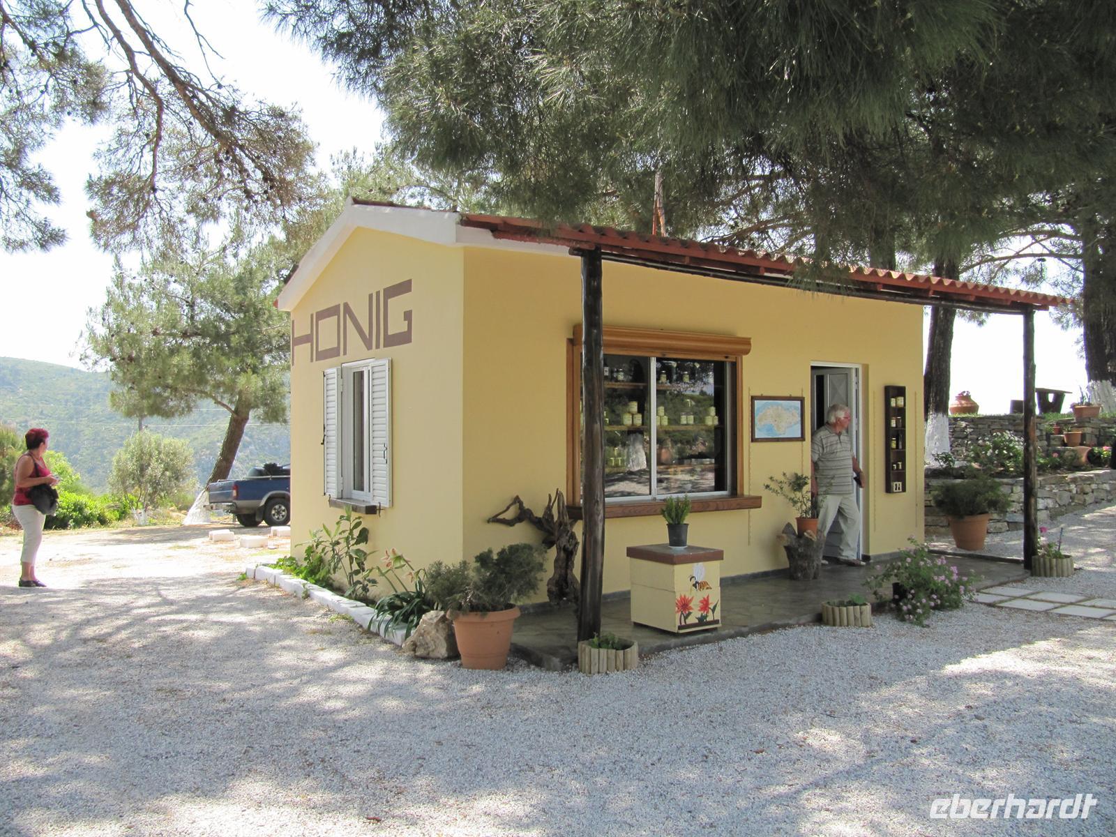 süd-östlichen Teil der Insel. Hier ist es fruchtbar. Wir fahren vorbei an Weinbergen und Olivenhainen, aber auch Obst- und Mandelbäumen. Die Blütezeit von Samos war die zweite Hälfte des 6. Jh. v. Chr. Die Samoaner waren ein Seevolk. Vor der kleinasiatischen Küste gelegen konnte Samos zur Blütezeit Überlieferungen zufolge 100 Schiffe ständig für das Gefecht bereithalten. Über Serpentinen erreichen wir das Kloster des Heiligen Kreuzes. Doch leider haben die Mönche wohl heute verschlafen und daher fahren wir alternativ zum Panagia Kloster. Es ist eine sehr gut gepflegte und schön bepflanzte Anlage. Im Anschluss machen wir uns auf das kleine Dorf Pírgos zu besichtigen. Schmale Gassen führen durch die Altstadt, die Häuser sind typisch weiß getüncht und hier und da sehen wir Griechen, die in aller Gelassenheit vor ihren Häusern oder in einer Gaststätte sitzen, Karten spielen und Kaffee trinken. Wir befinden uns auf 390 Metern, auf einem Bergsattel, der die Grenze zwischen Osten und Westen der Insel darstellt. Entlang des Bergrückens fahren wir weiter und legen eine kurze Rast in einer griechischen Taverne ein. Hier genießen wir im Schatten der Bäume einen frisch gebrühten griechischen Kaffee. Von unseren Tischen aus haben wir eine prächtige Sicht über die Ebene. Unseren Tag setzen wir mit einer Honigverkostung jenseits jeglichen Trubels fort. Gereicht werden uns zunächst Kieferhonig und anschließend Pinienhonig. Neben dem Honig ist auch die Landschaft ein wahres Erlebnis. Über