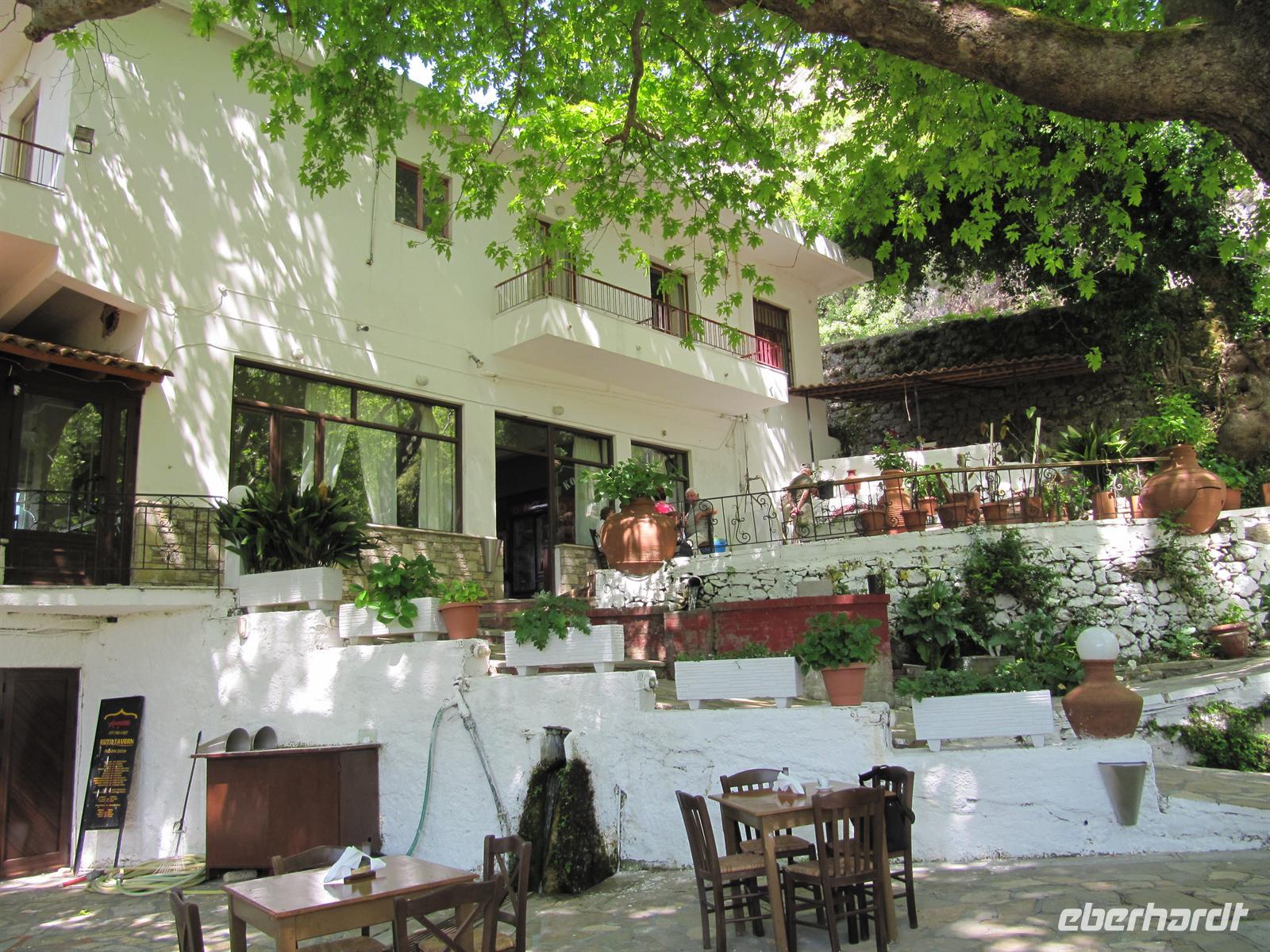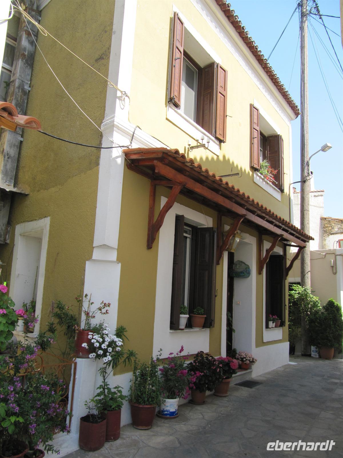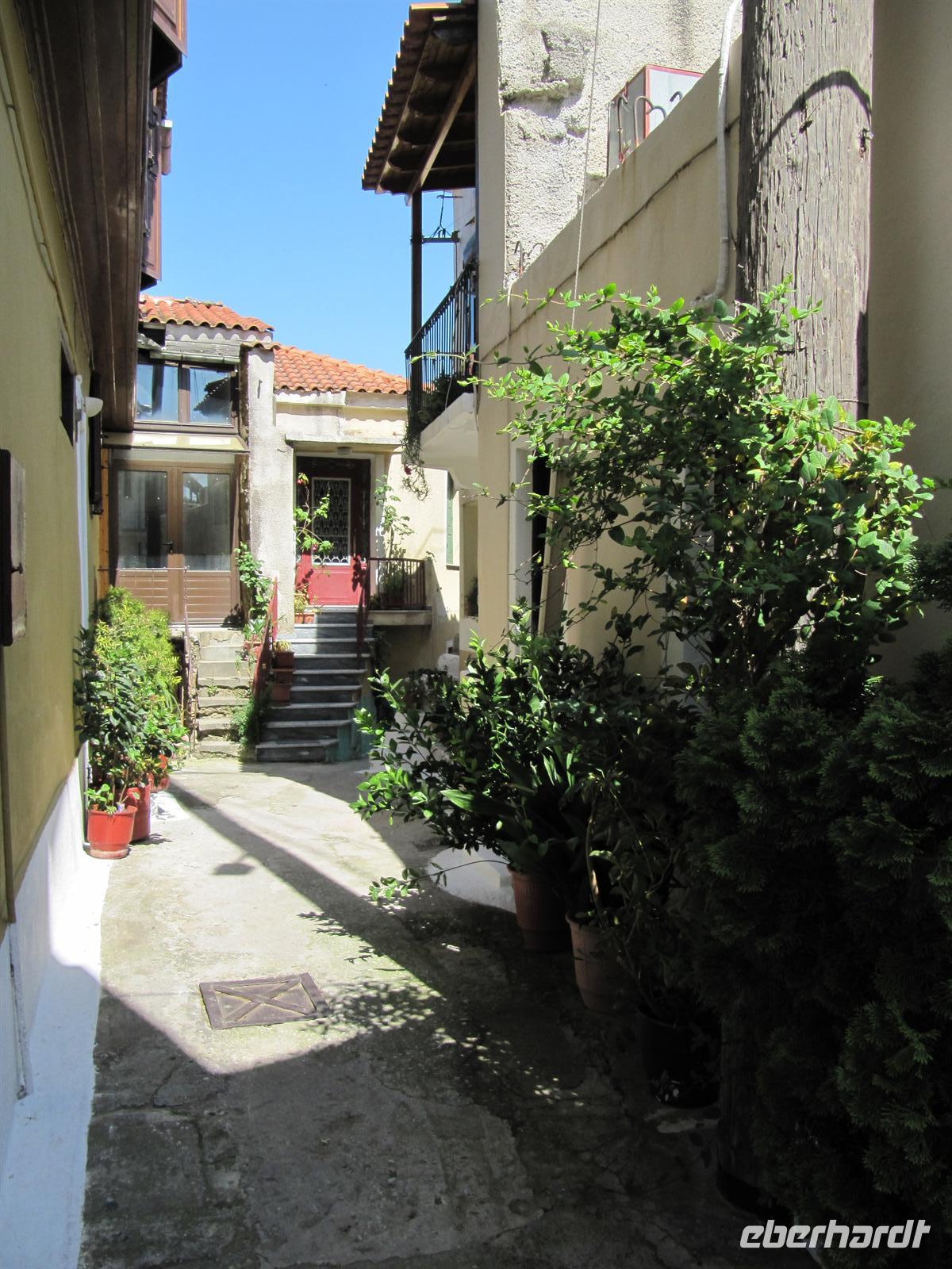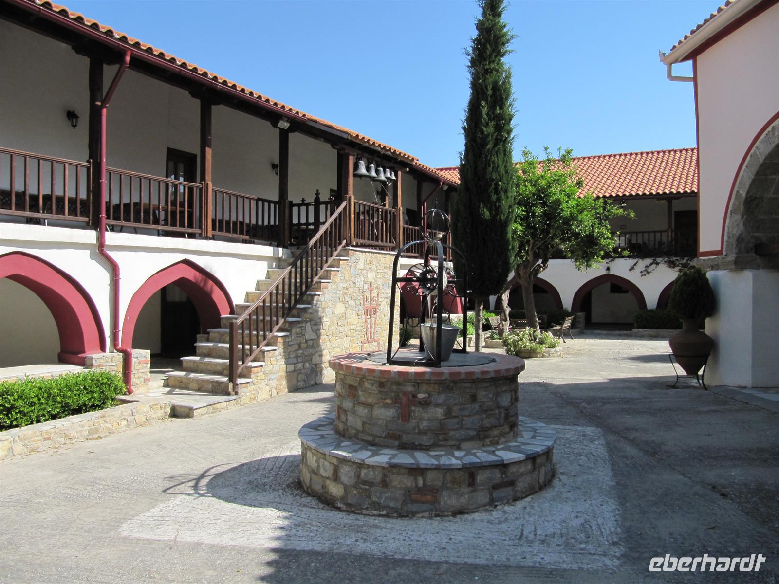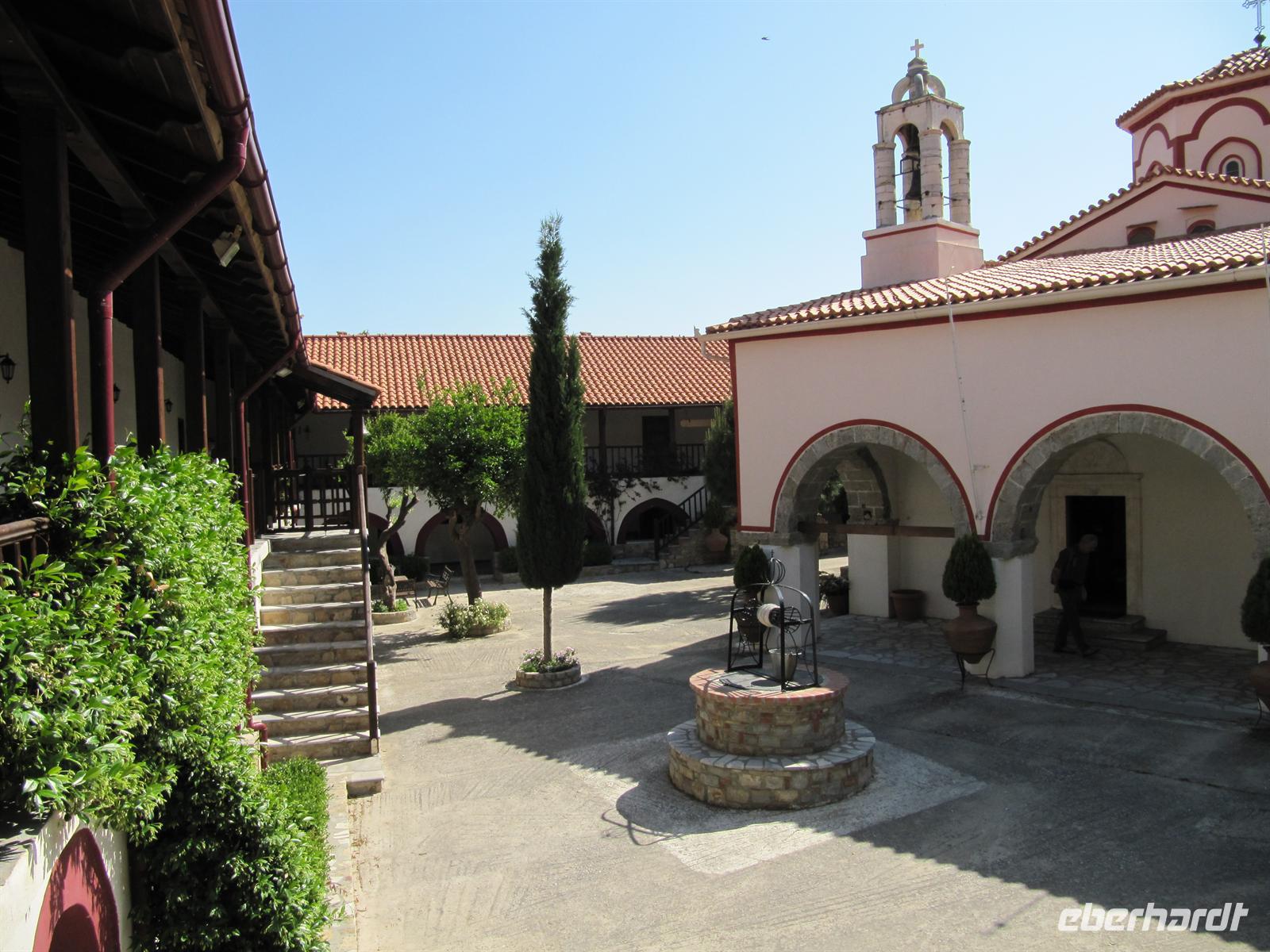 süd-östlichen Teil der Insel. Hier ist es fruchtbar. Wir fahren vorbei an Weinbergen und Olivenhainen, aber auch Obst- und Mandelbäumen. Die Blütezeit von Samos war die zweite Hälfte des 6. Jh. v. Chr. Die Samoaner waren ein Seevolk. Vor der kleinasiatischen Küste gelegen konnte Samos zur Blütezeit Überlieferungen zufolge 100 Schiffe ständig für das Gefecht bereithalten. Über Serpentinen erreichen wir das Kloster des Heiligen Kreuzes. Doch leider haben die Mönche wohl heute verschlafen und daher fahren wir alternativ zum Panagia Kloster. Es ist eine sehr gut gepflegte und schön bepflanzte Anlage. Im Anschluss machen wir uns auf das kleine Dorf Pírgos zu besichtigen. Schmale Gassen führen durch die Altstadt, die Häuser sind typisch weiß getüncht und hier und da sehen wir Griechen, die in aller Gelassenheit vor ihren Häusern oder in einer Gaststätte sitzen, Karten spielen und Kaffee trinken. Wir befinden uns auf 390 Metern, auf einem Bergsattel, der die Grenze zwischen Osten und Westen der Insel darstellt. Entlang des Bergrückens fahren wir weiter und legen eine kurze Rast in einer griechischen Taverne ein. Hier genießen wir im Schatten der Bäume einen frisch gebrühten griechischen Kaffee. Von unseren Tischen aus haben wir eine prächtige Sicht über die Ebene. Unseren Tag setzen wir mit einer Honigverkostung jenseits jeglichen Trubels fort. Gereicht werden uns zunächst Kieferhonig und anschließend Pinienhonig. Neben dem Honig ist auch die Landschaft ein wahres Erlebnis. Über