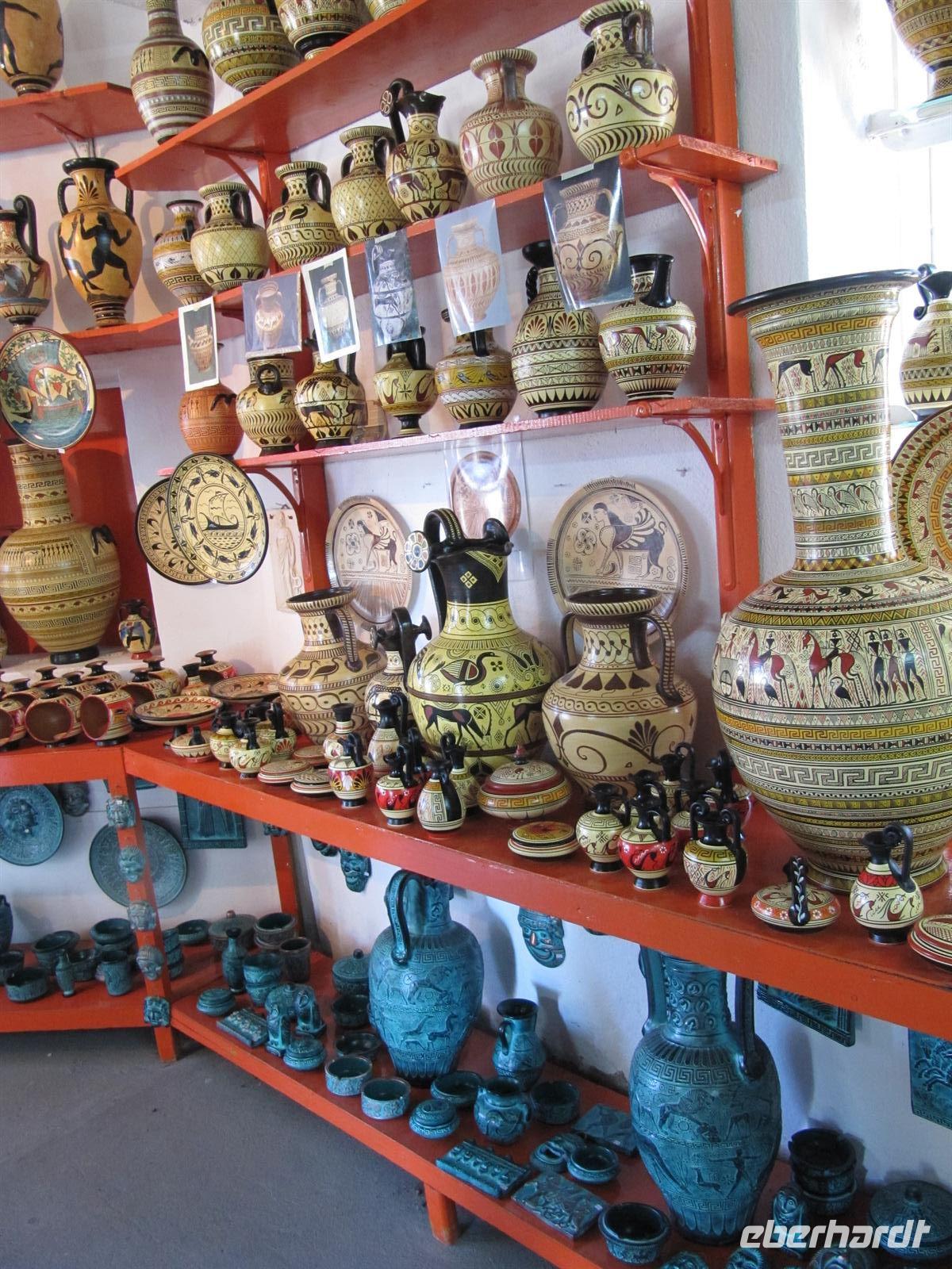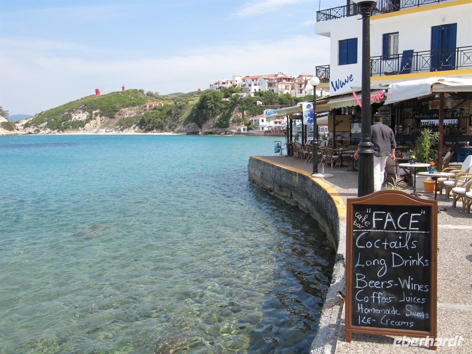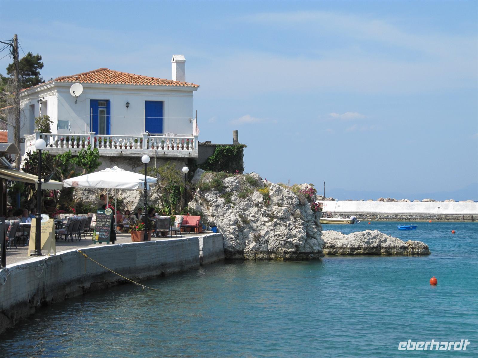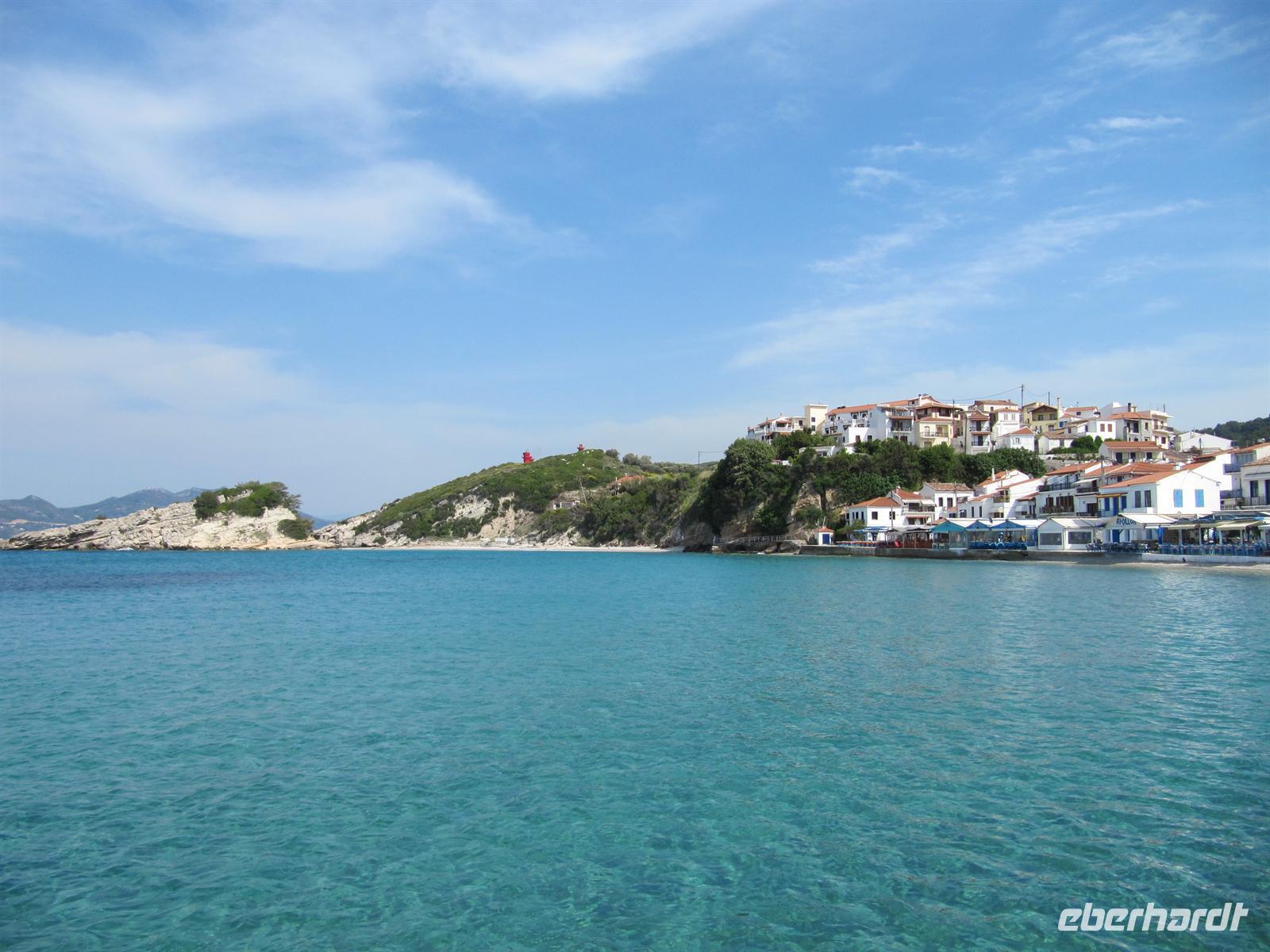 Weinberge, Olivenhaine und bunte Blumenwiesen haben wir einen fantastischen Blick auf die Küste. Weiter führt uns der Tagesverlauf nach Karlóvassi, wo wir einer Keramikwerkstatt einen Besuch abstatten. Eine Handwerkerin zeigt uns ihr Geschick und töpfert vor uns zunächst einen Pythagorasbecher und anschließend einen Serviettenhalter. Der Pythagorasbecher ist typisch auf Samos. Dieser Becher leert sich schlagartig, wenn er über ein gewisses Maß gefüllt wird. Er soll für Gerechtigkeit sorgen und uns lehren mit Maß zu trinken. Zu Mittag essen wir heute in der familiär geführten Fischtaverne in Potamí. Bei einem Gläschen Weißwein lassen wir es uns in aller Ruhe schmecken. Gut gestärkt starten wir in den Nachmittag. Simeon möchte uns gerne Kokkári zeigen, wie er selber sagt einer der schönsten Orte des ägäischen Meeres! Wir finden, dass unser lieber Reiseleiter Recht hat, Kokkári ist wirklich unvergleichbar schön. Hier verbringen wir einen wunderschönen Nachmittag und schlendern entlang der Hafenpromenade und durch schmale romantische Gassen. Die Strände sind hier himmlisch und der griechische Kaffee schmeckt bei solch einer schönen Aussicht auf den kleinen Hafen besonders gut! Träumend von all den schönen Erlebnissen unseres Sommertages auf Samos begeben wir uns zurück zu unserem Hotel. Wir kommen am späten Nachmittag an und haben noch ausreichend Zeit uns an den Strand zu legen. Hier vergisst man alle Sorgen und kann sich richtig entspannen. Den Abend lassen wir gemeinsam bei einem schmackhaften Abendessen im Restaurant des Hotels ausklinken.
