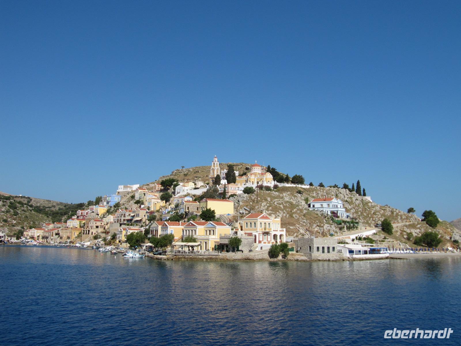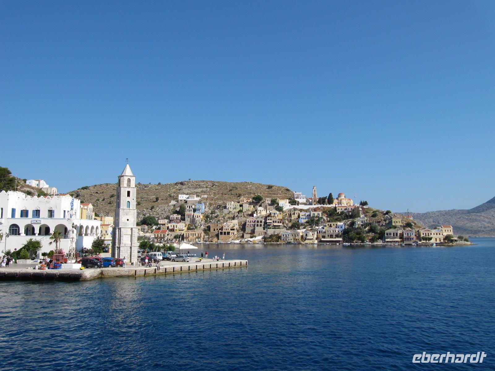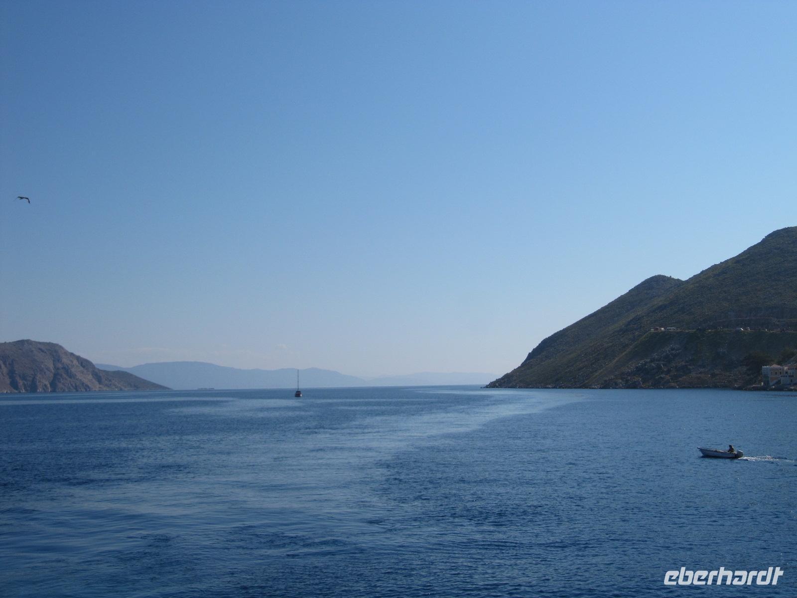Im aller Ruhe genießen wir das Frühstück im Hotel. Nachdem unsere Koffer abgeholt wurden, gehen wir gemeinsam am Hafen entlang zum Fähranleger. Wir warten auf unser Schiff, die Nissos Kalymnos und genießen noch einmal die Aussicht auf das azurblaue Meer und das am Berg aufragende Kloster. Auch heute ist wieder herrliches Wetter und so können wir uns während der Überfahrt an Deck sonnen oder in der Cafeteria des Bootes