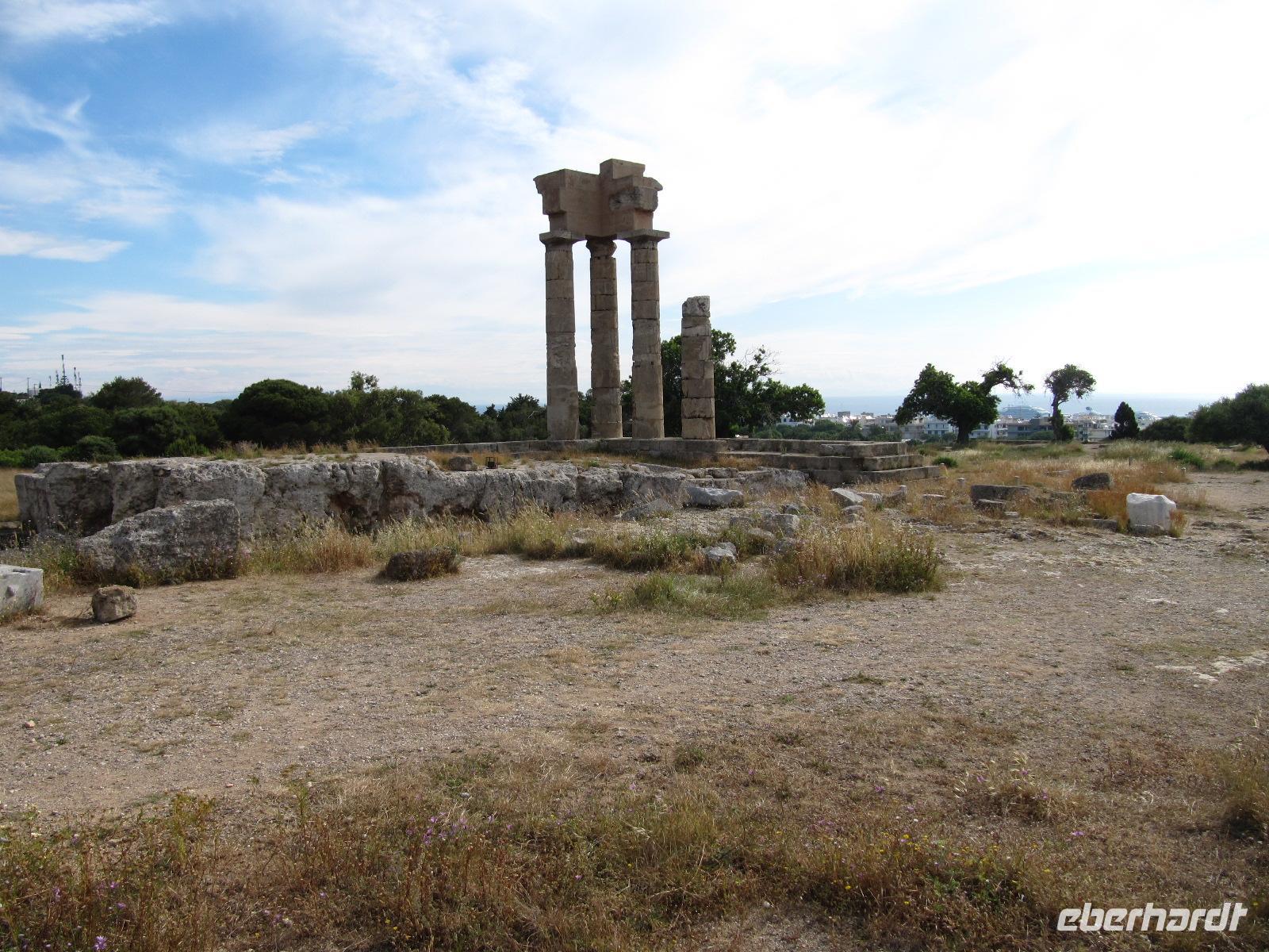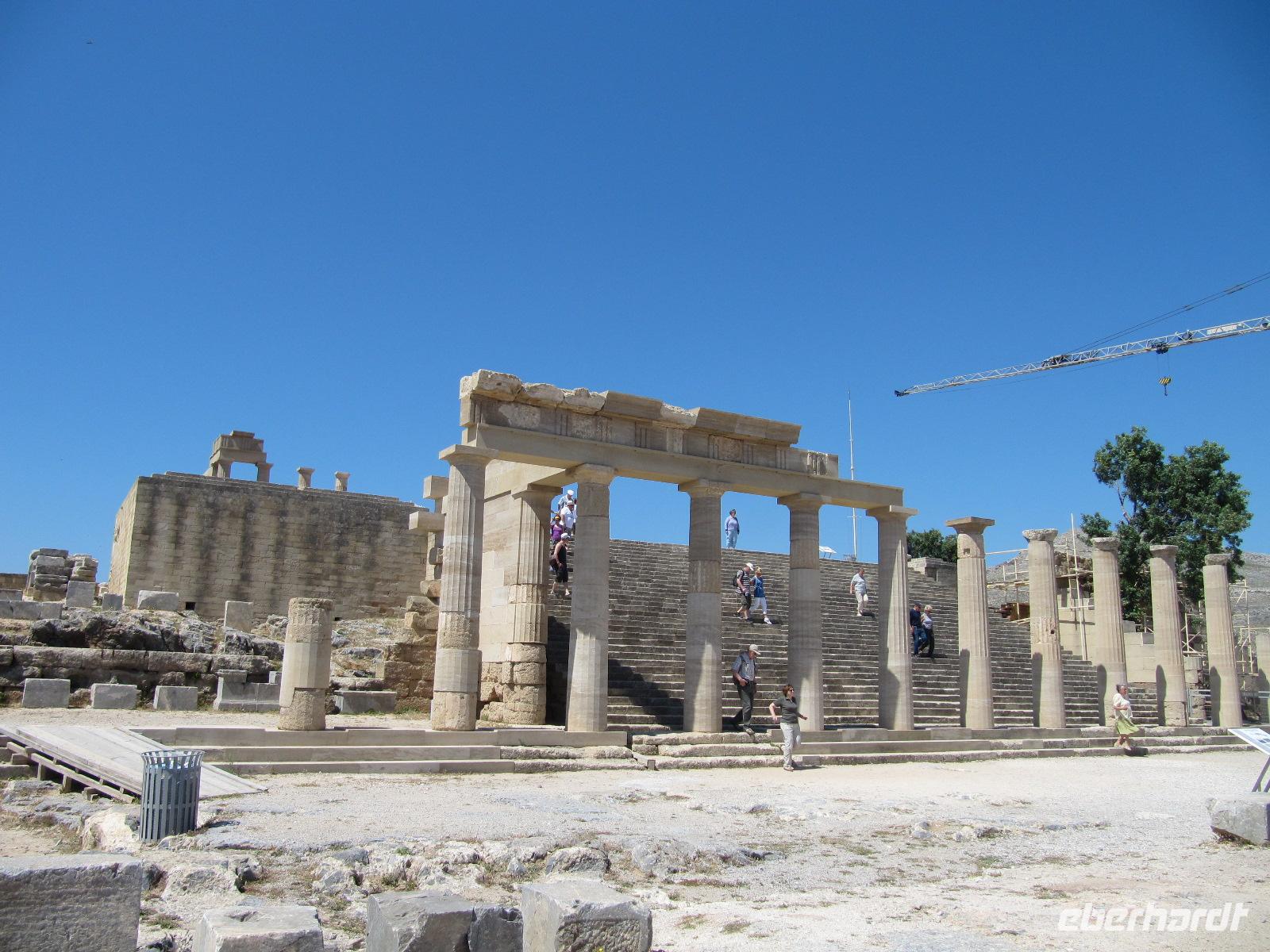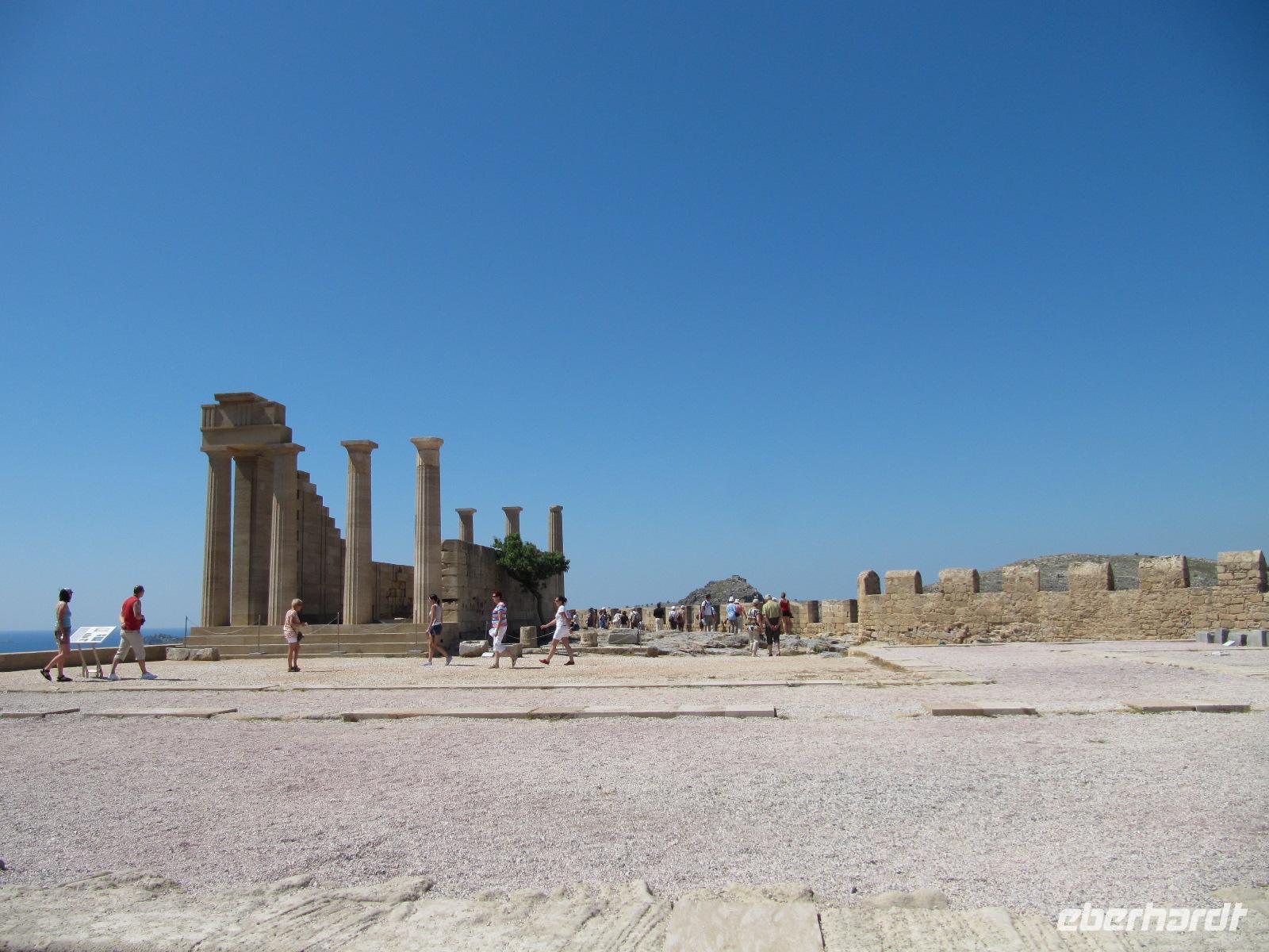 Frühstück im Restaurant. Unser heutiges Ausflugsziel ist der Monte Smith und anschließend die Stadt Rhodos. Wir bekommen einen ersten Eindruck von der Vielseitigkeit der Insel des Sonnengottes Helios. Neben malerischen Dörfern und gut erhaltenen archäologischen Ausgrabungsorten sehen wir Traumstrände und eine höchst abwechslungsreiche Landschaft. Simeon stellt uns mit Tiefgang und Herz sein Land vor. Die Inselwelt Griechenlands übt einen unvergesslichen Charme auf uns aus. Auf den Inseln der Ägäis herrscht eine eigene, unvergleichliche Atmosphäre. Ruhe und Gelassenheit dominieren den Alltag. Es gibt 3000 Inseln in Griechenland, von denen jedoch nur 140 bewohnt sind. Wir befinden uns auf den Dodekanes, den 12 Inseln im süd-östlichen ägäischen Meer. Kompetent von Simeon geführt fahren wir an der Westküste von Rhodos vorbei zu dem Monte Smith. Die Uferpromenade ist gesäumt von Hotels und Restaurants, denn dieser Teil von Rhodos war der erste, der in den 60er Jahren touristisch erschlossen wurde. Zunächst fahren wir gen Norden zur Akropolis. Wir wollen den Phytios-Apollon-Tempel besichtigen. Die Säulen des Tempels sind dorischen Stils und entsprechen so dem griechischen Ideal antiker Bauweise. Diese Säulen haben keine Basis und verjüngen sich nach oben. Wie der Großteil der griechischen Tempel ist auch dieser Ost-West orientiert. Das Haus Gottes zeigte einst im Westen das Kultbild Gottes. Der Altar jedoch befand sich außerhalb. Das griechische Ideal lässt sich, wie Simeon uns anschaulich berichtet, in der exakten architektonischen Planung und Bauweise des Tempels erkennen. Im alten Griechenland wurden Grundsätze und Lehren geschaffen, die bis heute andauern. Unter diesen die Kunst des Baus, die Architektur. Auf Papyrus legten Bauzeichner die präzisen Maße fest. Anschließend wurden die Baustücke mit hoher Präzision im Steinbruch geschnitten. An einigen gut erhaltene Säulen sehen wir noch heute, dass keine noch so kleinen Zwischenräume zwischen den Baustücken sind. Wir gehen weiter zur Sportbahn der Akropolis. Die antike griechische Erziehung hat ebenfalls das Ideal gesucht. Das heißt, dass der Mensch bestrebt war körperlich und geistig seine Mitte zu finden. Mit physischer und geistiger Erziehung wurde der griechische Demos zu den erstrebenswerten Tugenden der Tapferkeit, der Frömmigkeit und Gerechtigkeit herangezogen. Durch musikalische Erziehung wurde der Geist geschult, denn den Griechen war bewusst, dass durch ausschließlich physische Lehre der Mensch überheblich wurde, dem konnte nur durch geistige Erziehung entgegen gewirkt werden, um so das Maß der Mitte zu finden und den tugendhaften griechischen Geist zu formen. Das griechische Volk der Antike lebte in einer allumfassenden Konkurrenz und Bewertung. Sei es in kriegerischen Auseinandersetzungen oder in festlich veranstalteten Wettbewerben. Es wurden daher Wettkämpfe veranstaltet, sowohl in verschiedenen sportlichen Disziplinen aber auch bei musikalischen Festspielen. Wir lassen die Akropolis hinter uns und gehen weiter nach Rhodos-Stadt. Diese ist seit ihrer Gründung 408 v. Chr. Hauptstadt der Insel. Ursprünglich war die Stadt in einem rechtwinkligen Straßensystem angelegt. Die Stadt erstreckt sich von der Akropolishöhe im Westen bis zur östlichen Küste. Die bedeutend kleinere mittelalterliche Stadt folgt in einigen Straßenzügen ebenfalls dem antiken Vorbild. Eingeteilt war die Stadt einst in Bezirke, so den Bezirk der Ritter, im südlichen Teil, Burgus, von Griechen bewohnt, den Westteil, von den Türken bewohnt und letztlich den Ostteil, von Juden bewohnt. Zunächst zeigt uns Simeon das Kolachium, den Bezirk der Ritter mit Festung, Großmeisterpalast, Hospital und der alten Ritterstraße. Die 4 kilometerlange Stadtmauer (15./16. Jh.) umschließt diesen Bereich, der
