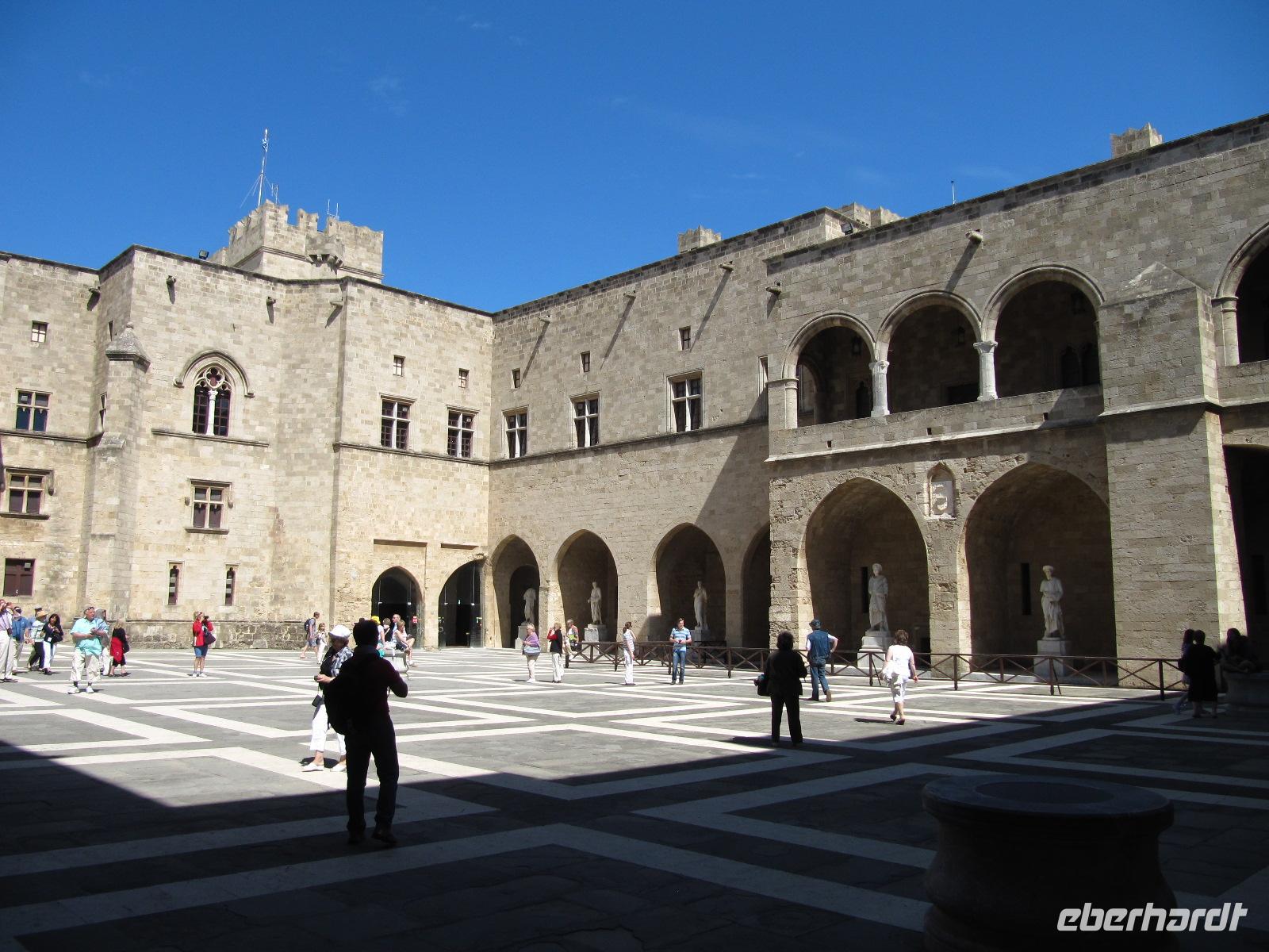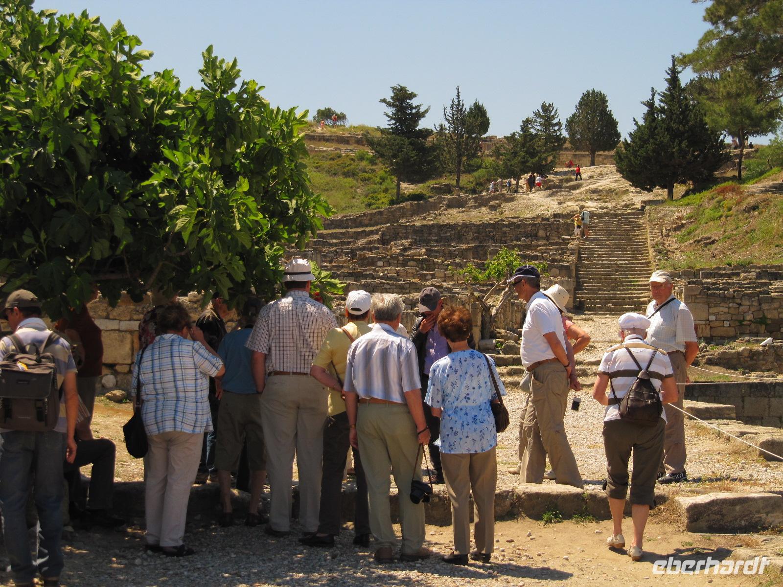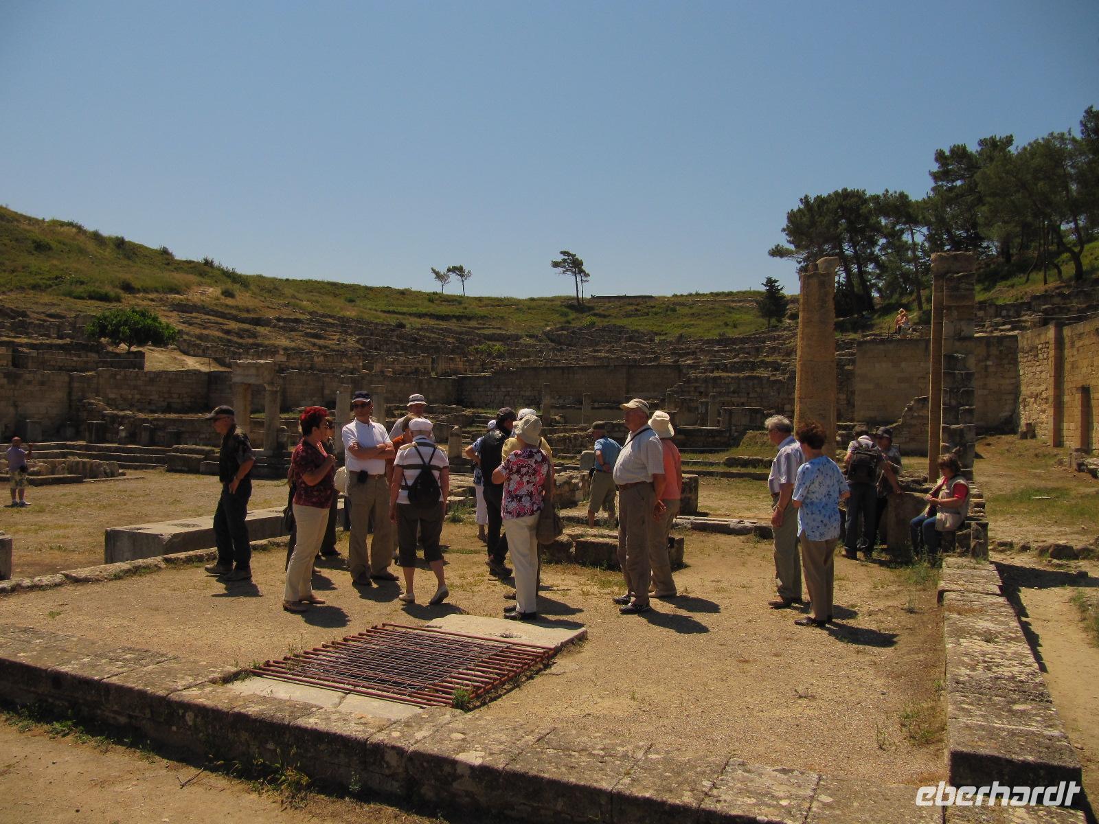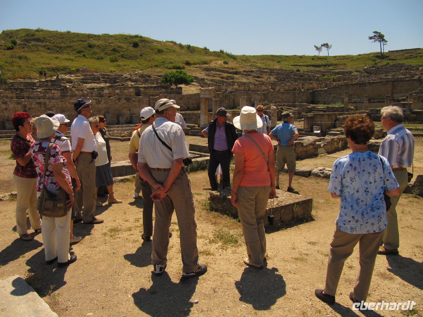 einst zur Zeit der Türkenherrschaft ausschließlich von Christen bewohnt wurde. Simeon führt uns durch den dreifachen Mauerring zunächst zum faszinierenden Großmeisterpalast. Dieses Kastell aus dem 14. Jh. wurde, nachdem es im Laufe der Geschichte durch Erdbeben und später durch eine Explosion zerstört wurde, in der Zeit der italienischen Besatzung (1912 - 1943) wieder aufgebaut. Wir sind begeistert von diesem Bauwerk. Beeindruckend sind besonders die Kieselmosaikfußböden, ursprünglich von der Insel Kos. Wir verlassen das streng symmetrische Kastell und schlendern entlang der Ritterstraße zur Altstadt. Hier haben wir ausreichend Zeit durch die engen Gassen zu flanieren. Es herrscht mediterranes Treiben. Schmackhafter griechischer Kaffee und würzige griechische Speisen, wie Pita, werden hier serviert. Am Nachmittag treffen wir wieder in der Gruppe zusammen, um die alte Stadtmauer zu erkunden. Die Wehranlage beeindruckt uns zutiefst und wir können uns durch die Erläuterungen von Simeon bildlich vorstellen, wie die Menschen im Mittelalter hier vor fremden Übergriffen Schutz fanden. Abgerundet wird unser erster Reisetag durch einen Spaziergang entlang des Mandráki-Hafens, vorbei am Arsenal-Tor, am prächtigen Aphrodite-Tempel, der Pavilos-Bastion zum Wahrzeichen der Insel. An der Hafeneinfahrt thronen ein Hirsch und eine Hirschkuh auf prächtigen Säulen. Diese sind die Wappentiere der Insel und stehen heute vermutlich dort, wo einst der sagenumwobene Koloss von Rhodos seine Füße auf den Boden stellte. Ein Kreuzfahrtschiff und viele Segler liegen im Hafen. Es ist prächtiges Wetter heute und so fahren wir am späten Nachmittag zu unserem Hotel, wo wir einen sonnigen Nachmittag am Strand und am Swimmingpool genießen.