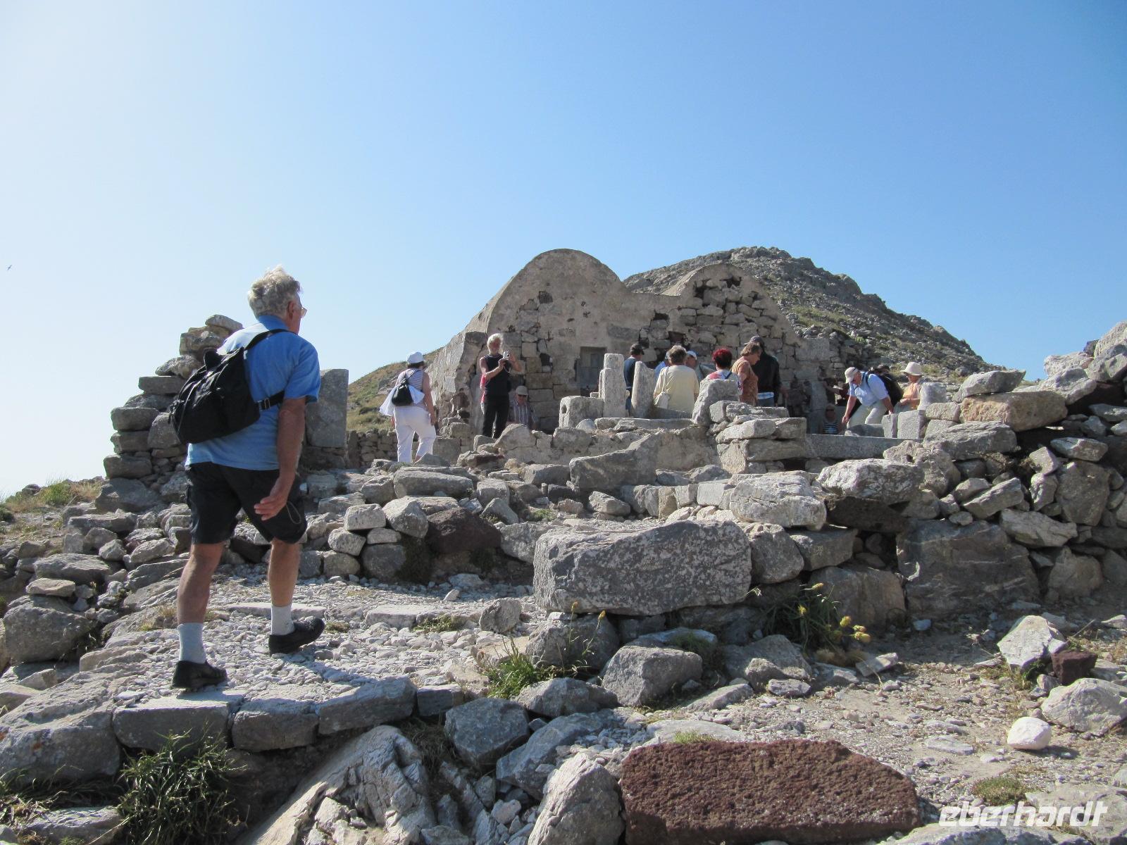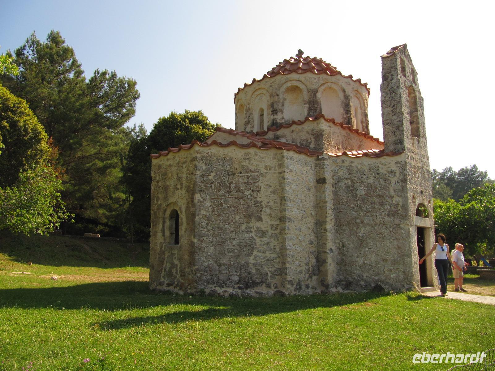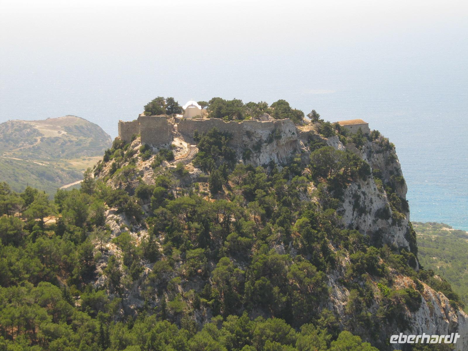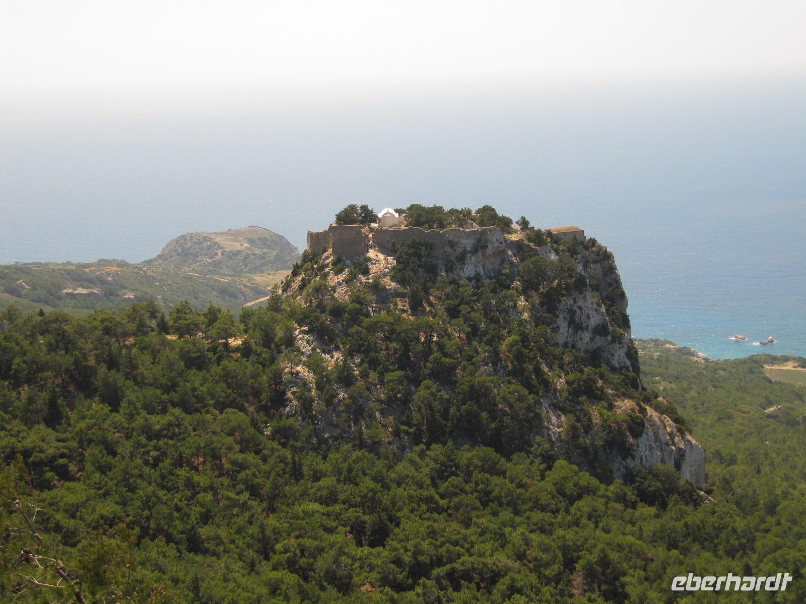 Monólithos. Der Berg ist nicht begehbar, da nur eine schmale ungeschützte Steintreppe heraufführt. Wir halten an einer Aussichtsplattform und haben hier die Möglichkeit hervorragende Bilder der Johanniterburg zu machen. Die schroffe Küste ist eingebettet in wilde Küstenlandschaft. Es herrscht steter Wind, daher ist die Vegetation in diesem Teil der Insel eher karg und felsig, aber nicht weniger interessant. Über die Straße zum Profítis Ilías setzen wir unsere Fahrt fort zur kleinen spätbyzantinischen Kirche Ágios Nikoláos Fountoúkli aus der Zeit um 1500, die uns mit ihren schönen Fresken fasziniert.