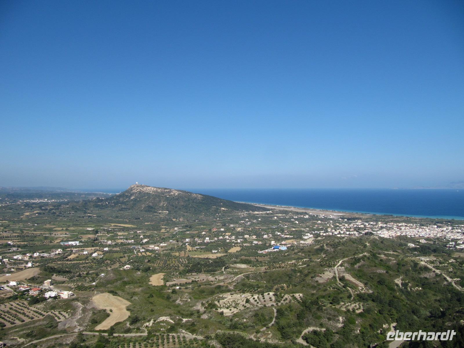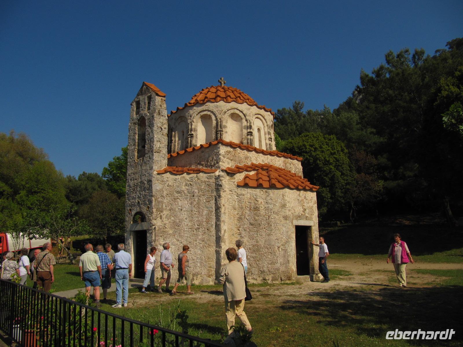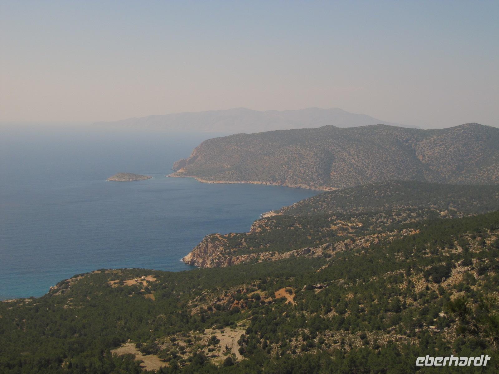 Monólithos. Der Berg ist nicht begehbar, da nur eine schmale ungeschützte Steintreppe heraufführt. Wir halten an einer Aussichtsplattform und haben hier die Möglichkeit hervorragende Bilder der Johanniterburg zu machen. Die schroffe Küste ist eingebettet in wilde Küstenlandschaft. Es herrscht steter Wind, daher ist die Vegetation in diesem Teil der Insel eher karg und felsig, aber nicht weniger interessant. Über die Straße zum Profítis Ilías setzen wir unsere Fahrt fort zur kleinen spätbyzantinischen Kirche Ágios Nikoláos Fountoúkli aus der Zeit um 1500, die uns mit ihren schönen Fresken fasziniert.