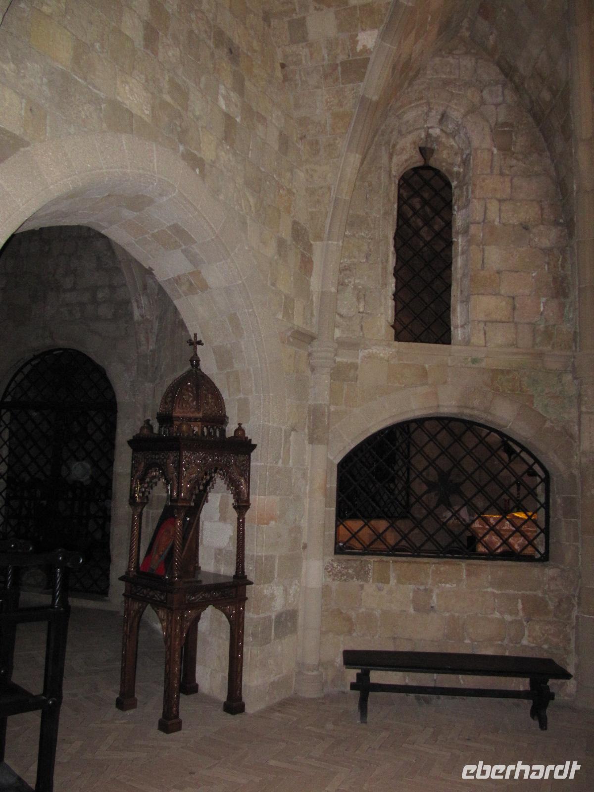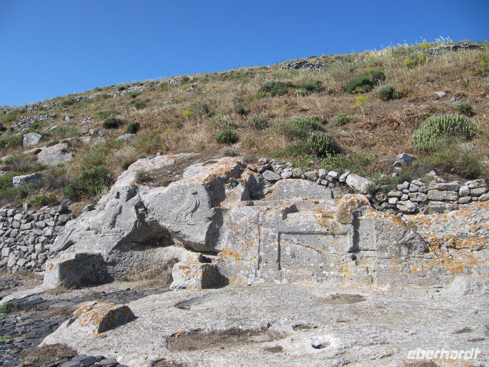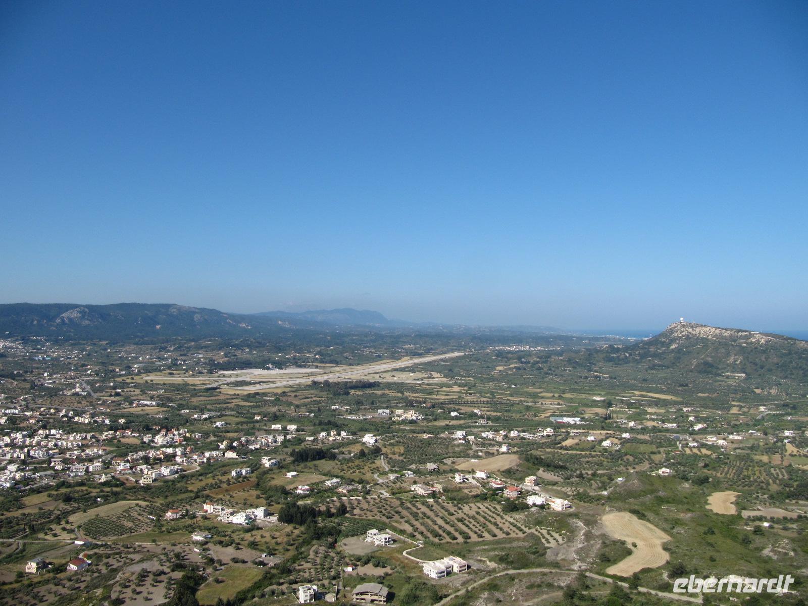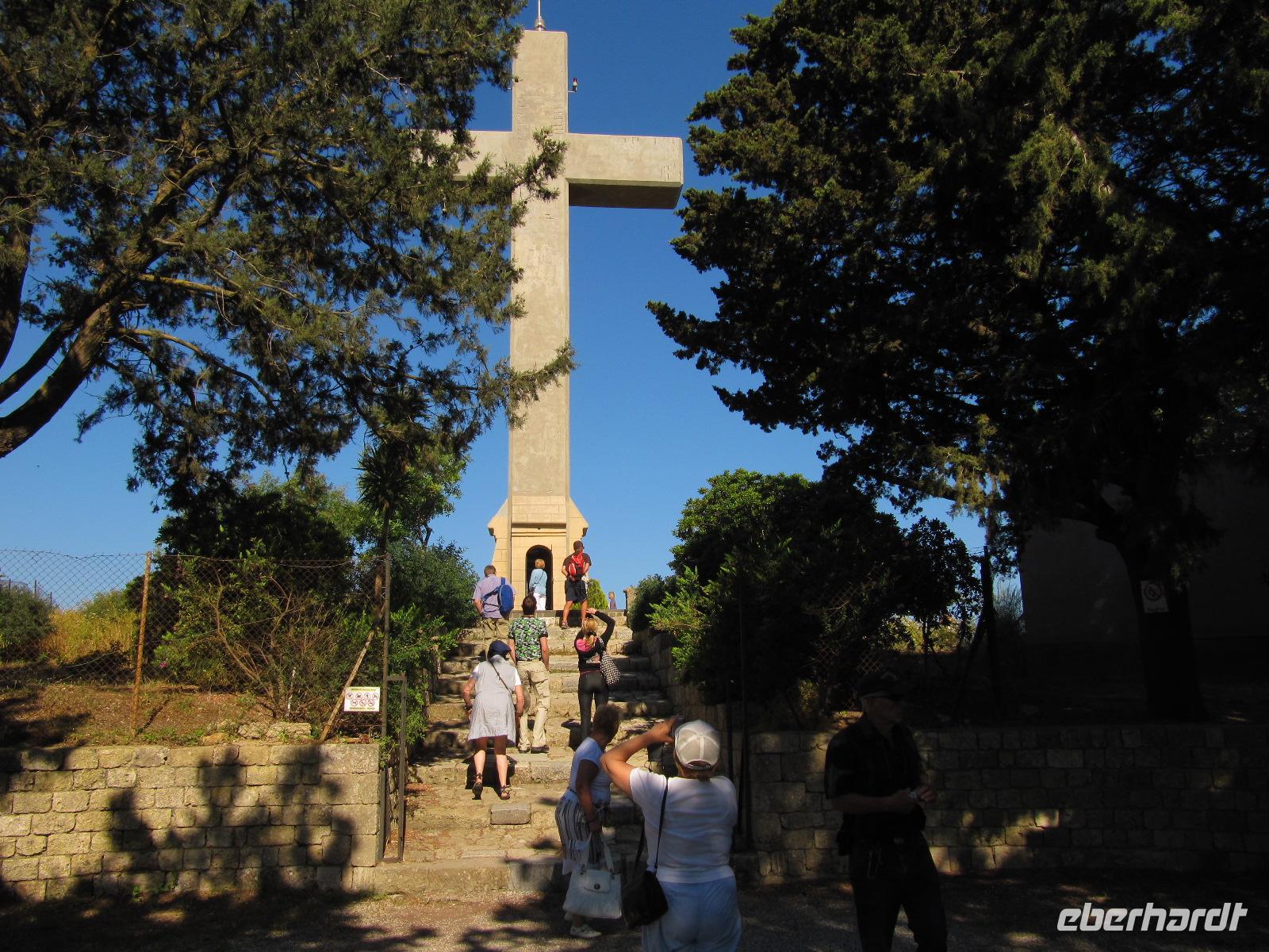 Monólithos. Der Berg ist nicht begehbar, da nur eine schmale ungeschützte Steintreppe heraufführt. Wir halten an einer Aussichtsplattform und haben hier die Möglichkeit hervorragende Bilder der Johanniterburg zu machen. Die schroffe Küste ist eingebettet in wilde Küstenlandschaft. Es herrscht steter Wind, daher ist die Vegetation in diesem Teil der Insel eher karg und felsig, aber nicht weniger interessant. Über die Straße zum Profítis Ilías setzen wir unsere Fahrt fort zur kleinen spätbyzantinischen Kirche Ágios Nikoláos Fountoúkli aus der Zeit um 1500, die uns mit ihren schönen Fresken fasziniert.