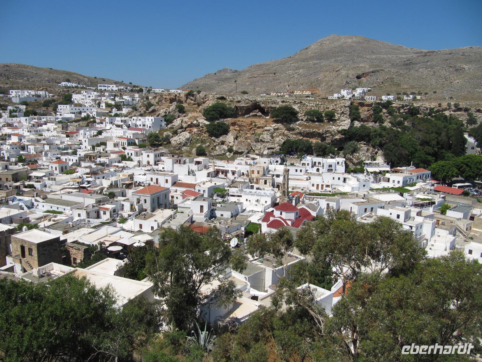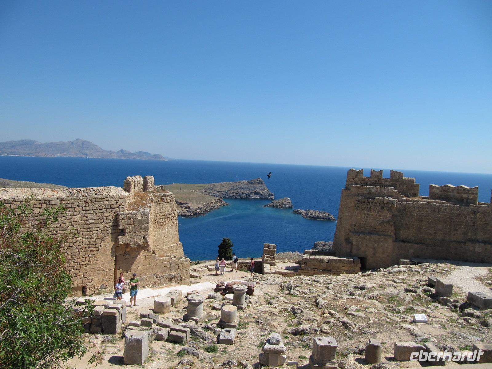beeindruckende Ruinen einer Johanniterburg. Bei der Besichtigung einer typischen Keramikwerkstat lernen wir dieses Handwerk genauer kennen. Wir erfahren, dass originale, handgemachte Töpferware daran zu erkennen ist, dass in ihrem Inneren Rillen sind. Bei maschinell erzeugter Keramik ist dies nicht der Fall, diese ist glatt. Wir fahren weiter nach Lindos, wohl eines der schönsten Dörfer der Dodekanes! Unser Reiseleiter führt uns durch die schnuckelige Altstadt mit verwinkelten Gassen. Hier herrscht mediterrane Geschäftigkeit. In den Eingängen der weißen Häuser befinden sich Geschäfte und Cafés. Wir entdecken die Panagía-Kirche, aus spätbyzantinischer Zeit. Darauf steigen wir zur Akropolis von Lindos auf. Diese ist sehr gut erhalten. Durch fachkundliche Führung von Simeon können wir uns ein Bild vom antiken Leben machen. Ein atemberaubender Blick bietet sich uns über die Küste. Das Blau des Meeres hebt sich wunderschön hinter der antiken Kulisse und der heutigen weißen Altstadt ab. Damit wir das Dorf weiter genießen