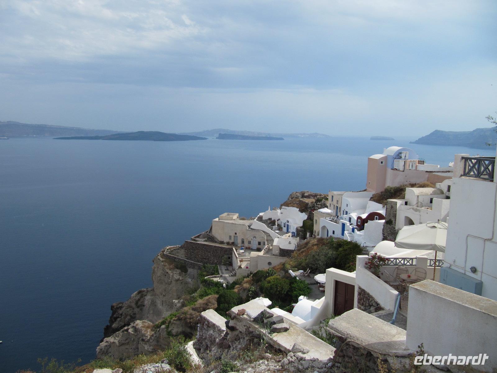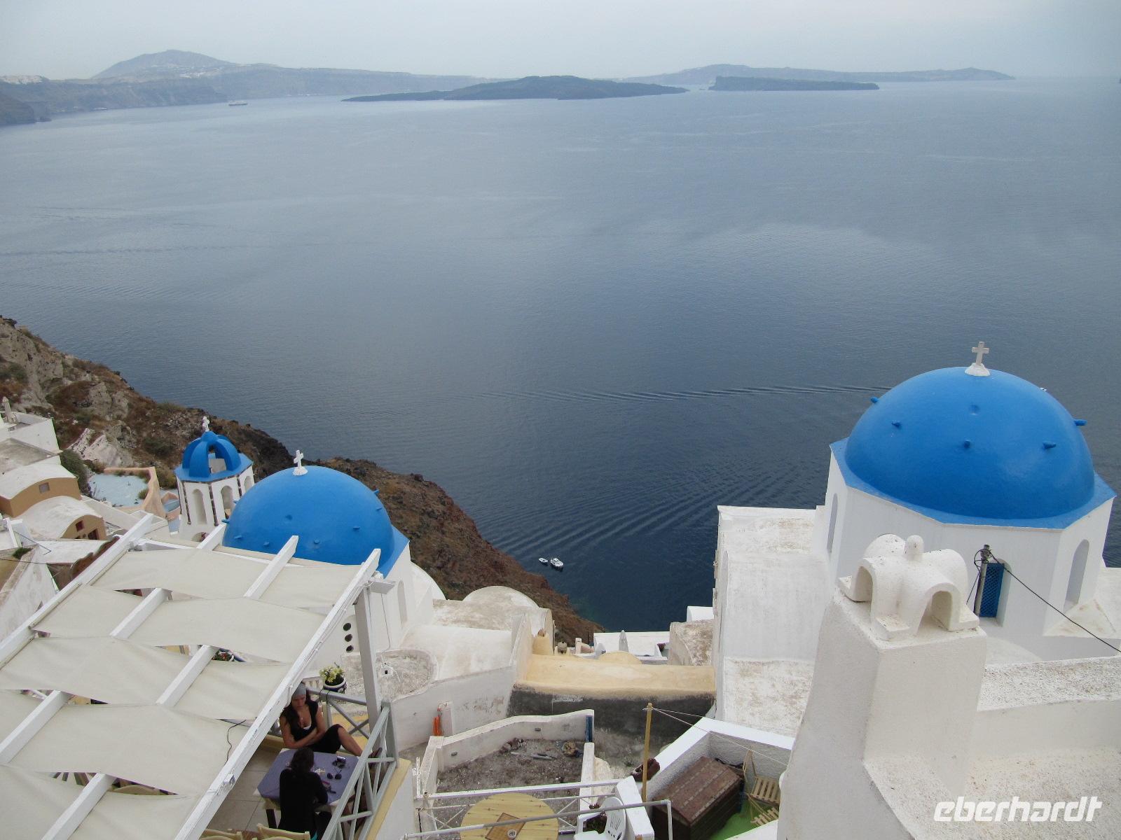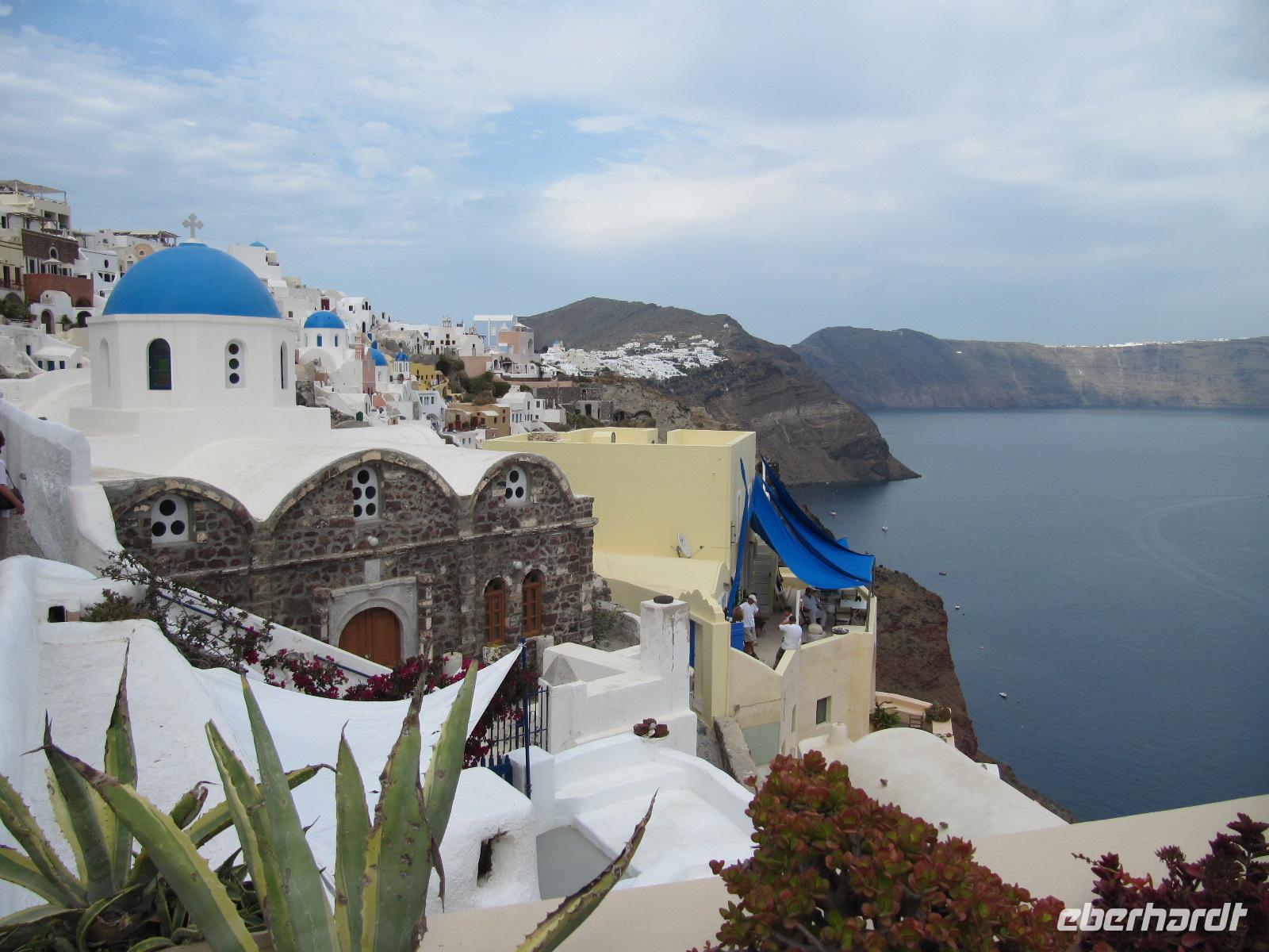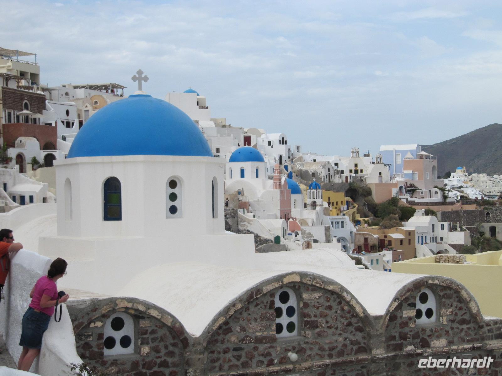 frischer griechischer Salat, Rindergeschnetzeltes oder mit Schafkäse und Tomaten gefüllte Rindfleischfrikadellen bereit. Es schmeckt auch heute wieder köstlich. Bis 16 Uhr haben wir nun Zeit die Stadt auf eigene Faust zu erkunden, bevor wir unsere Inselrundfahrt fortsetzen. Als Abschluss wollen wir Oía besichtigen. Das einstige Fischerdorf Oía liegt am äußersten Nordrand der Caldera. Vom Hauptplatz aus verlieren wir uns im herrlichen Dorfkern. Die weißen Häuser sind am Hang gebaut und die Gassen gehen weit zum Meer hinab. Die blauen Kuppeln der weltweit bekannten Kirchen von Oía faszinieren uns. Hier haben wir die unglaubliche Chance postkartengleiche Fotos zu schießen. Nachdem wir einen unvergesslichen Nachmittag verbringen durften, fahren wir zurück zu unserem Hotel und treffen uns wenig später, um bei einem Abendessen an langer Tafel unsere Erlebnisse und Eindrücke auszutauschen.