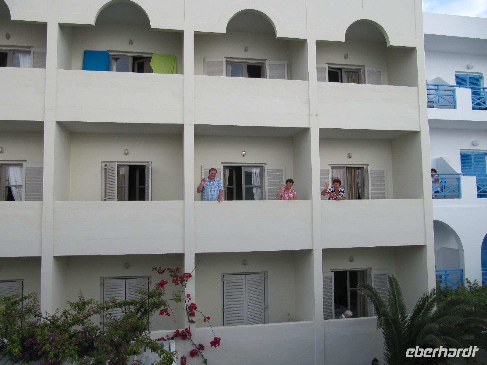 Katamaran, der Flying Cat 4. Mit rasantem Tempo durchqueren wir das ägäische Meer und kommen am späten Nachmittag auf Santorin an. Unser Transfer erwartet uns bereits und bringt uns zu unserem 4-Sterne-Hotel Aphroditi Venus Hotel & Spa, im Badeort Kamari. Im Hotel erwartet uns ein Willkommensdrink, den wir, nachdem wir unsere Zimmer bezogen haben, in der Strandbar des Hotels einnehmen. Anschließend lassen wir im Restaurant des Hotels unseren Gaumen verwöhnen. Der Wein auf Santorin ist besonders schmackhaft, mit weichem fruchtigem Aroma und er rundet unser Abendmahl ideal ab.