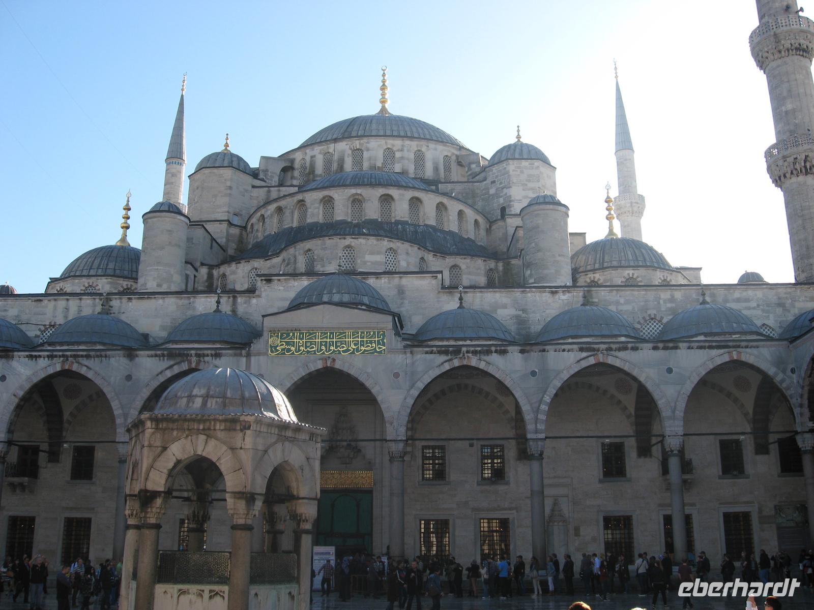Heute Morgen starteten wir erst 09:00 Uhr und konnten so etwas länger schlafen. Nach dem Frühstück checkten wir aus dem Hotel aus und fuhren als erstes zum nächsten Übernachtungshotel. Das 4-Sterne-"Nidya Hotel" ist direkt am Hafen von Istanbul gelegen. Wir gaben nur schnell unsere Koffer ab und fuhren weiter zur Eyüp Moschee. Heute war doch tatsächlich etwas von sonntäglicher Ruhe zu spüren, der Verkehr auf den Straßen war noch nicht so chaotisch, wie wir ihn bis dahin kennen gelernt haben. Die Eyüp Moschee war ganz anders als die Blaue Moschee. Sie war stiller, nicht so touristisch, und wirkte auf uns gleich unglaublich authentisch. Auch hier mussten wir Frauen die Kopftücher anlegen, die Schuhe ausziehen und betraten die für uns fremde Welt des Islam. Serdar erläuterte uns vor der Moschee die Geschichte dieser. Danach durften wir Frauen in die abgetrennten Räume, welche nur für die Frauen sind. Da sich diese auf dem Balkon innerhalb der Moschee befinden, hatten wir einen besonderen Blick auf den Innenbereich der Moschee. Nach der Besichtigung ging es es weiter zur Seilbahn, welche uns auf den Aussichtsberg „Pierre Loti" brachte. Auf dem Berg angekommen, nahmen wir alle in einem kleinen Kaffeehaus von Pierre Loti Platz und tranken Tee oder echten türkischen Kaffee. Hier war Ruhe zu spüren, wir hatten einen grandiosen Blick über die so quirlige Stadt und lauschten wie schon die ganze Zeit den Ausführungen von Serdar. Von hier aus fuhren wir zurück in das Zentrum von Istanbul und Serdar schlenderte mit uns über den ägyptischen Basar, wir kosteten Gewürze und leckeren türkischen Honig, rochen die so verschieden Tees und ließen das bunte Treiben des Basars auf uns wirken. So viel Farbe, so eine Lebendigkeit, so ein Leben, die verschieden Gerüche, da alles ist doch für uns fast wie aus 1001er Nacht. Direkt am Hippodrom aßen wir zu Mittag. Gestärkt nahmen wir jetzt Kurs auf den Topkapi Palast. Hier hätten wir stundenlang den Ausführungen von Serdar lauschen können, die Geschichte dieser Stadt und seiner Menschen ist so interressant , das man Wochen füllen könnte, wenn man alles hören möchte. Gemeinsam gingen wir durch den Palast, schauten in die Waffenkammer, die Kleiderkammer, sahen ausgewählte Stücke von des Sultans Schätzen und konnten den Thron der Sultane bestaunen. Am Ende des Gartens hatte man wieder eine grandiose Aussicht auf den Bosporus, die Moscheen und die Stadt. Danach besichtigten wir noch zwei Hotels. Zum einen das 4-Sterne-Hotel „Grand Halic" und zum anderen das 5-Sterne-Hotel „Intercontinental". Zurück in unserem Hotel Nidya bezogen wir die Zimmer, machten uns frisch und auf ging es zu dem letzten Programmpunkt an diesem Tag, zur türkischen Nacht Show. Wir erlebten eine Show mit traditionellen Tanzeinlagen und Bauchtanz. Dazu wurde uns ein leckeres Essen gereicht. Der Abend bildete einen krönenden Abschluss unserer tollen Reise nach Istanbul. Zusammen tanzten und sangen wir und genossen die letzten gemeinsamen Stunden in dieser quirligen Metropole. Nach der Show ging es durch das nächtliche Istanbul zurück zu unserem Hotel. Leider mussten wir uns nun von einem lieb gewonnen Teilnehmer unserer Gruppe trennen. Unser wandelndes Lexikon Serdar verlies uns schon an diesem Abend. Wir drückten uns alle fest und versprachen uns, nicht das letzte Mal diese traumhafte Metropole besucht zu haben.