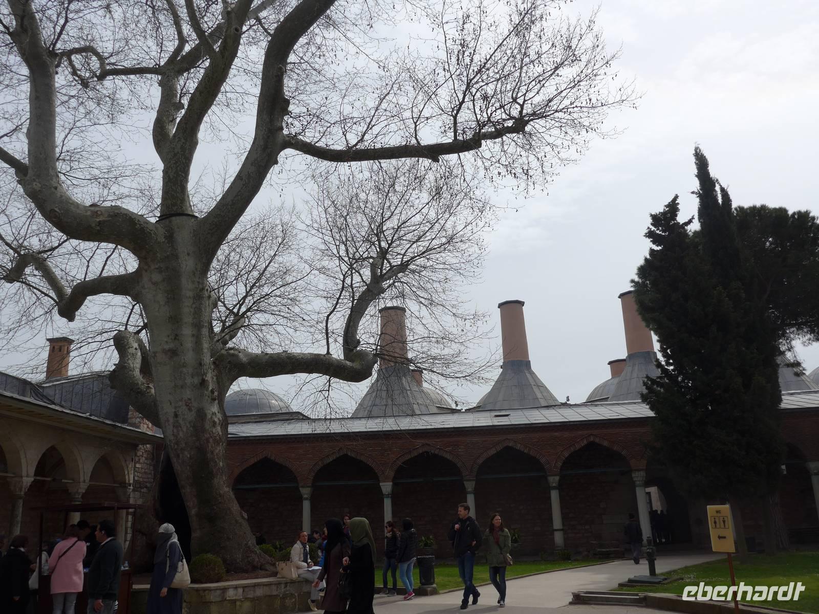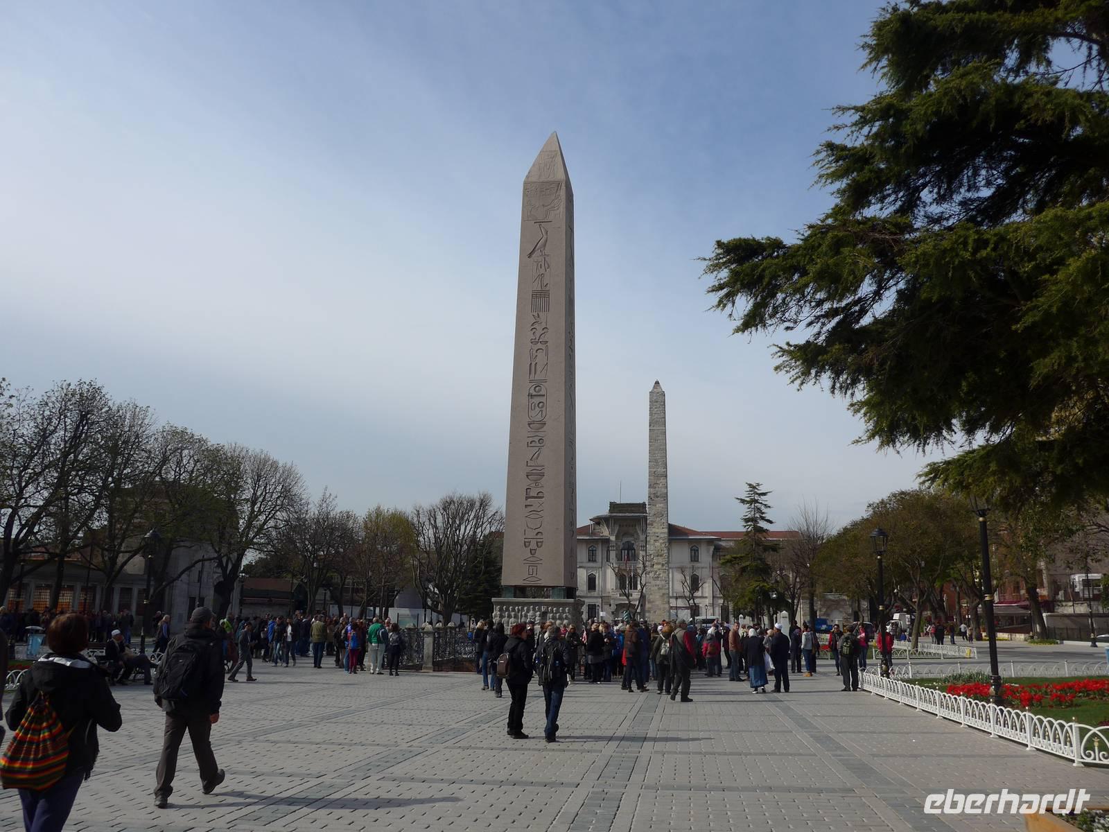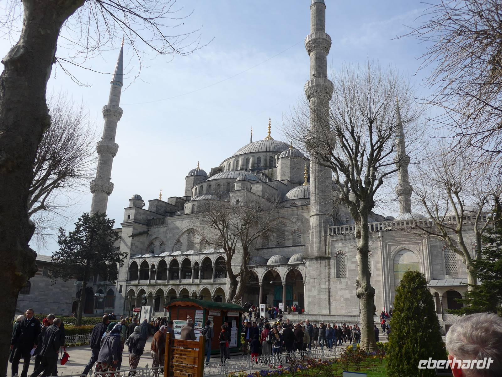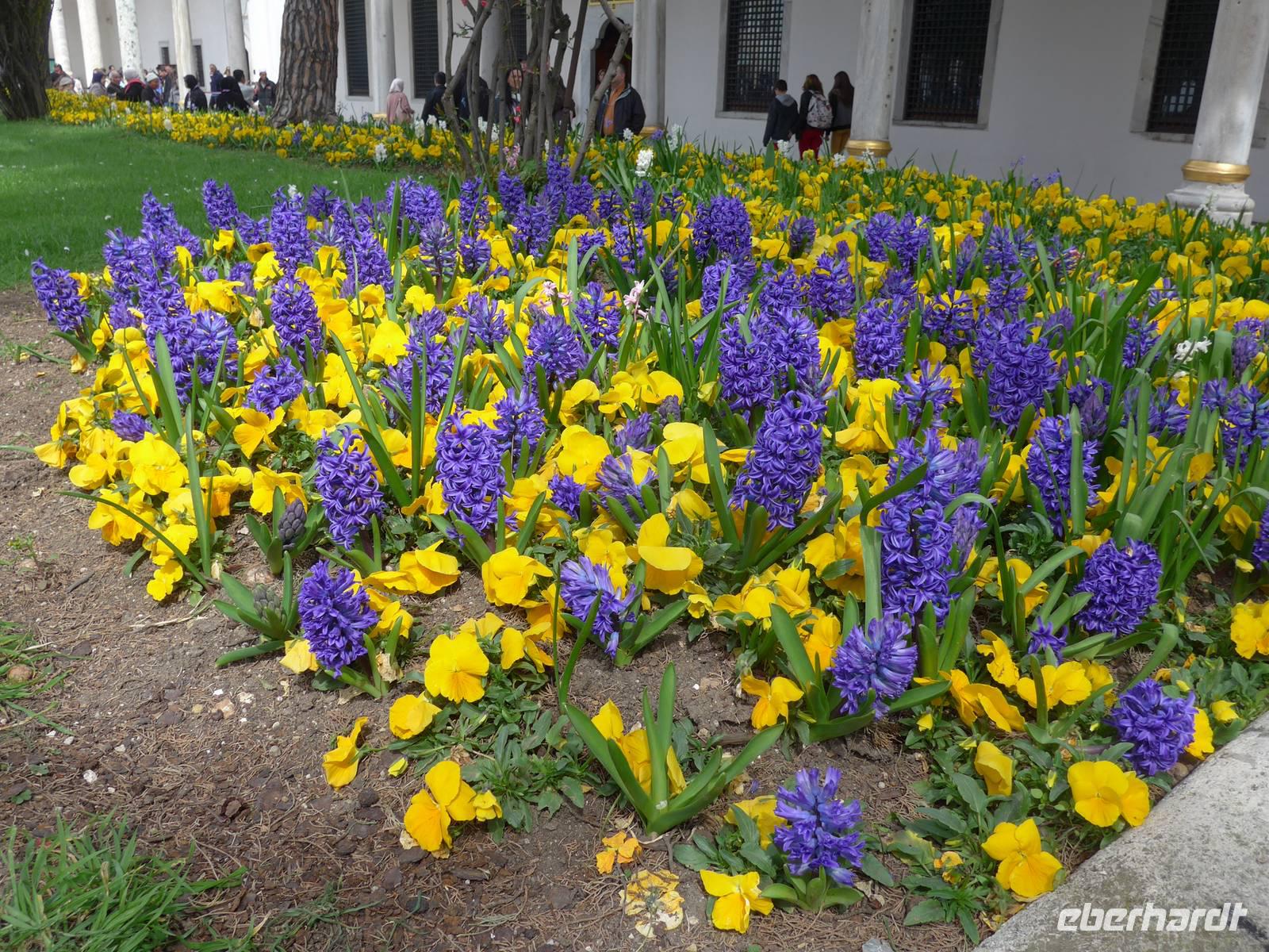 Zum Frühstück im Hotel hoppelte der Osterhase vorbei und brachte Süßes. Gut gestärkt machten wir uns dann zu Fuß auf den Weg in das historische Stadtzentrum. Hassan, unser türkischer Reiseleiter und Sirri, Chef der Agentur begleiteten unsere Gruppe. Durch die Stadtteile Laleli und Beyazit, vorbei an der Konstantin-Säule erreichten wir nach einer guten Stunde das Hippodrom. Hier fanden einst Pferderennen und sportliche Spiele statt mit bis zu 100000 Zuschauern. Auf dem riesigen Platz waren viele Gruppen unterwegs und an der Blauen Moschee eine lange Schlange. So gingen wir erst zur Hagia Sofia. Der heutige 3.Bau stammt aus dem 6.Jahrhundert und wurde als griechisch-orthodoxe Kathedrale genutzt. Mit dem Machtantritt der Osmanen wurde sie zur Moschee umfunktioniert und seit 1934 ist sie ein Museum. Gleich nebenan befindet sich der Topkapi-Palast, einst Wohn- und Regierungssitz der Sultane sowie das Verwaltungszentrum des Osmanischen Reiches. Wir durften die lange Schlange der Wartenden passieren und sofort eintreten. Am Modell erklärte uns Hassan den Aufbau der Anlage und danach besuchten wir alle Höfe bis hin zum Lustgarten. Die Außenanlagen waren wunderschön mit Frühlingsblumen bepflanzt und die Aussicht auf den Bosporus und das Goldene Horn beeindruckend. Noch schnell ein kleiner Imbiß und schon ging es weiter zur Blauen Moschee. Nachdem eine Trauergemeinde mit dem Sarg die Moschee verlassen hatte, durften wir eintreten in das gewaltige und wunderschön mit blauen Kacheln geschmückte Gebäude. Die Moschee hat als einzige 6 Minarette und wurde 1000 Jahre nach der Hagia Sofia errichtet von Sultan Ahmed.