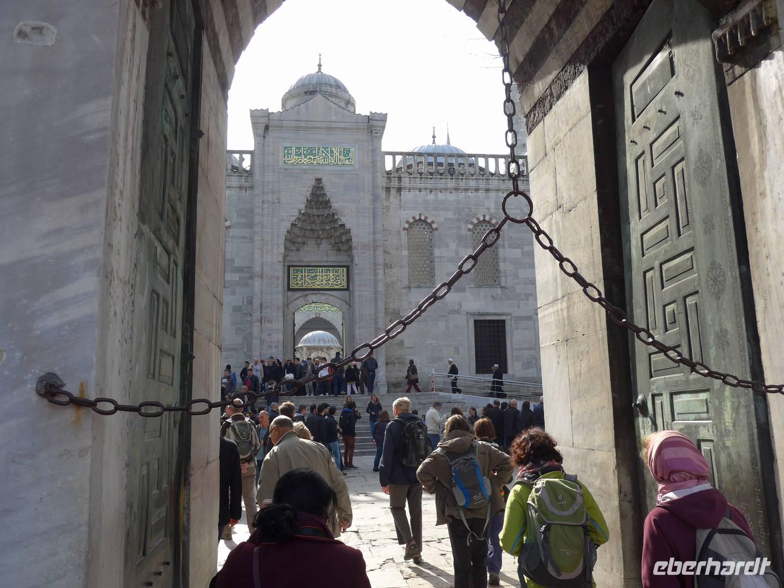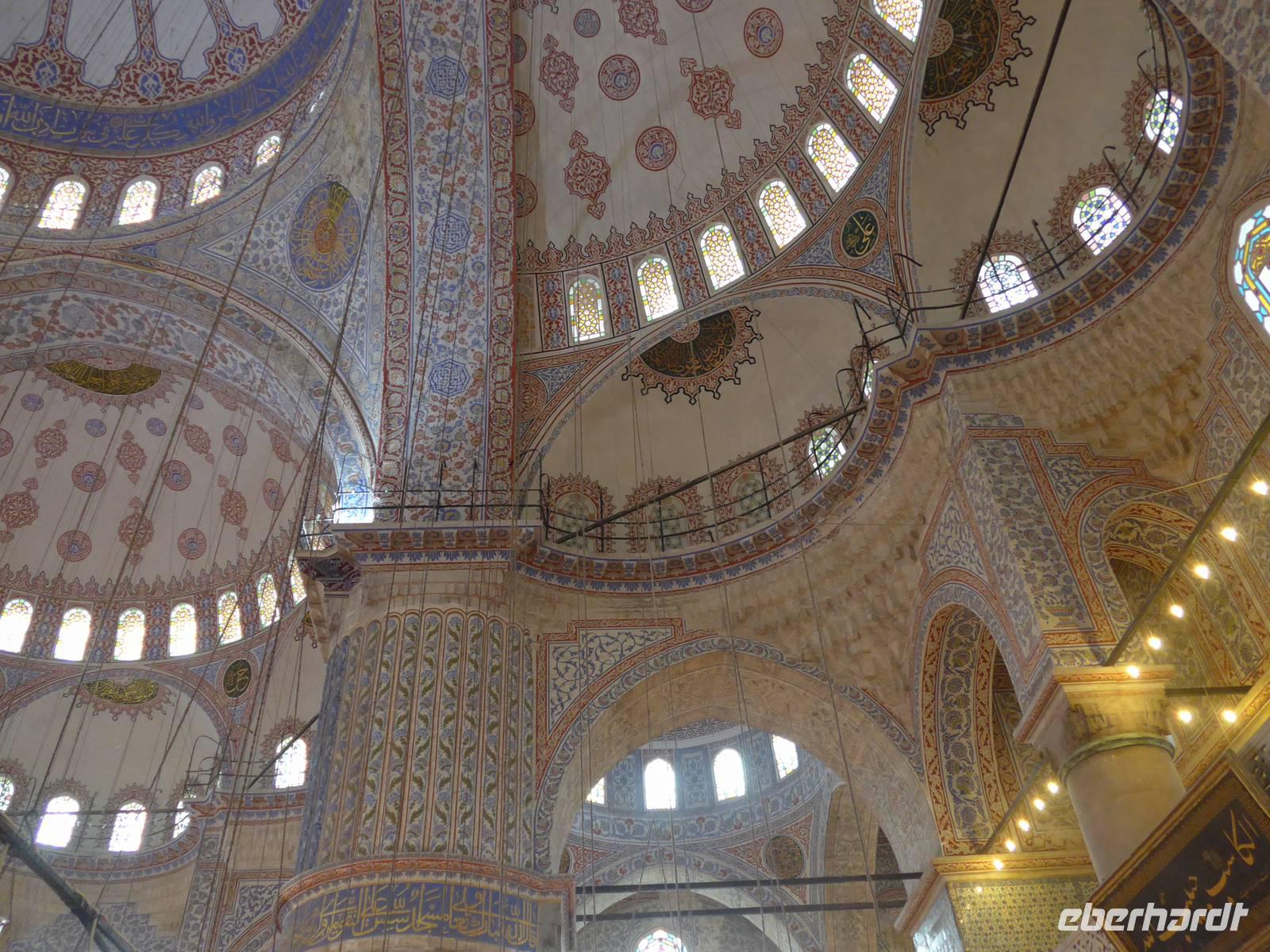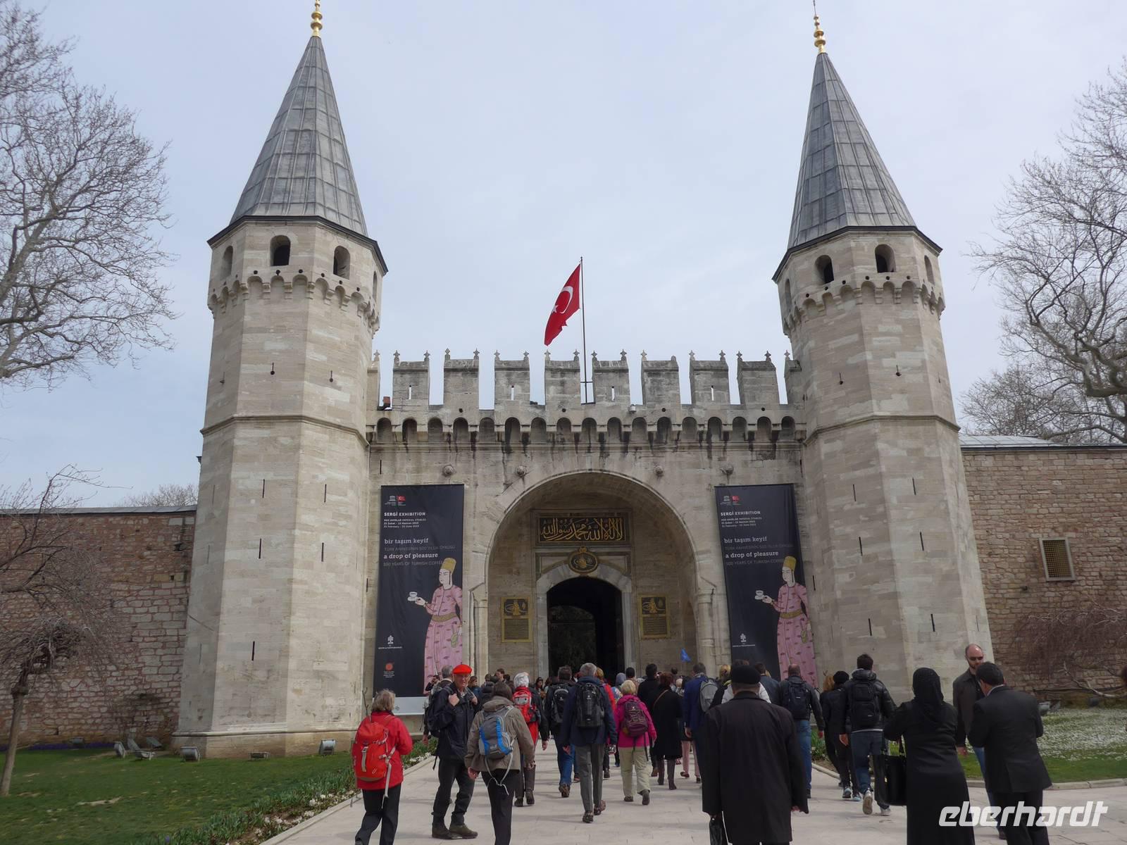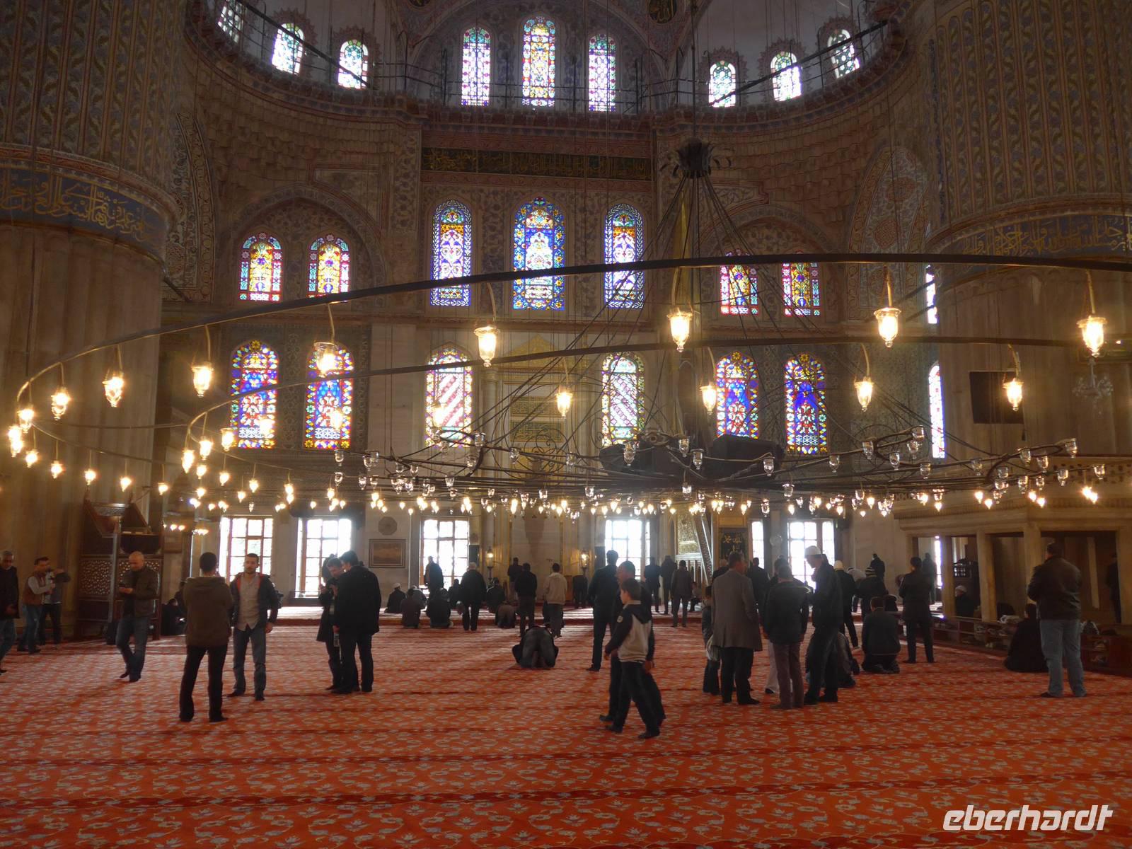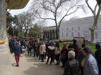 Zum Frühstück im Hotel hoppelte der Osterhase vorbei und brachte Süßes. Gut gestärkt machten wir uns dann zu Fuß auf den Weg in das historische Stadtzentrum. Hassan, unser türkischer Reiseleiter und Sirri, Chef der Agentur begleiteten unsere Gruppe. Durch die Stadtteile Laleli und Beyazit, vorbei an der Konstantin-Säule erreichten wir nach einer guten Stunde das Hippodrom. Hier fanden einst Pferderennen und sportliche Spiele statt mit bis zu 100000 Zuschauern. Auf dem riesigen Platz waren viele Gruppen unterwegs und an der Blauen Moschee eine lange Schlange. So gingen wir erst zur Hagia Sofia. Der heutige 3.Bau stammt aus dem 6.Jahrhundert und wurde als griechisch-orthodoxe Kathedrale genutzt. Mit dem Machtantritt der Osmanen wurde sie zur Moschee umfunktioniert und seit 1934 ist sie ein Museum. Gleich nebenan befindet sich der Topkapi-Palast, einst Wohn- und Regierungssitz der Sultane sowie das Verwaltungszentrum des Osmanischen Reiches. Wir durften die lange Schlange der Wartenden passieren und sofort eintreten. Am Modell erklärte uns Hassan den Aufbau der Anlage und danach besuchten wir alle Höfe bis hin zum Lustgarten. Die Außenanlagen waren wunderschön mit Frühlingsblumen bepflanzt und die Aussicht auf den Bosporus und das Goldene Horn beeindruckend. Noch schnell ein kleiner Imbiß und schon ging es weiter zur Blauen Moschee. Nachdem eine Trauergemeinde mit dem Sarg die Moschee verlassen hatte, durften wir eintreten in das gewaltige und wunderschön mit blauen Kacheln geschmückte Gebäude. Die Moschee hat als einzige 6 Minarette und wurde 1000 Jahre nach der Hagia Sofia errichtet von Sultan Ahmed.