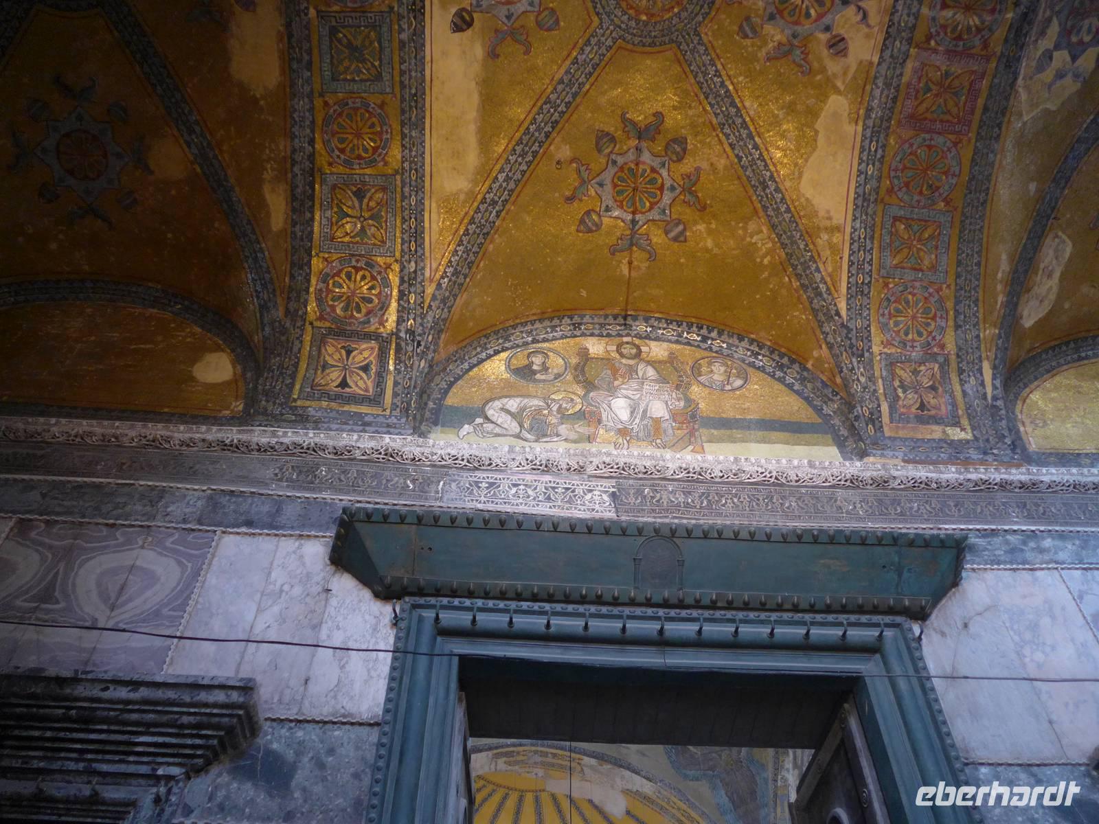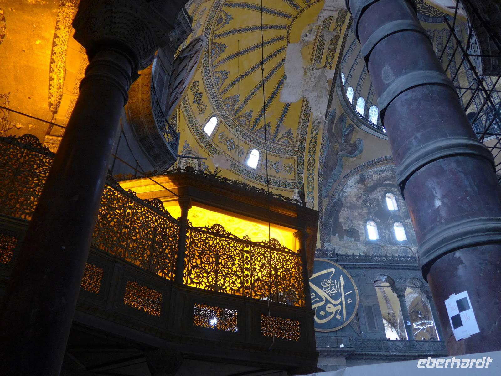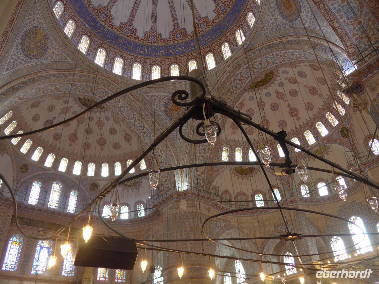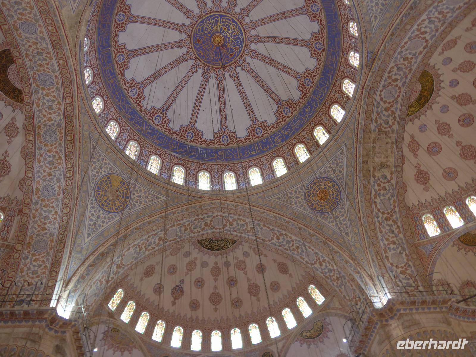 Zum Frühstück im Hotel hoppelte der Osterhase vorbei und brachte Süßes. Gut gestärkt machten wir uns dann zu Fuß auf den Weg in das historische Stadtzentrum. Hassan, unser türkischer Reiseleiter und Sirri, Chef der Agentur begleiteten unsere Gruppe. Durch die Stadtteile Laleli und Beyazit, vorbei an der Konstantin-Säule erreichten wir nach einer guten Stunde das Hippodrom. Hier fanden einst Pferderennen und sportliche Spiele statt mit bis zu 100000 Zuschauern. Auf dem riesigen Platz waren viele Gruppen unterwegs und an der Blauen Moschee eine lange Schlange. So gingen wir erst zur Hagia Sofia. Der heutige 3.Bau stammt aus dem 6.Jahrhundert und wurde als griechisch-orthodoxe Kathedrale genutzt. Mit dem Machtantritt der Osmanen wurde sie zur Moschee umfunktioniert und seit 1934 ist sie ein Museum. Gleich nebenan befindet sich der Topkapi-Palast, einst Wohn- und Regierungssitz der Sultane sowie das Verwaltungszentrum des Osmanischen Reiches. Wir durften die lange Schlange der Wartenden passieren und sofort eintreten. Am Modell erklärte uns Hassan den Aufbau der Anlage und danach besuchten wir alle Höfe bis hin zum Lustgarten. Die Außenanlagen waren wunderschön mit Frühlingsblumen bepflanzt und die Aussicht auf den Bosporus und das Goldene Horn beeindruckend. Noch schnell ein kleiner Imbiß und schon ging es weiter zur Blauen Moschee. Nachdem eine Trauergemeinde mit dem Sarg die Moschee verlassen hatte, durften wir eintreten in das gewaltige und wunderschön mit blauen Kacheln geschmückte Gebäude. Die Moschee hat als einzige 6 Minarette und wurde 1000 Jahre nach der Hagia Sofia errichtet von Sultan Ahmed.