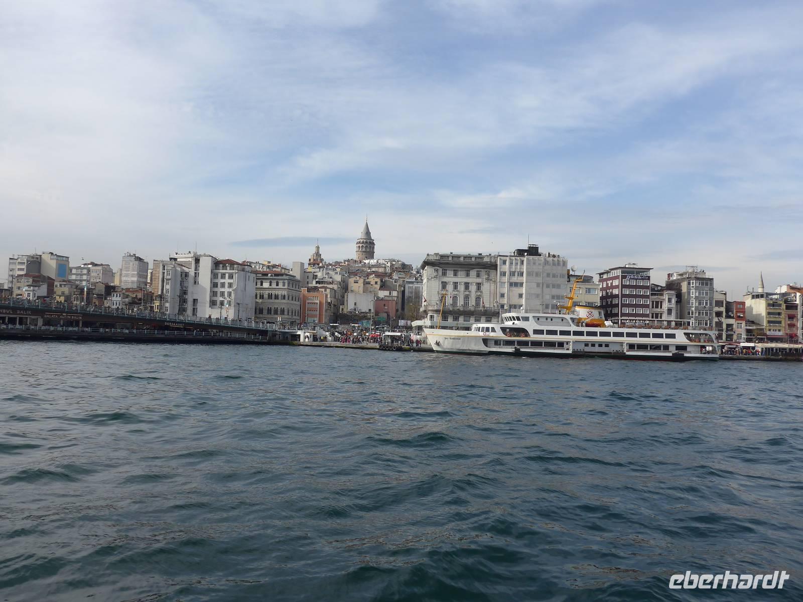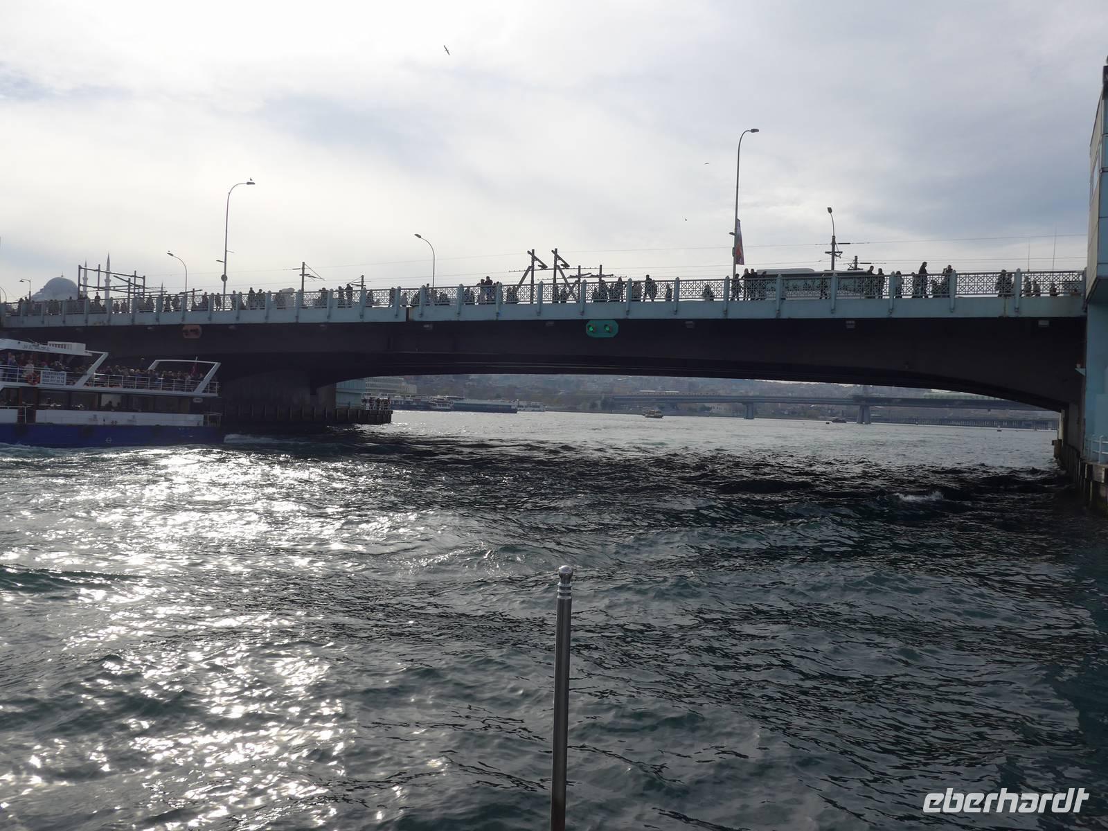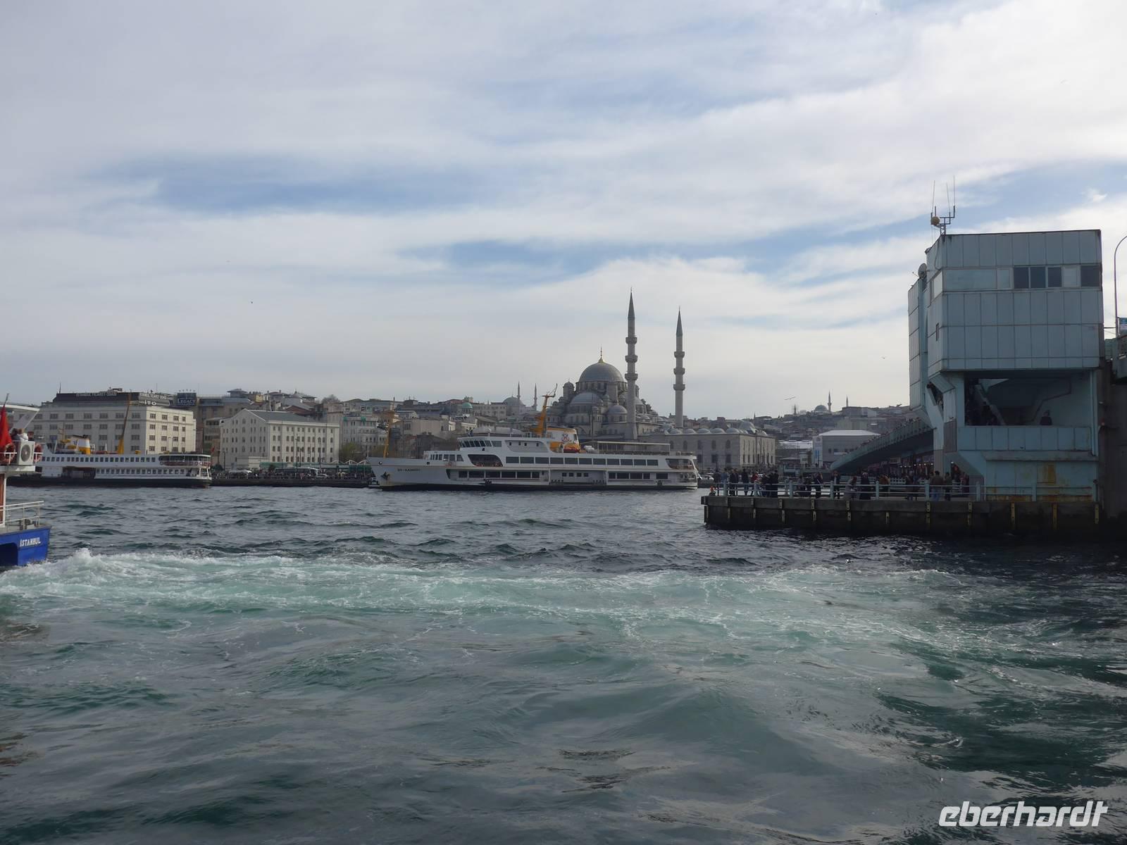 Von der Blauen Moschee ging es schnellen Fußes hinunter zum Goldenen Horn, wo unser Schiff zur Bosporusfahrt wartete. Aufgrund des großen Ansturmes war ein Anlegen bei der Kuppelmoschee nicht möglich und so gingen wir flott weiter über die Galata-Brücke hinüber zum Fischmarkt und dann endlich an Bord. Fast 15 km hatten wir in den Beinen und waren glücklich über einen Sitzplatz auf dem Schiff, was ganz allein für unsere Gruppe auslief.