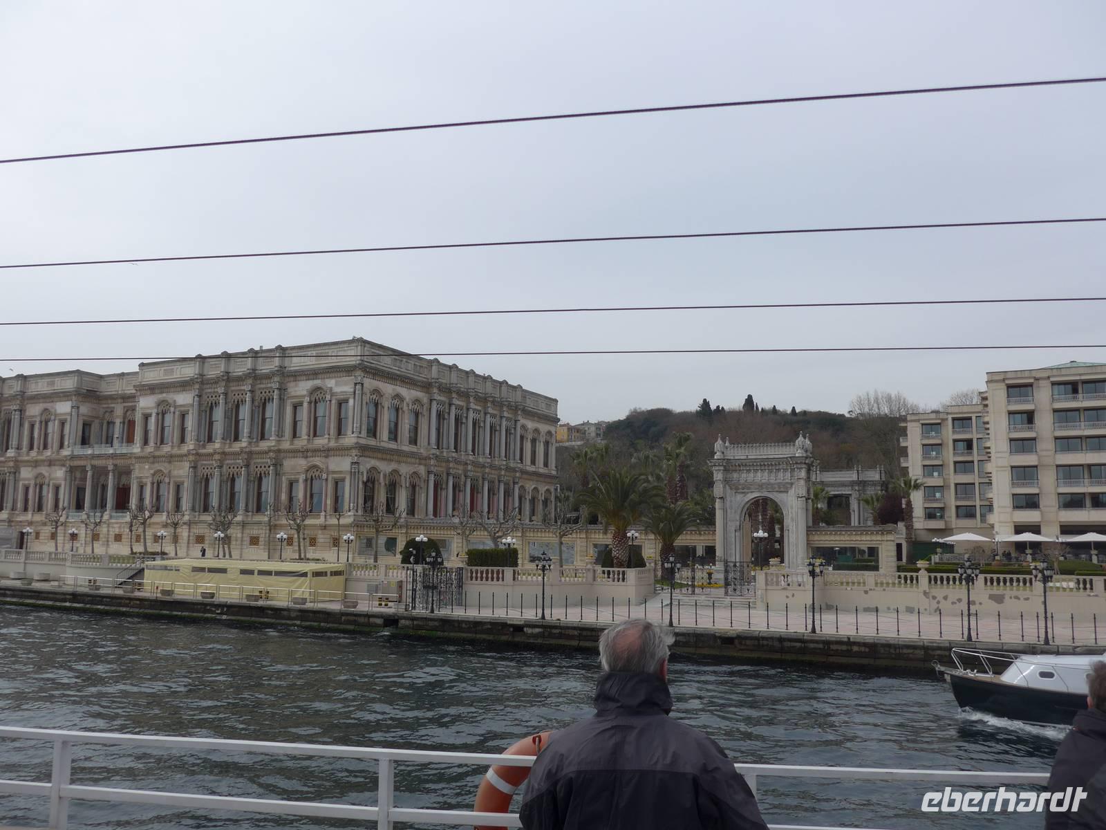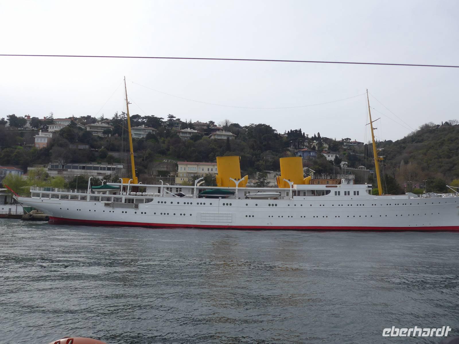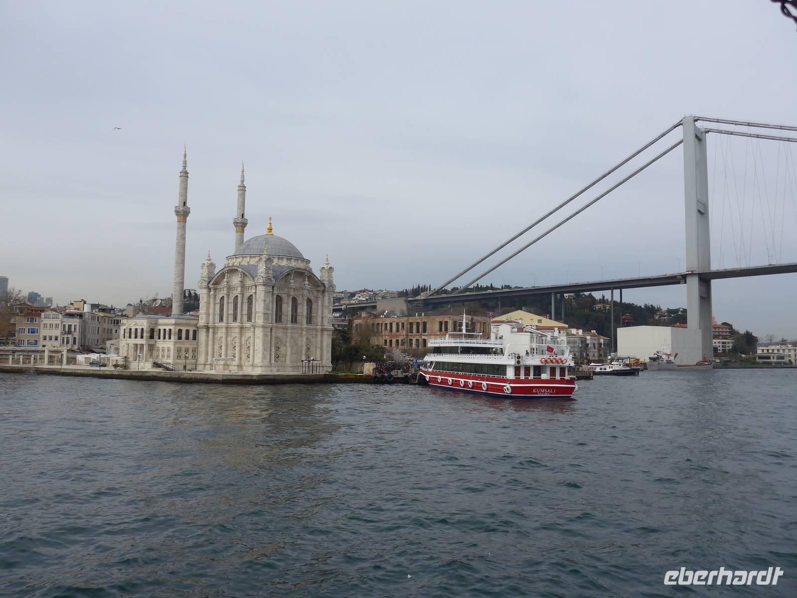 Von der Blauen Moschee ging es schnellen Fußes hinunter zum Goldenen Horn, wo unser Schiff zur Bosporusfahrt wartete. Aufgrund des großen Ansturmes war ein Anlegen bei der Kuppelmoschee nicht möglich und so gingen wir flott weiter über die Galata-Brücke hinüber zum Fischmarkt und dann endlich an Bord. Fast 15 km hatten wir in den Beinen und waren glücklich über einen Sitzplatz auf dem Schiff, was ganz allein für unsere Gruppe auslief.