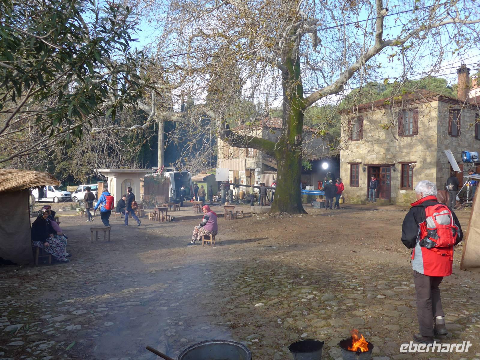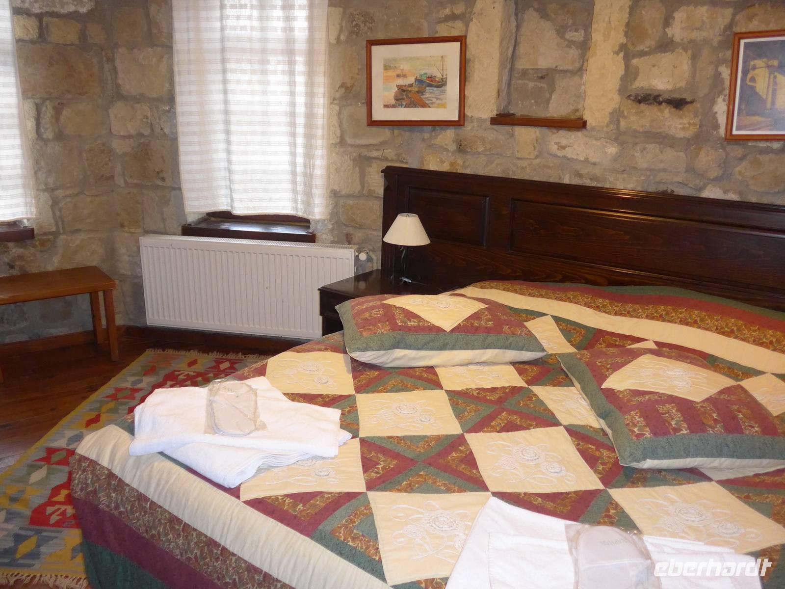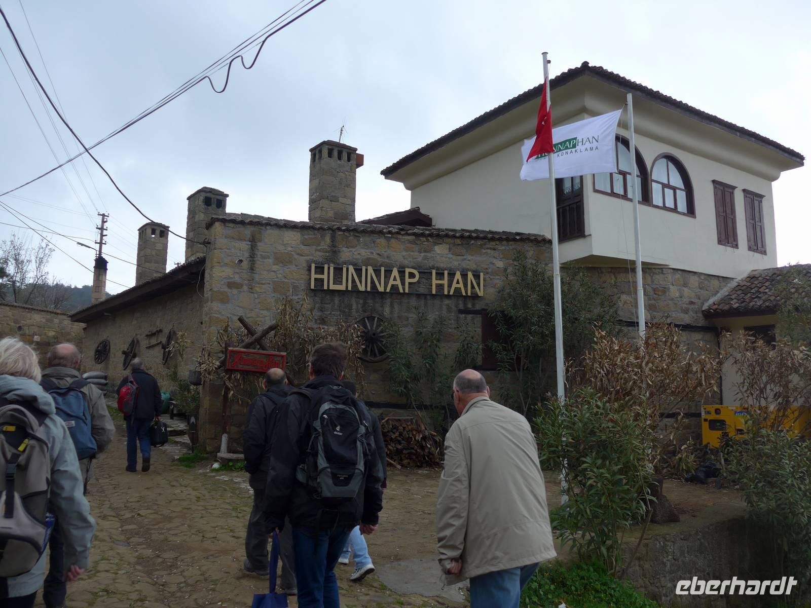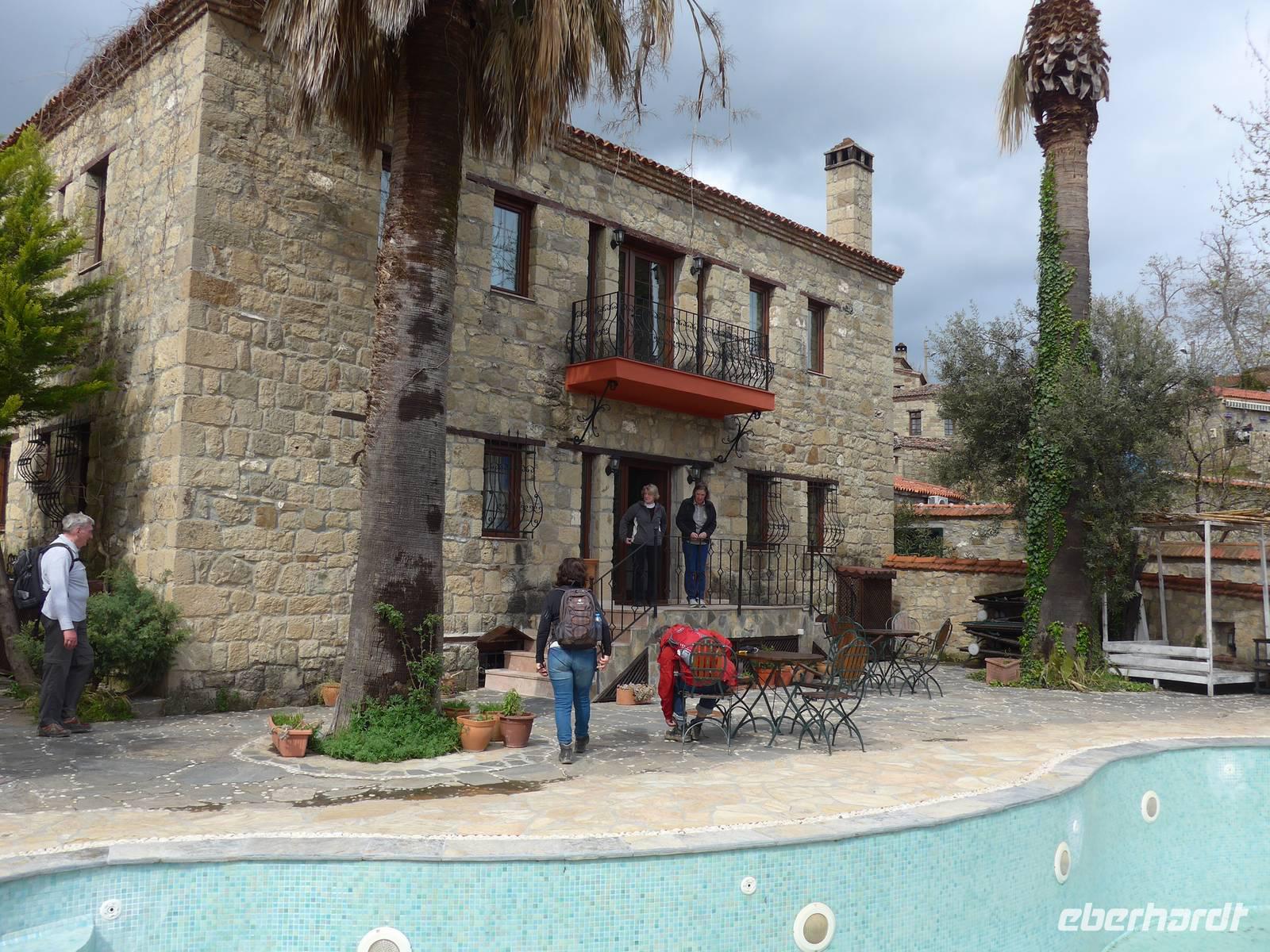 Auf der Fahrt hatten wir tolle neue Straßen kennengelernt und nun ging es die letzten 4 km steil bergan durch Olivenhaine auf einem schmalen Weg mit tollen Ausblicken auf die Küste. Im Bergdorf Adatepe waren Filmaufnahmen und so brachte uns der Bus zu einer Stelle, wo wir dann nur noch zu Fuß weiter kamen. Im Hotel Hünnap Han hatte man für uns den Kamin angeheizt und Tee vorbereitet und so saßen wir erst einmal gemütlich am Feuer zusammen. Das war die Gelegenheit für eine kurze Vorstellungsrunde aller Reiseteilnehmer. Inzwischen waren die Sachen getrocknet und wir bezogen unsere Zimmer in 2 verschiedenen alten Steinhäusern. Als wir uns zum Abendessen wieder trafen, gab es viel zu erzählen, denn jeder hatte in der kurzen Zeit schon etwas erlebt in diesem "Museums- und Filmdorf". Wir fühlten uns alle sehr wohl und irgendwie auch heimisch.