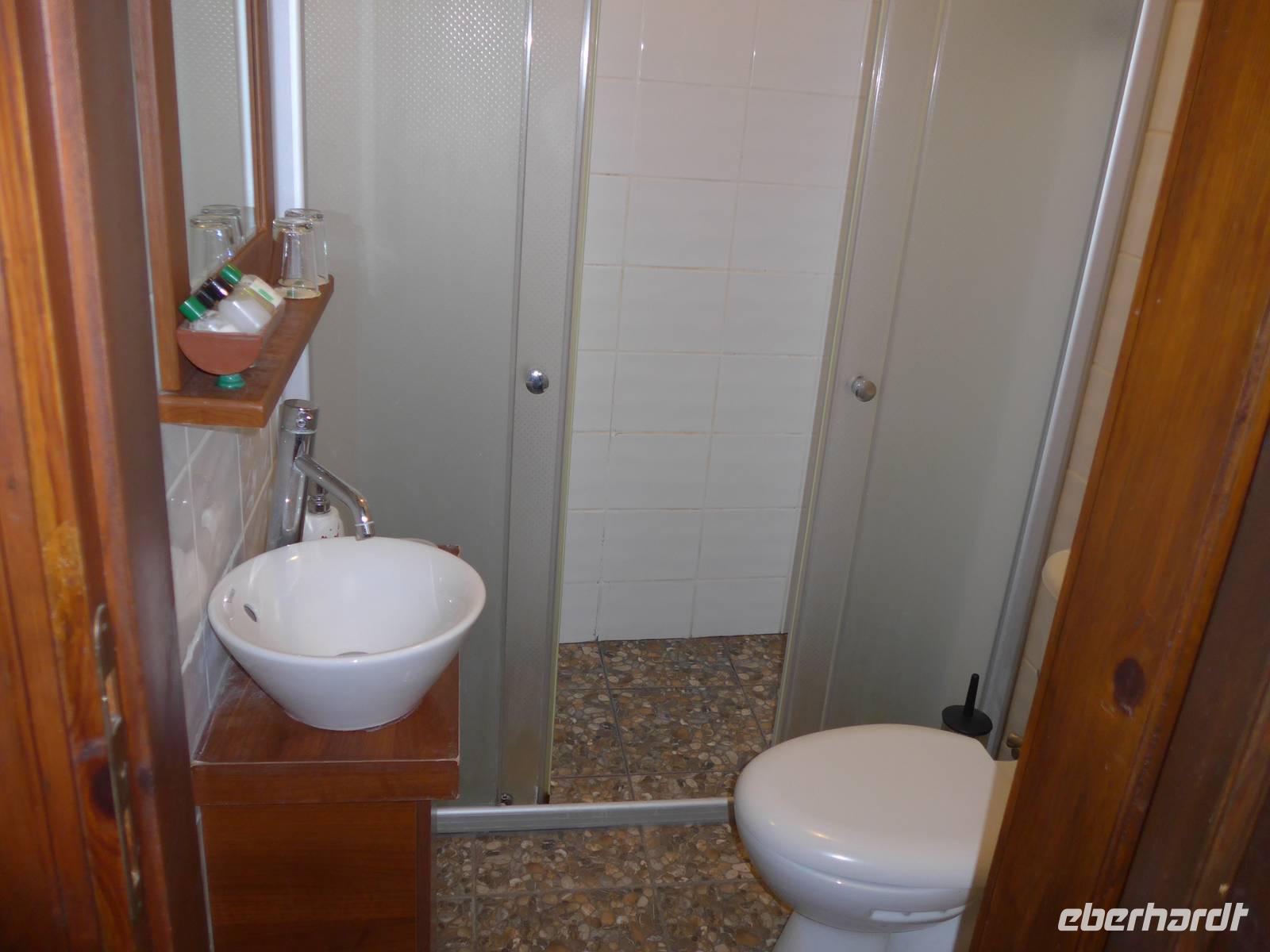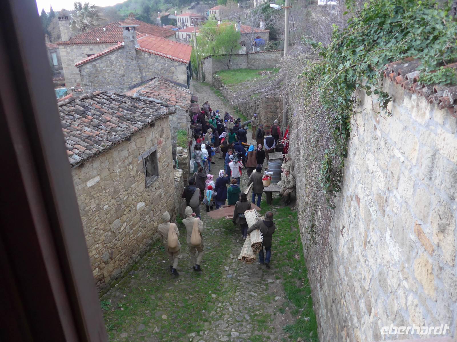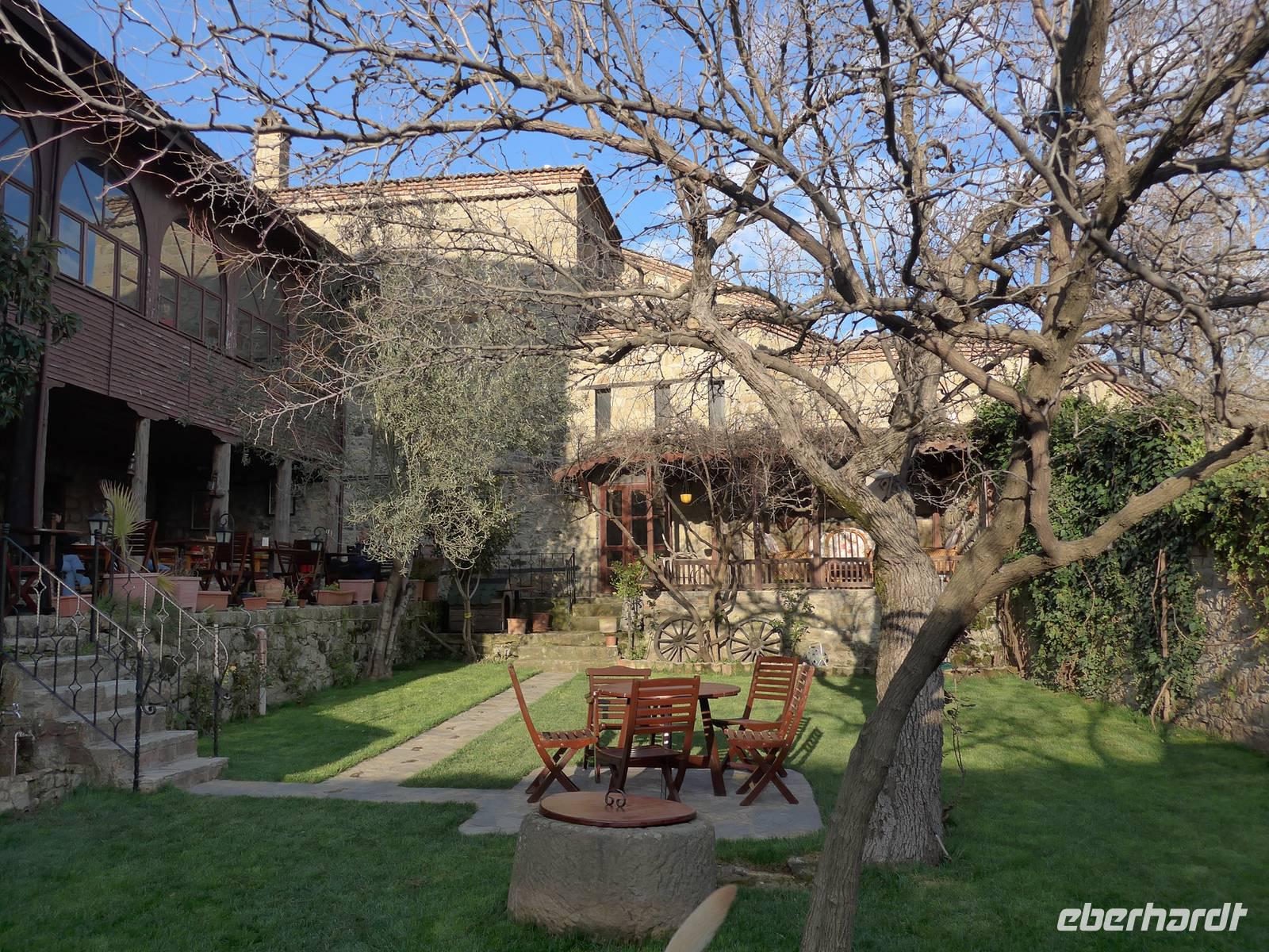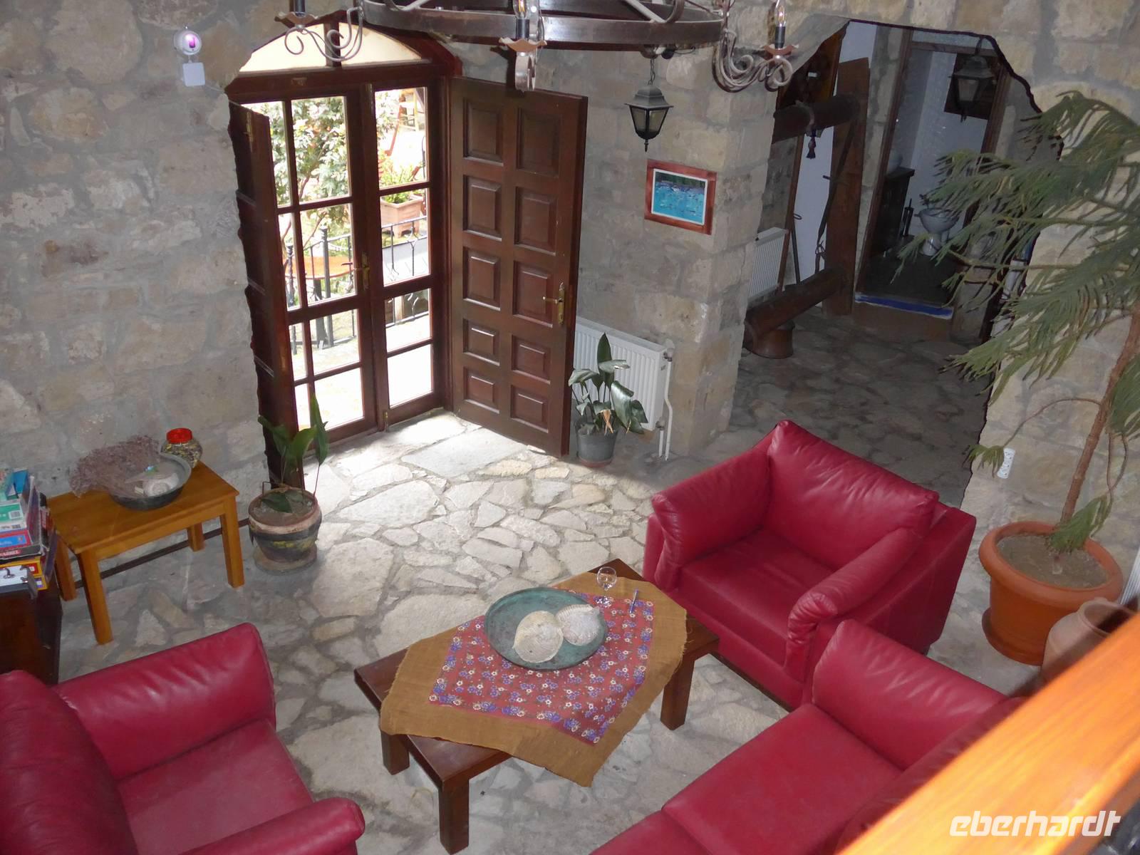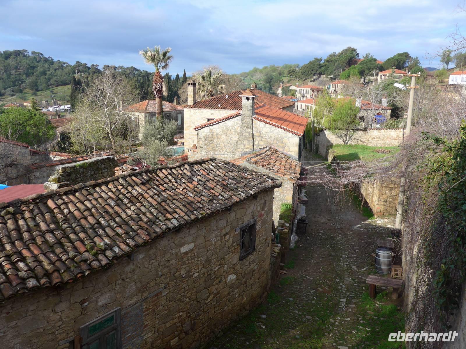 Auf der Fahrt hatten wir tolle neue Straßen kennengelernt und nun ging es die letzten 4 km steil bergan durch Olivenhaine auf einem schmalen Weg mit tollen Ausblicken auf die Küste. Im Bergdorf Adatepe waren Filmaufnahmen und so brachte uns der Bus zu einer Stelle, wo wir dann nur noch zu Fuß weiter kamen. Im Hotel Hünnap Han hatte man für uns den Kamin angeheizt und Tee vorbereitet und so saßen wir erst einmal gemütlich am Feuer zusammen. Das war die Gelegenheit für eine kurze Vorstellungsrunde aller Reiseteilnehmer. Inzwischen waren die Sachen getrocknet und wir bezogen unsere Zimmer in 2 verschiedenen alten Steinhäusern. Als wir uns zum Abendessen wieder trafen, gab es viel zu erzählen, denn jeder hatte in der kurzen Zeit schon etwas erlebt in diesem "Museums- und Filmdorf". Wir fühlten uns alle sehr wohl und irgendwie auch heimisch.