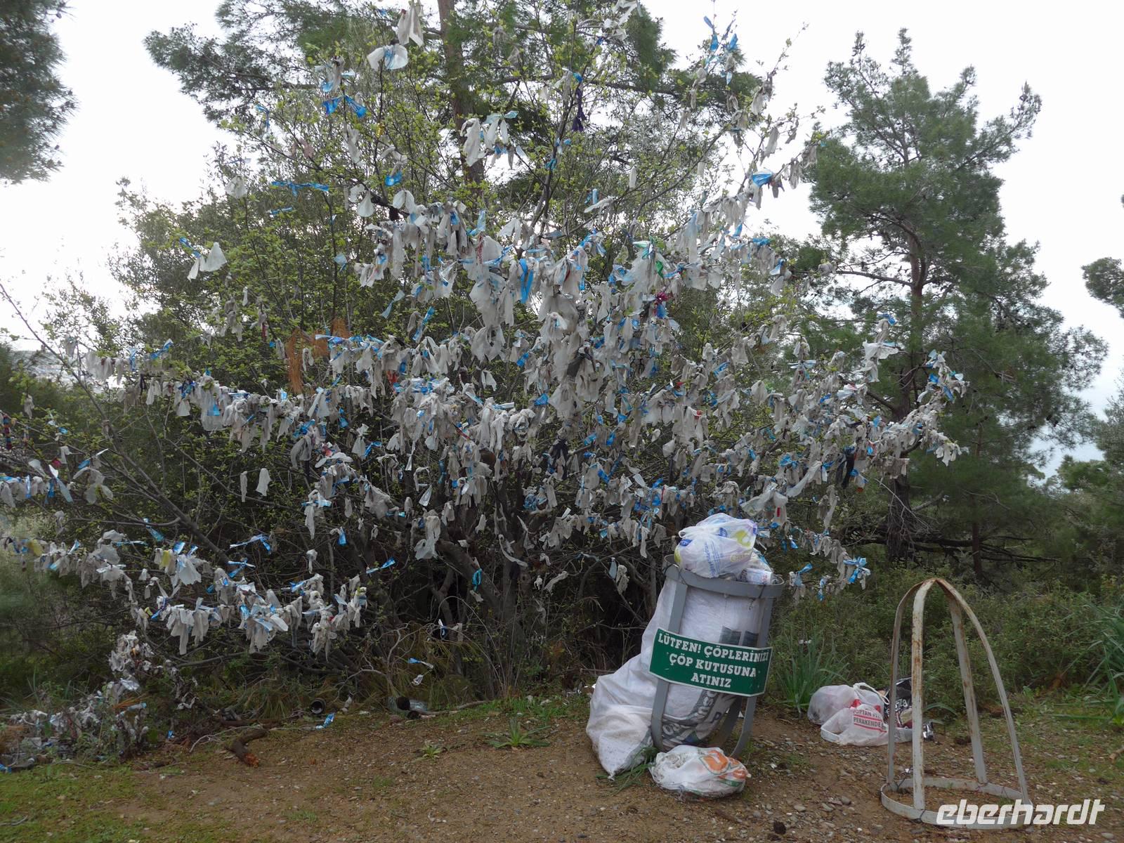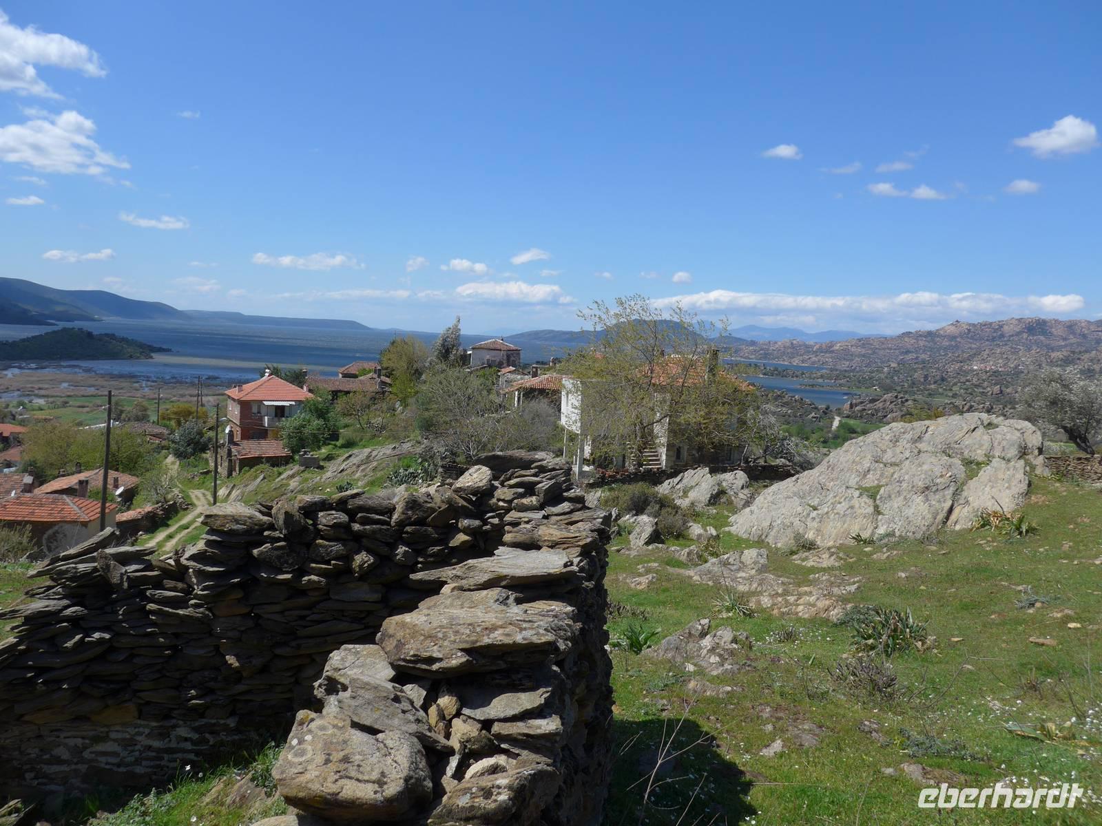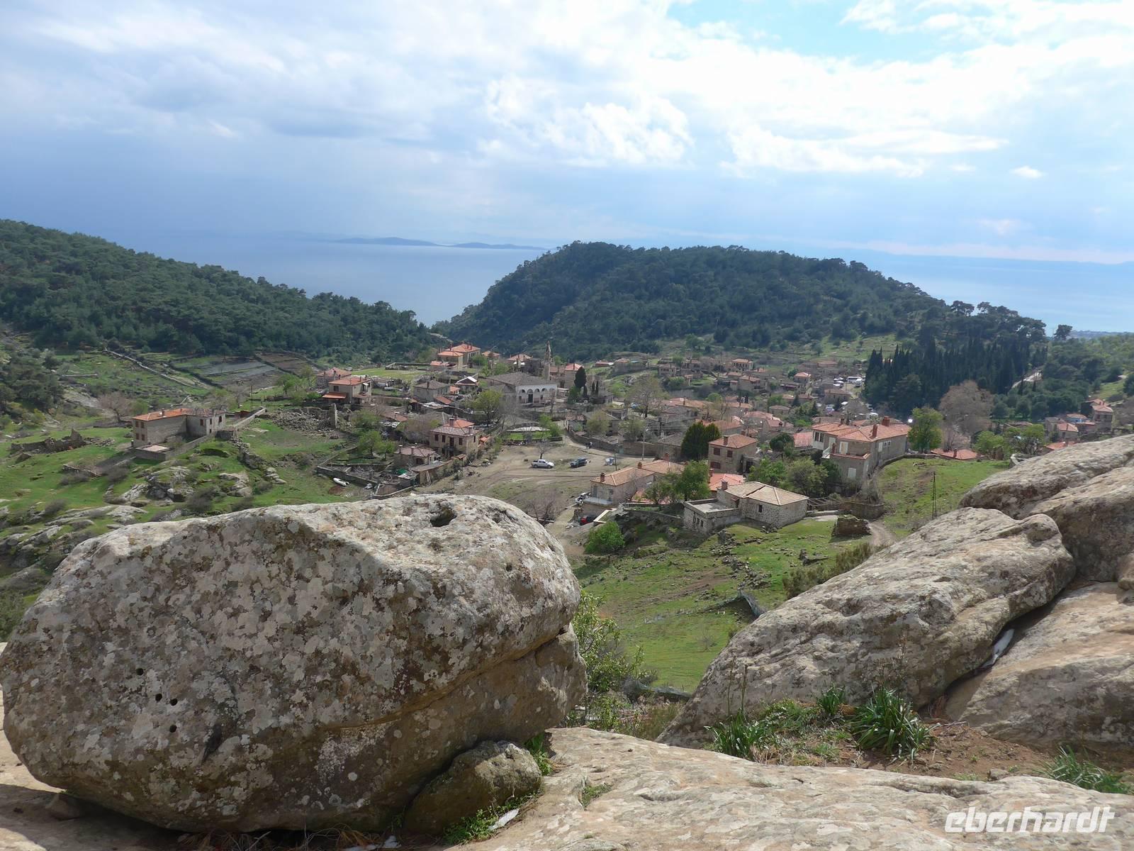 Gut ausgeschlafen trotz starken Gewitters mit Hagel in der Nacht erschienen alle pünktlich zum Frühstück und es gab richtigen Filterkaffee aus der Maschine ! Eine Marmelade war aus den Früchten des Hünnap Baumes, der dem Hotel den Namen gab und diesen Baum sahen wir dann auch im Garten des Hotels. Jeder bekam ein Picknick-Brot und dann liefen wir durch das Dorf zum Zeus-Altar hoch oben über der Küste. Es war ein erster Höhepunkt mit toller Aussicht auf die Küste, die Bucht von Edremit und die griechische Insel Lesbos. Neben Hassan und Sirri begleitete uns Talib, ein junger Mann aus dem Hotel. Von ihm erfuhren wir viel über das Leben im Dorf und über die Karawanenstraße, die wir parallel zur Küste liefen.