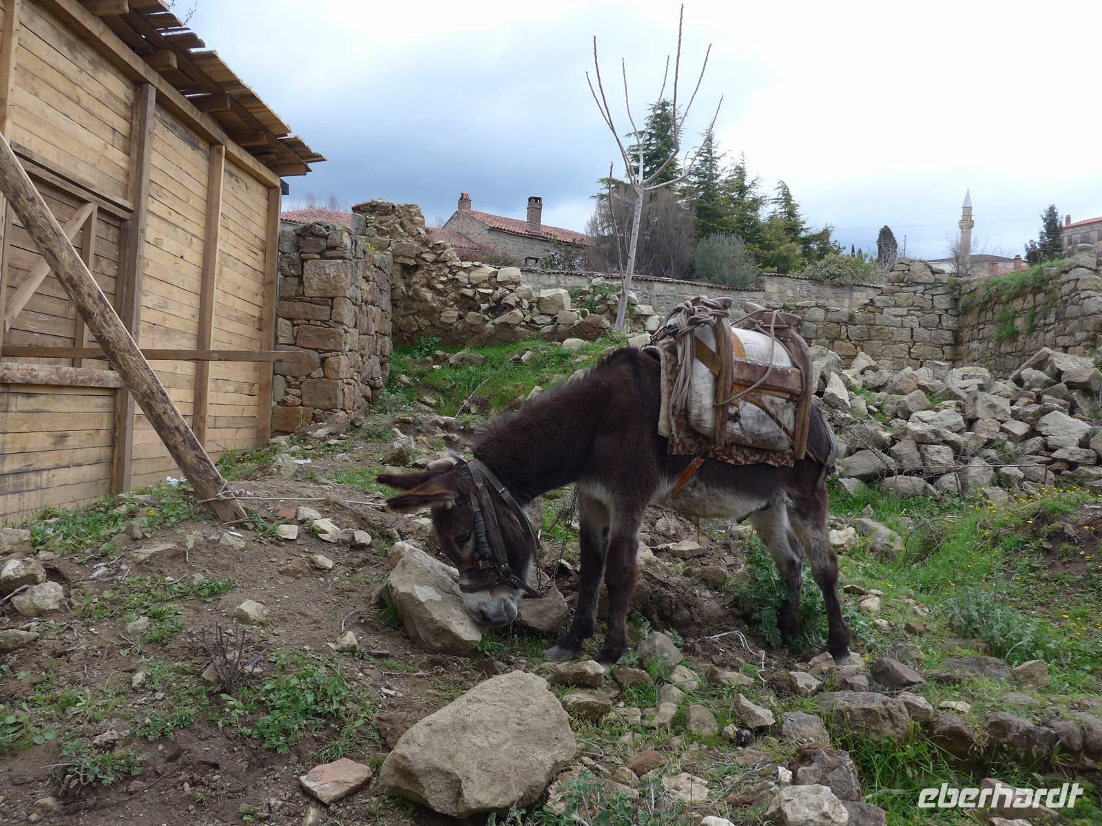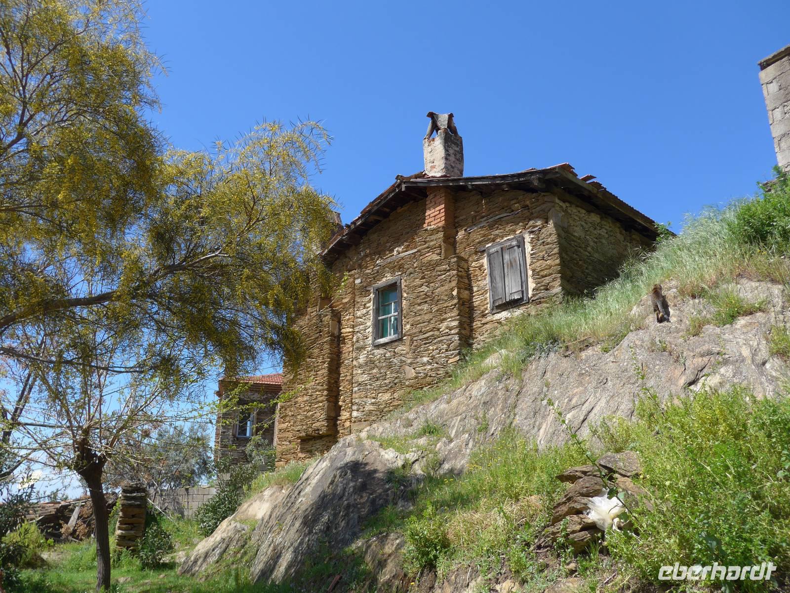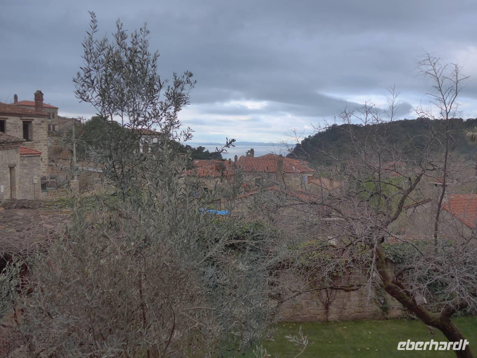 Gut ausgeschlafen trotz starken Gewitters mit Hagel in der Nacht erschienen alle pünktlich zum Frühstück und es gab richtigen Filterkaffee aus der Maschine ! Eine Marmelade war aus den Früchten des Hünnap Baumes, der dem Hotel den Namen gab und diesen Baum sahen wir dann auch im Garten des Hotels. Jeder bekam ein Picknick-Brot und dann liefen wir durch das Dorf zum Zeus-Altar hoch oben über der Küste. Es war ein erster Höhepunkt mit toller Aussicht auf die Küste, die Bucht von Edremit und die griechische Insel Lesbos. Neben Hassan und Sirri begleitete uns Talib, ein junger Mann aus dem Hotel. Von ihm erfuhren wir viel über das Leben im Dorf und über die Karawanenstraße, die wir parallel zur Küste liefen.