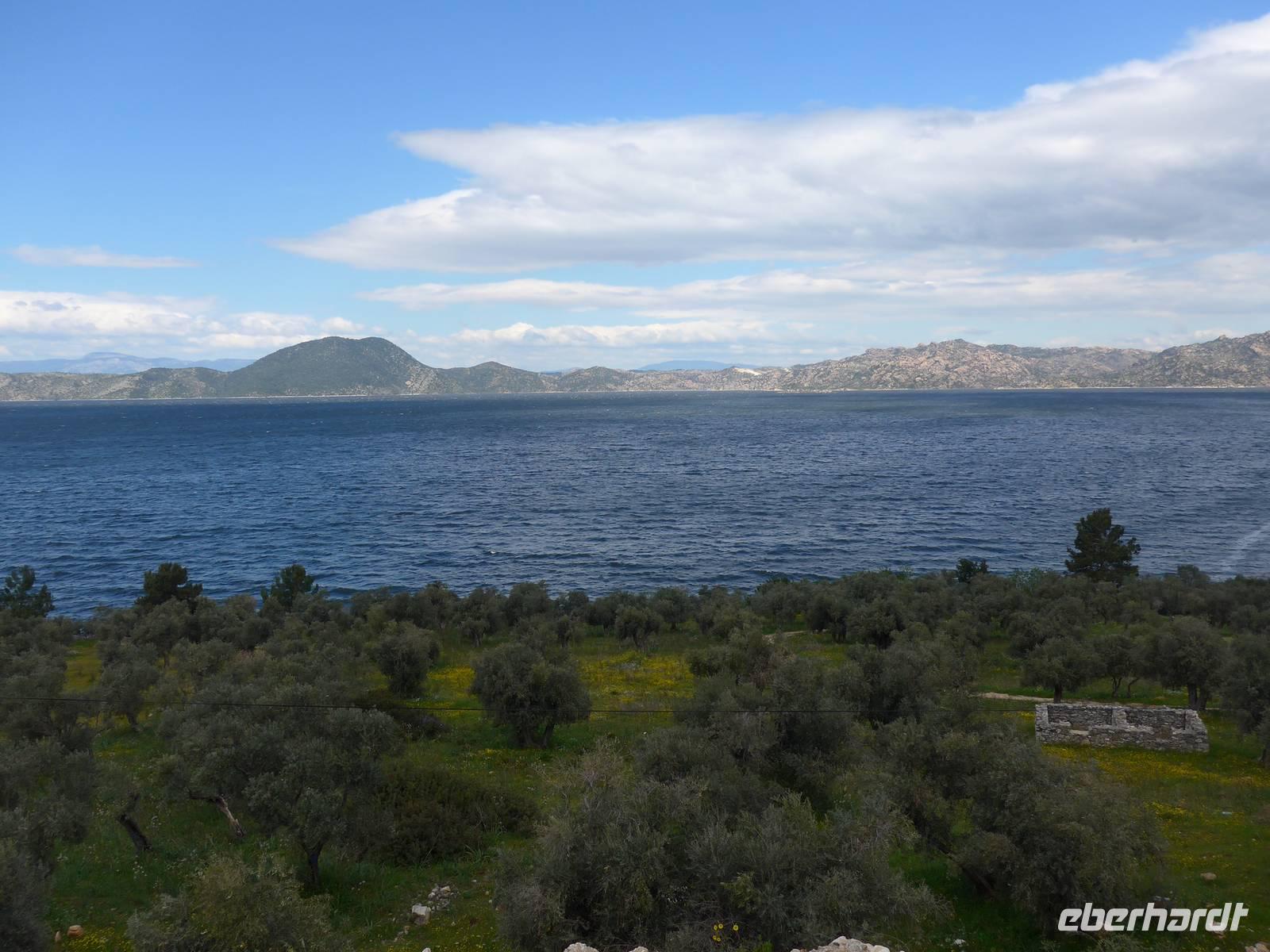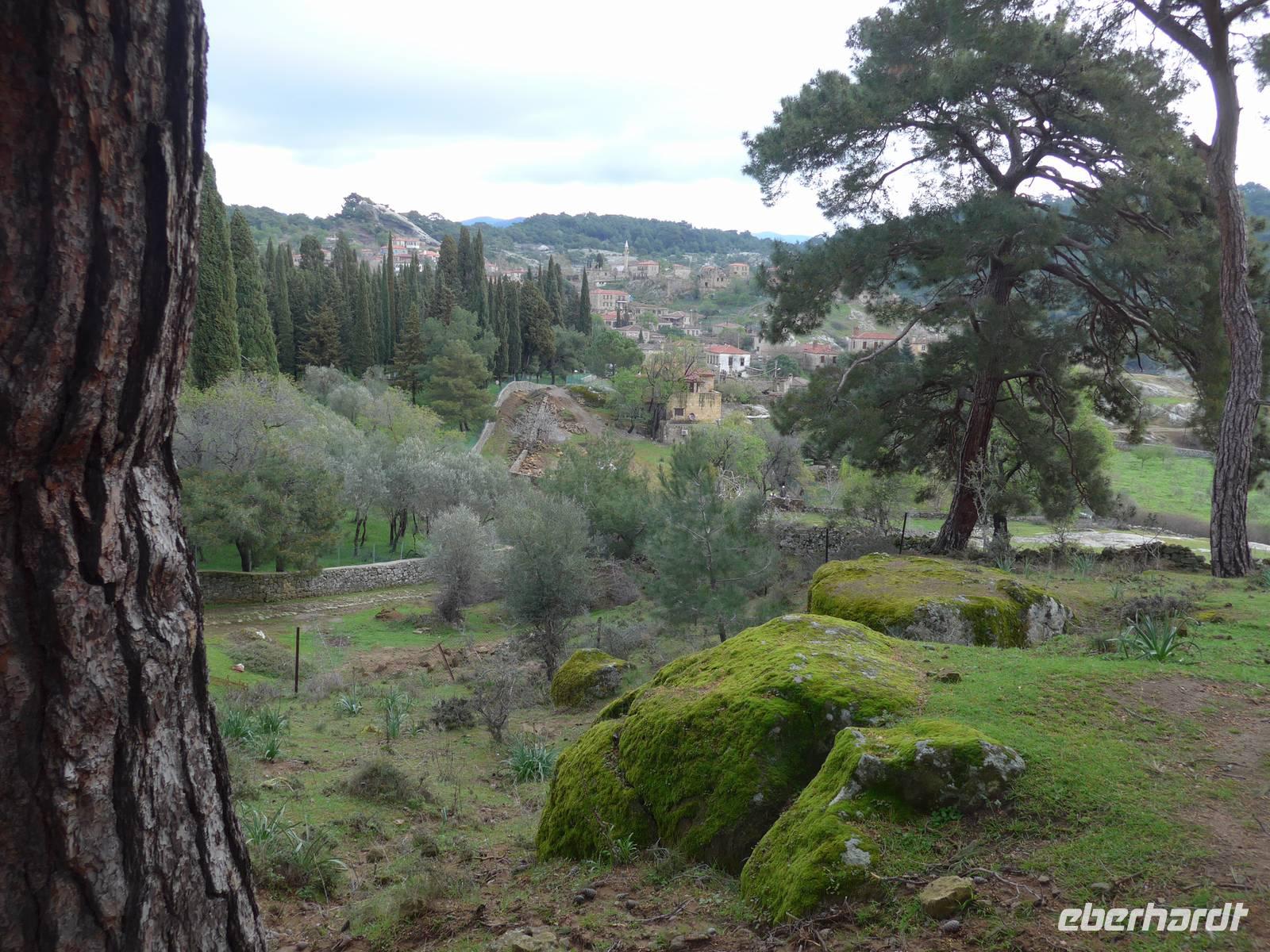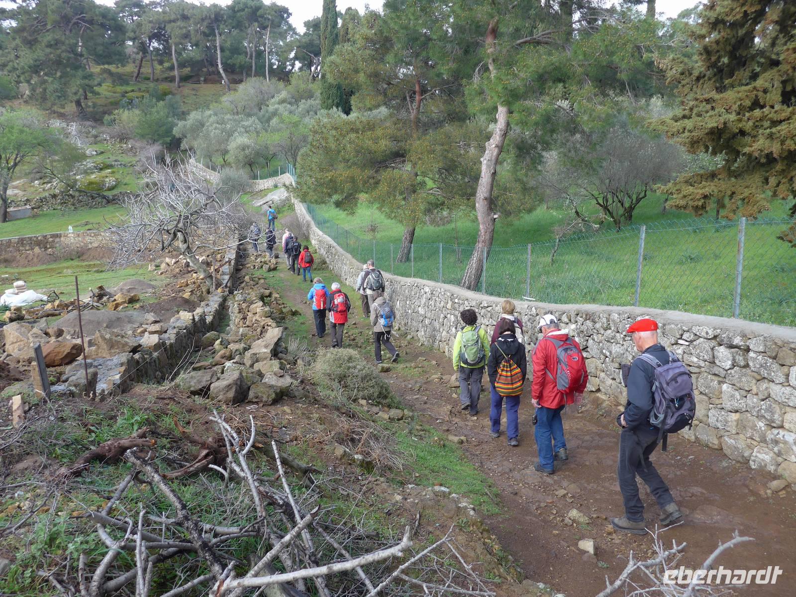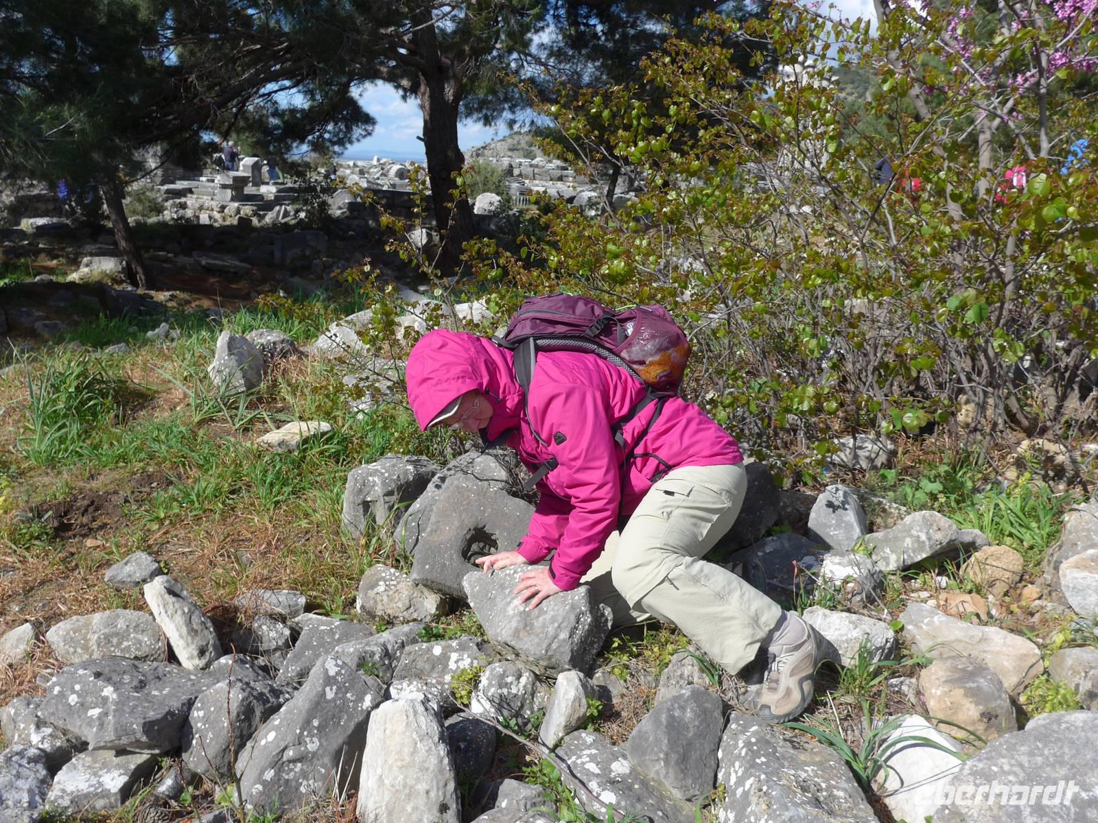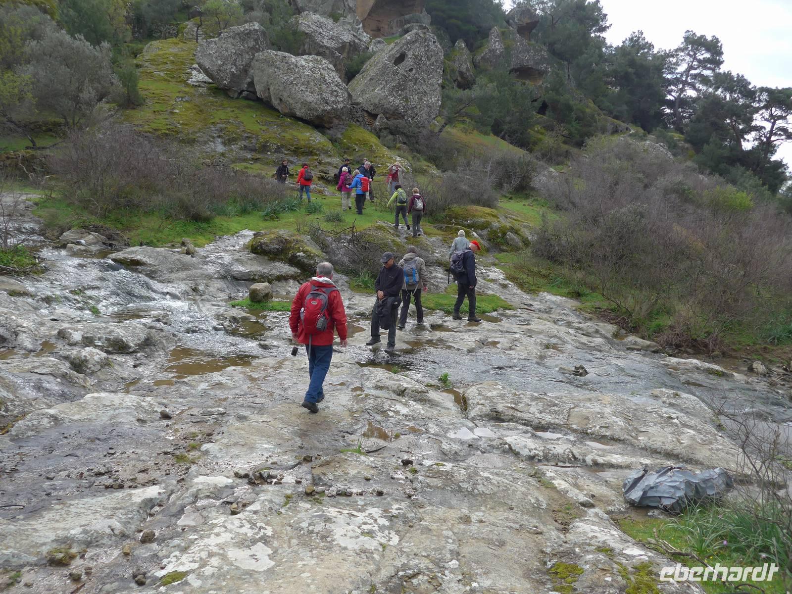 Dann führte die Wanderung durch Olivenhaine und wir sahen sogar eine Landschildkröte. Die vielen Frühjahrsblüher erfreuten besonders die "Biologen" unter uns. Gegen Mittag erreichten wir den Wasserfall und stiegen hinunter, um unten unser Picknick zu verzehren. Die Wanderung war bis dahin schon recht kräftezehrend vor allem wegen der aufgeweichten Wege. Deshalb rief Hassan unseren Bus und so konnte, wer wollte zurück fahren. Die meisten aber gingen zu Fuß wieder steil bergan und kurz vor Adatepe auf einen Aussichtsfelsen hoch über dem Ort mit Blick zum Zeus-Altar und auf das Meer. Unsere Wanderung war 15 km lang und mit je 550 Höhenmetern recht anspruchsvoll.