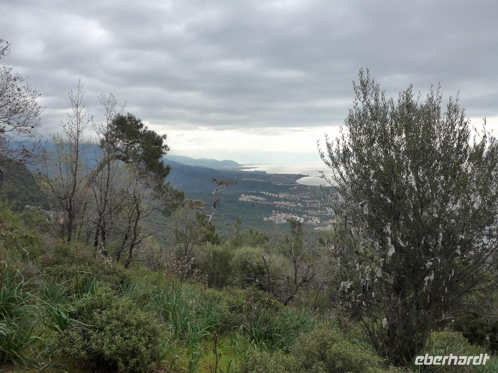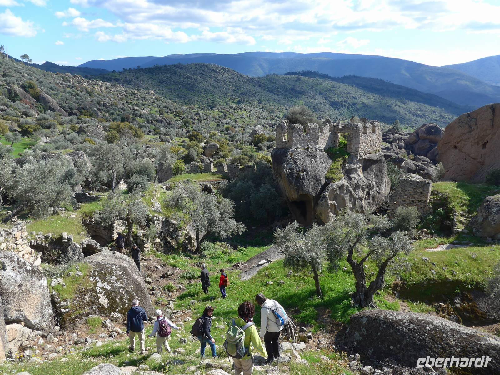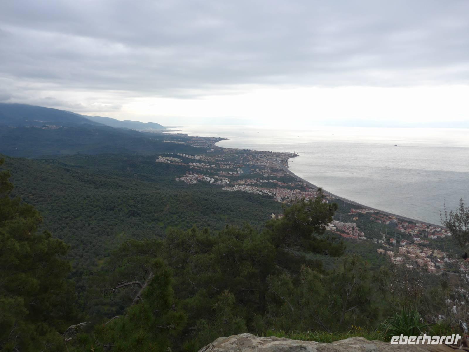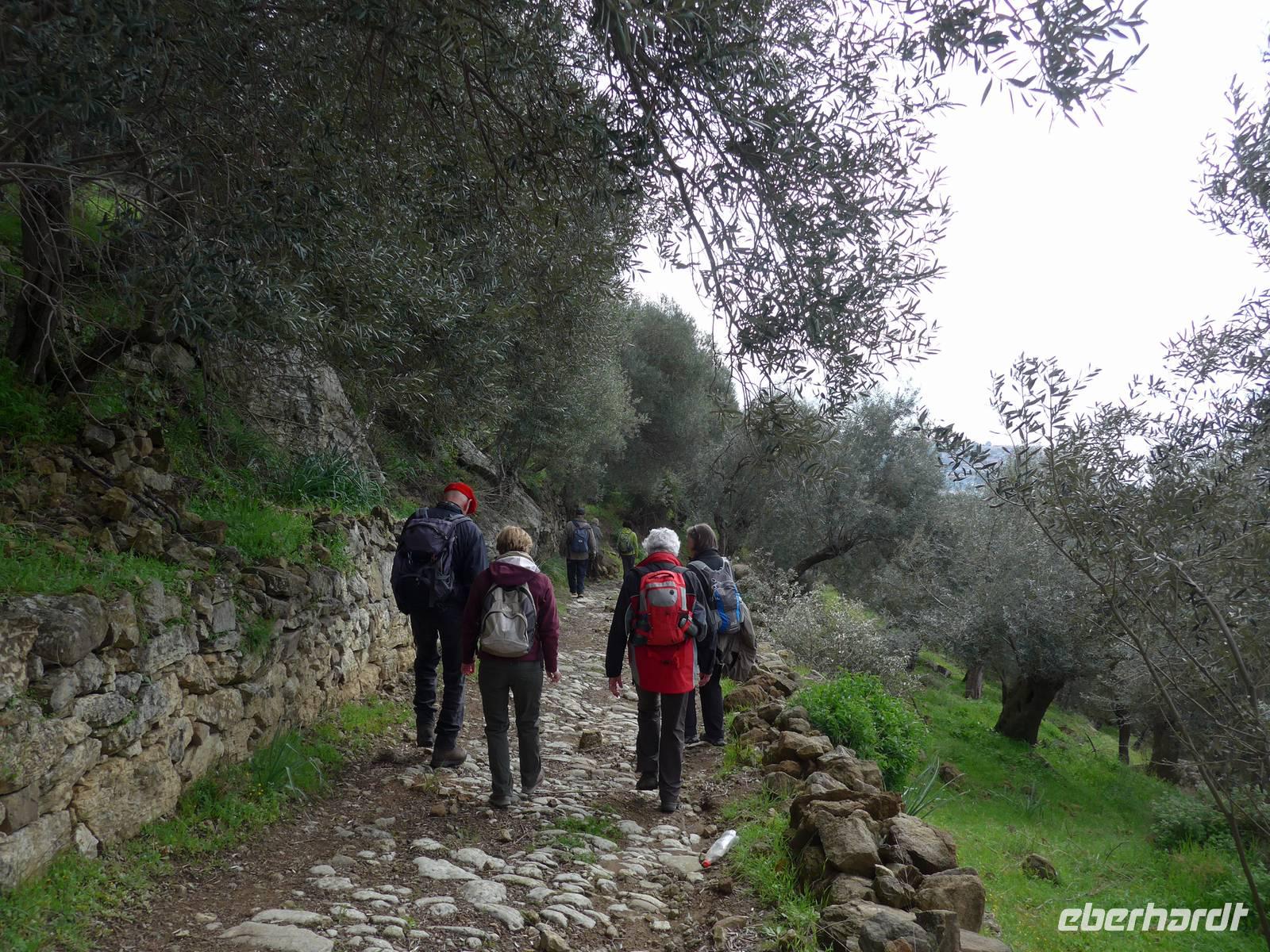 Dann führte die Wanderung durch Olivenhaine und wir sahen sogar eine Landschildkröte. Die vielen Frühjahrsblüher erfreuten besonders die "Biologen" unter uns. Gegen Mittag erreichten wir den Wasserfall und stiegen hinunter, um unten unser Picknick zu verzehren. Die Wanderung war bis dahin schon recht kräftezehrend vor allem wegen der aufgeweichten Wege. Deshalb rief Hassan unseren Bus und so konnte, wer wollte zurück fahren. Die meisten aber gingen zu Fuß wieder steil bergan und kurz vor Adatepe auf einen Aussichtsfelsen hoch über dem Ort mit Blick zum Zeus-Altar und auf das Meer. Unsere Wanderung war 15 km lang und mit je 550 Höhenmetern recht anspruchsvoll.