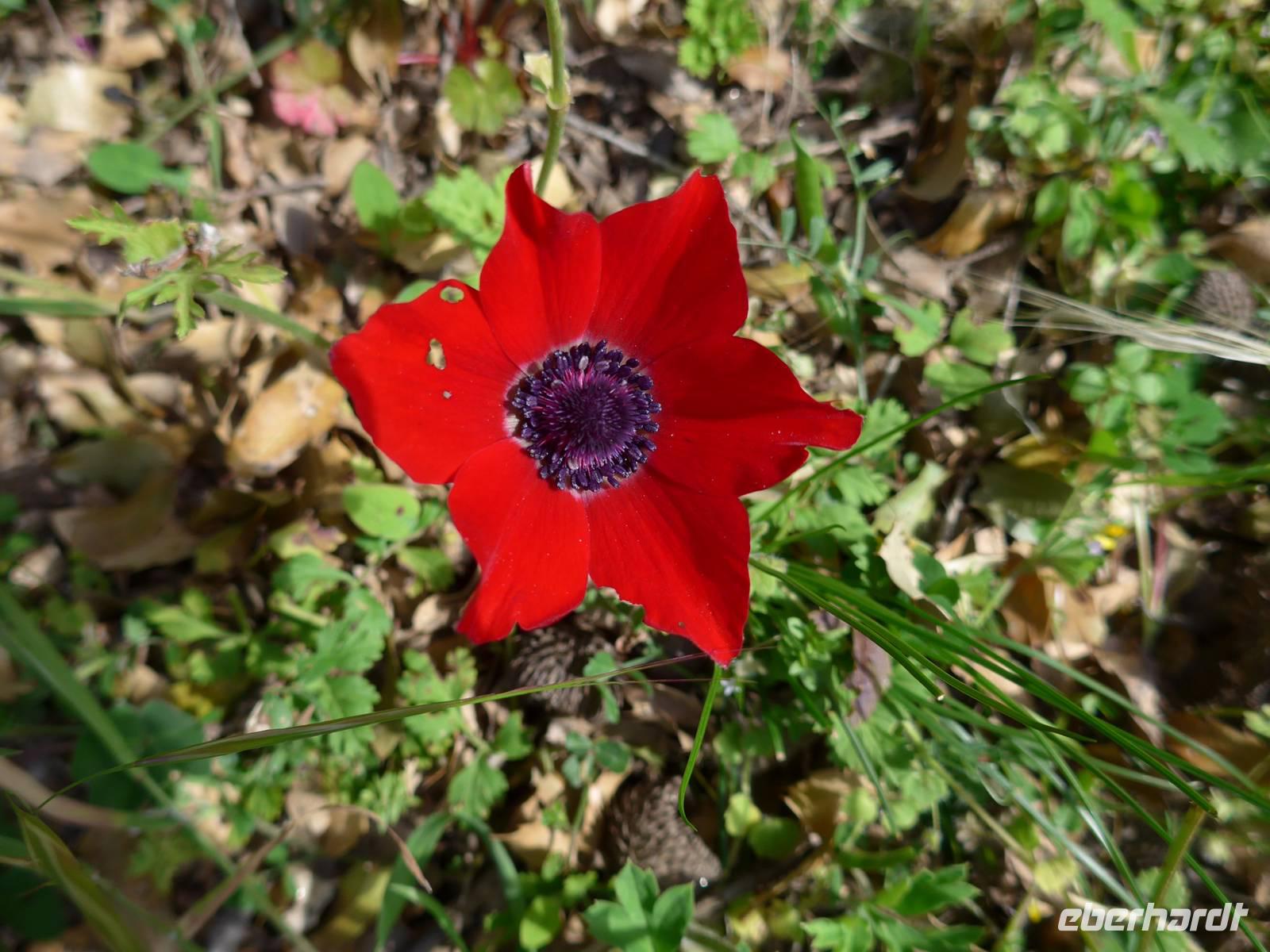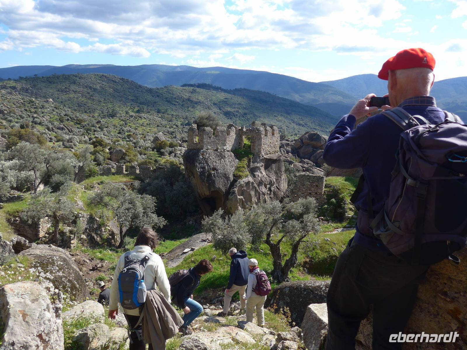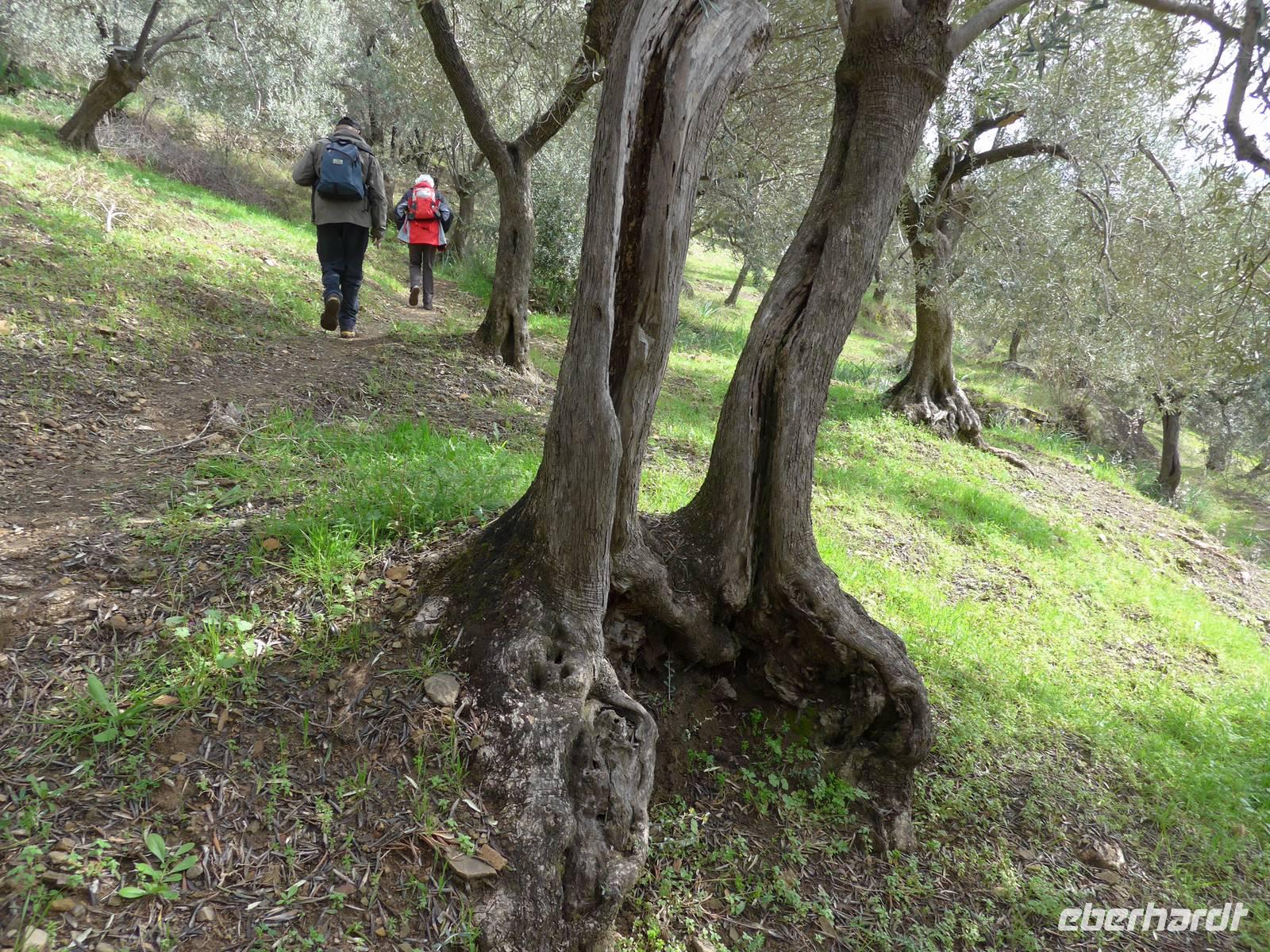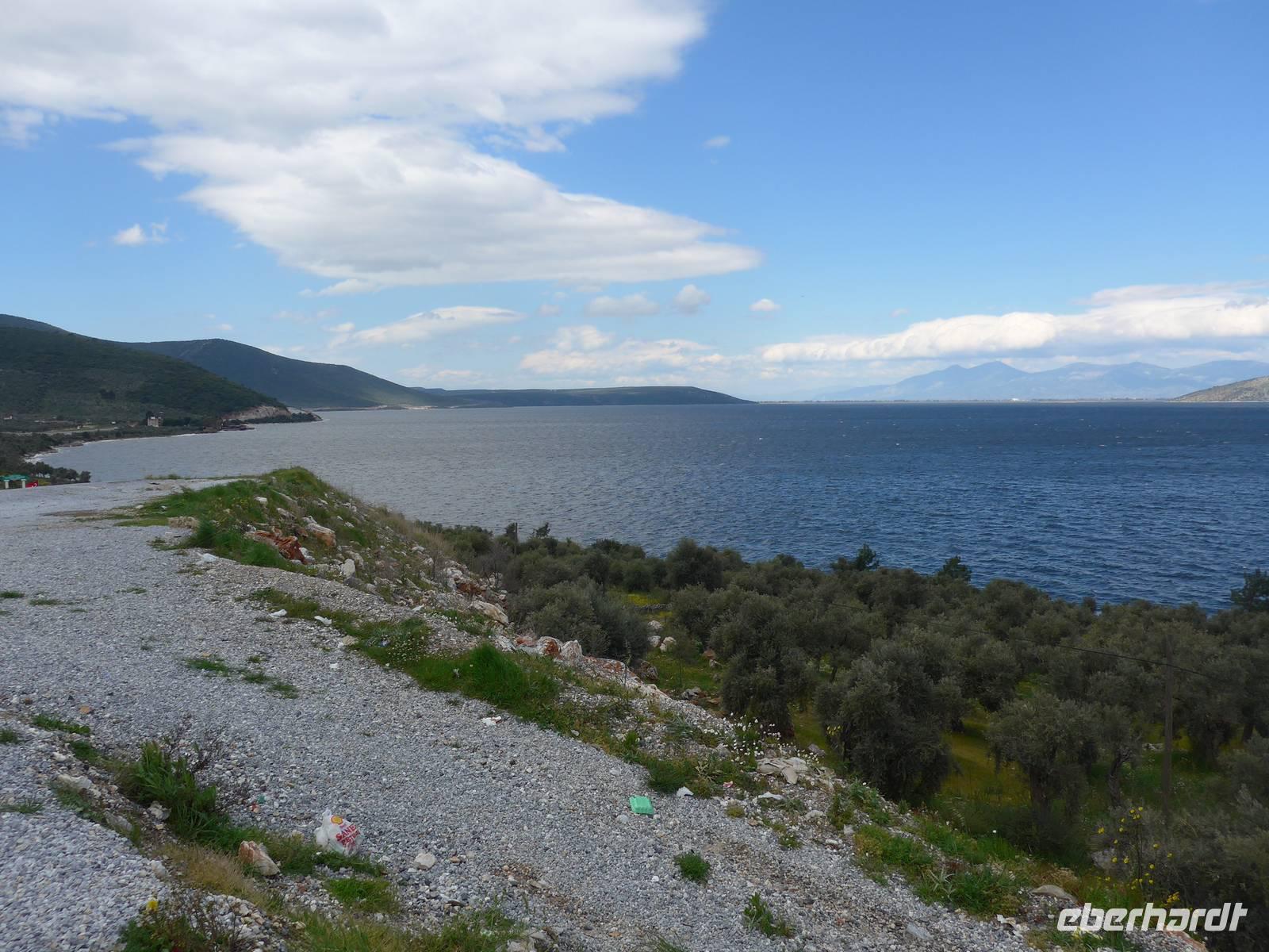 Dann führte die Wanderung durch Olivenhaine und wir sahen sogar eine Landschildkröte. Die vielen Frühjahrsblüher erfreuten besonders die "Biologen" unter uns. Gegen Mittag erreichten wir den Wasserfall und stiegen hinunter, um unten unser Picknick zu verzehren. Die Wanderung war bis dahin schon recht kräftezehrend vor allem wegen der aufgeweichten Wege. Deshalb rief Hassan unseren Bus und so konnte, wer wollte zurück fahren. Die meisten aber gingen zu Fuß wieder steil bergan und kurz vor Adatepe auf einen Aussichtsfelsen hoch über dem Ort mit Blick zum Zeus-Altar und auf das Meer. Unsere Wanderung war 15 km lang und mit je 550 Höhenmetern recht anspruchsvoll.