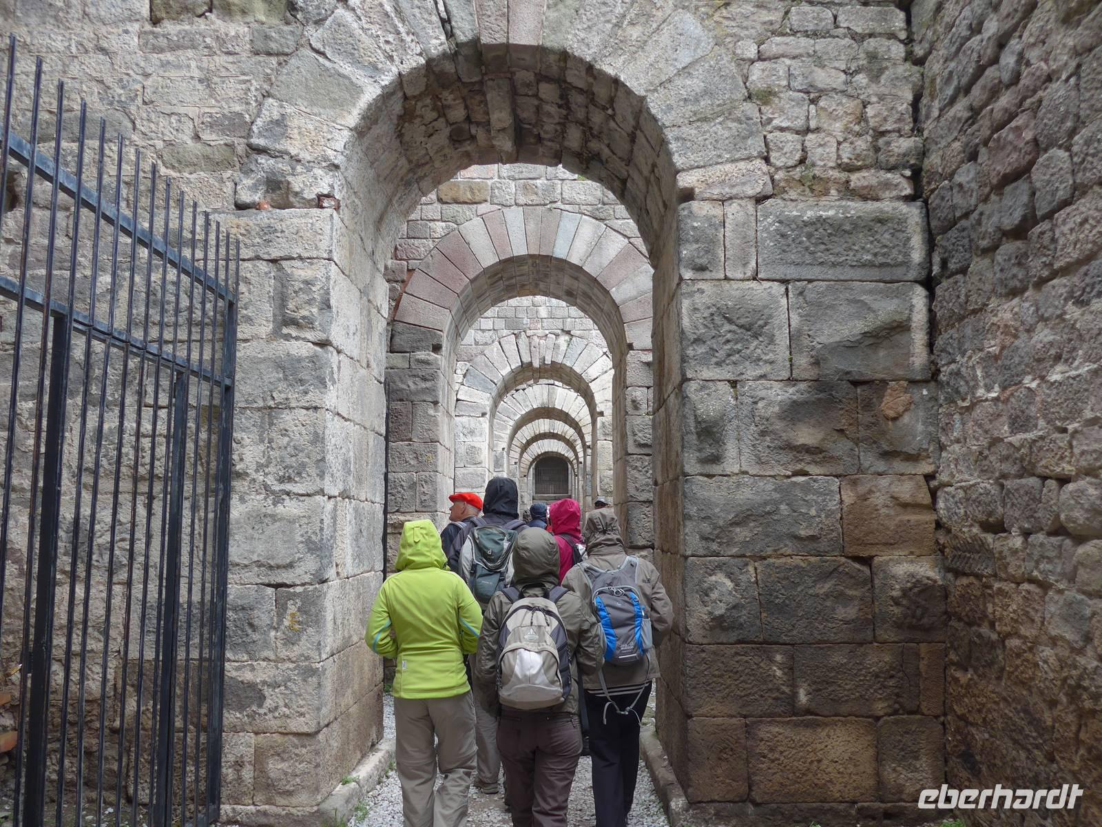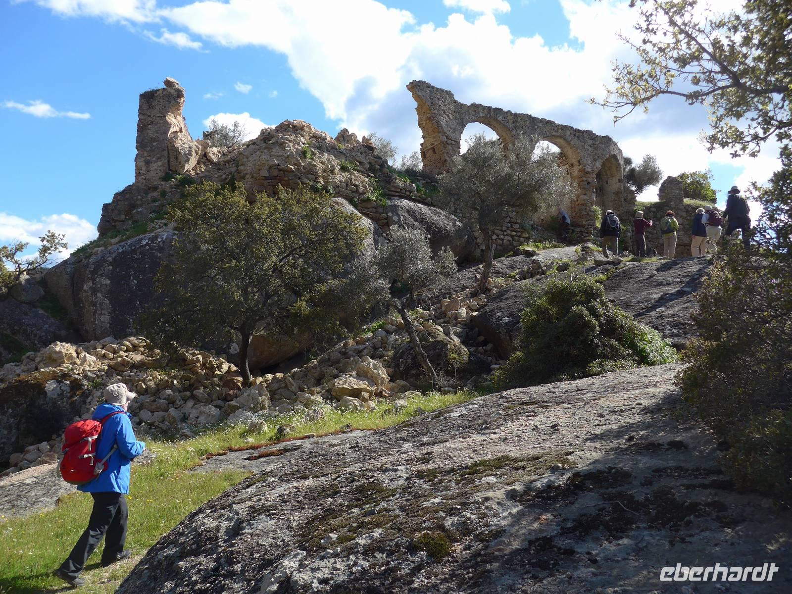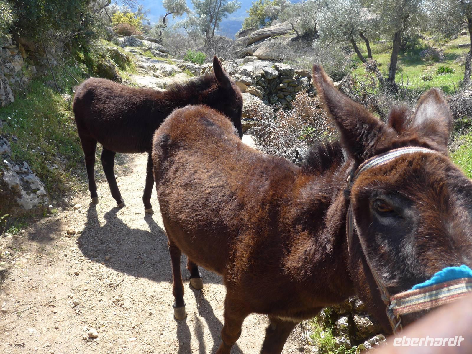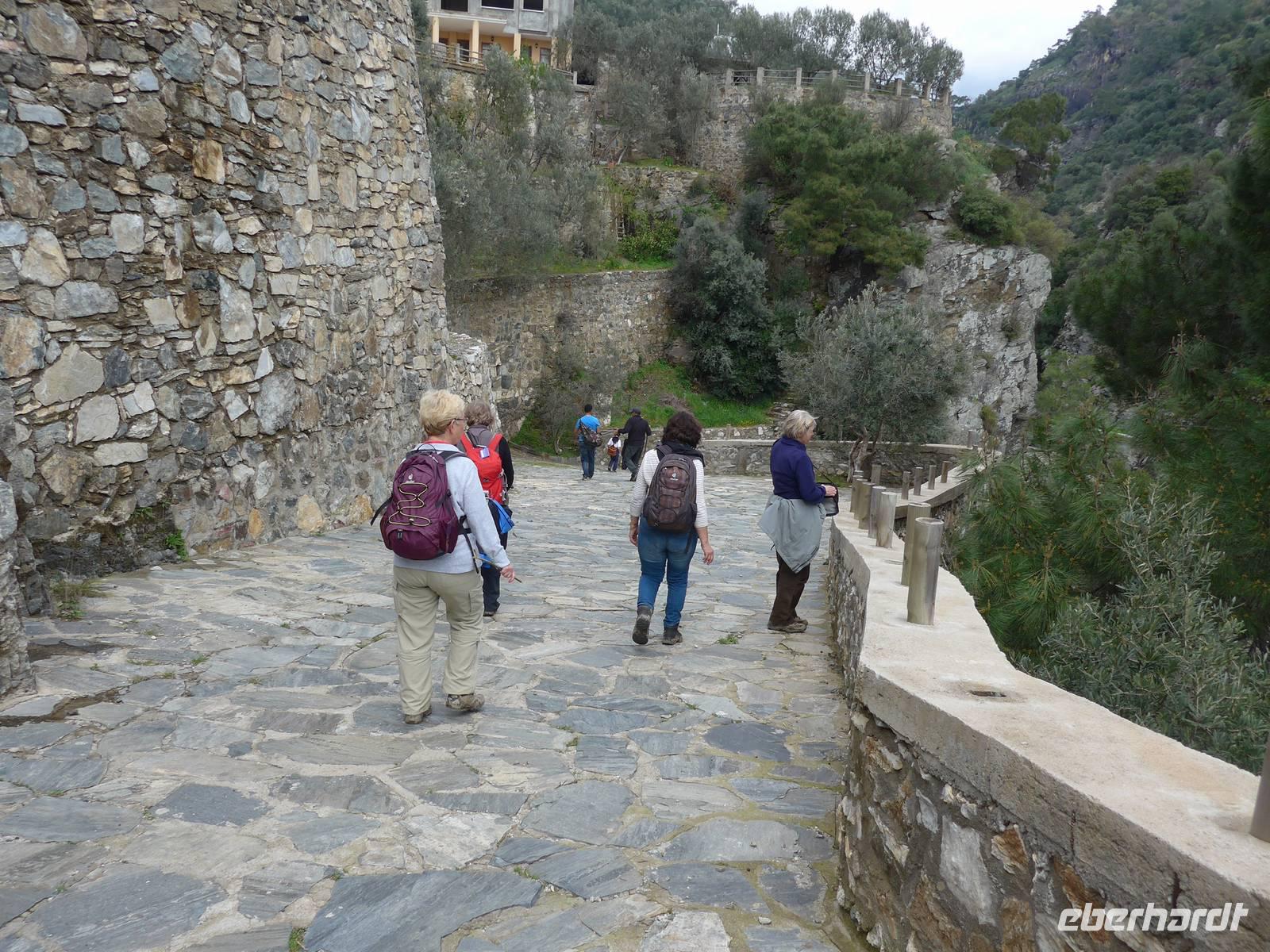 Im Dorf Gölyaka verließen wir unseren Bus und bekamen noch einen Führer aus dem Dorf für unsere Wanderung. Zunächst führte der WEG durch das Dorf immer steil bergan. Weiter ging es vorbei an Olivenhainen, Weideflächen von Kühen und Eseln durch eine blühende Natur. Anemonen und Schopflavendel standen voll in Blüte. Vor dem Kloster kamen wir zu Felsmalereien, die christliche Szenen zeigten. Allein hätten wir diesen Schatz nicht gefunden. Vor dem Kloster machten wir Picknick in der Sonne und genossen die Ruhe in den Bergen. Die Tour war der krönende Abschluß unserer wunderschönen Wander Reise Westtürkei. Von der Klosterruine hatten wir einen schönen Blick auf den Bafa See. Er war einst das Ende eines Fjords und mit dem Meer verbunden. Durch Verlandung wurde er vom Meer abgeschnitten und langsam zu einem Süßwassersee. Unsere Wanderrung war ca. 7 km lang und wir mußten 230 Höhemmeter hinauf und hinunter gehen.