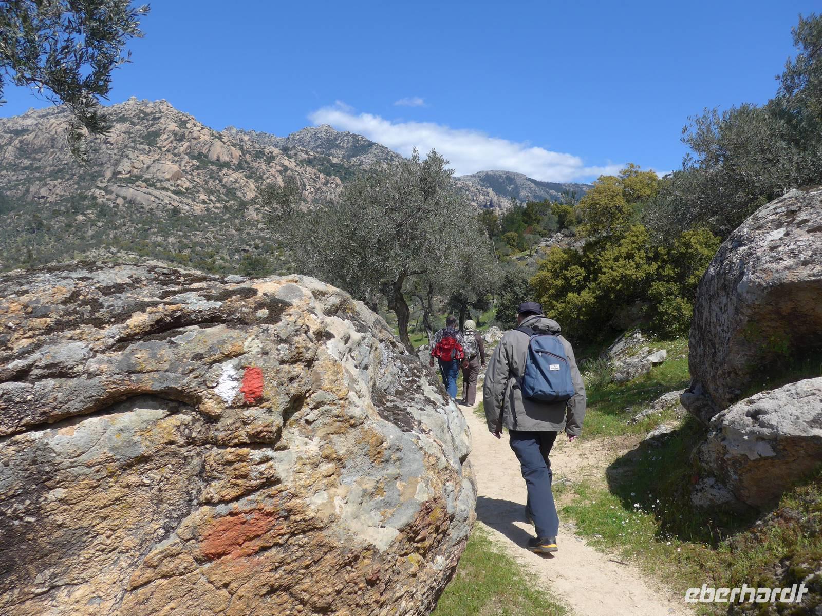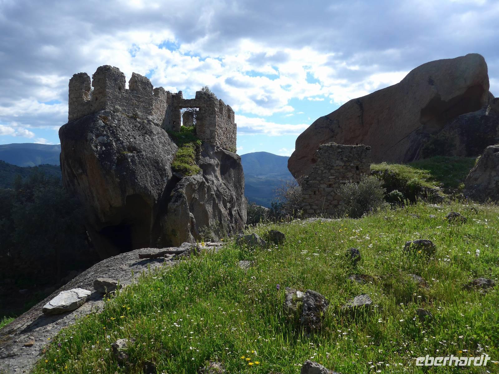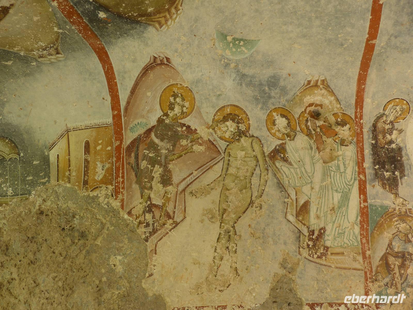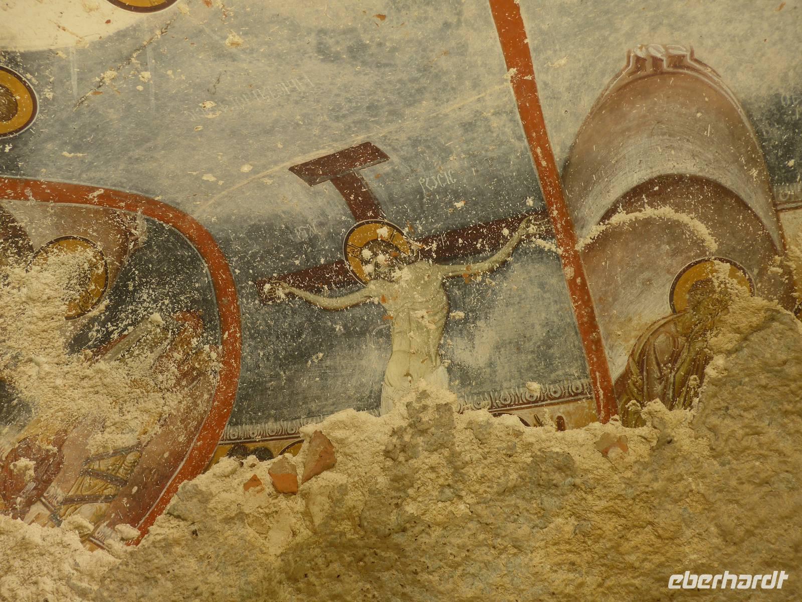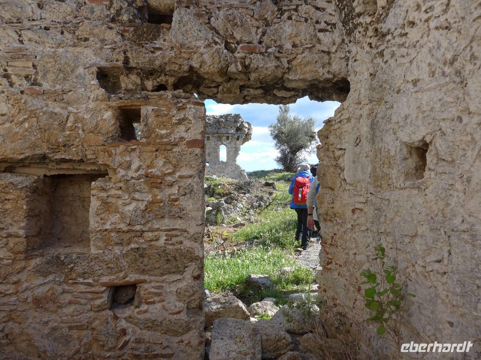 Im Dorf Gölyaka verließen wir unseren Bus und bekamen noch einen Führer aus dem Dorf für unsere Wanderung. Zunächst führte der WEG durch das Dorf immer steil bergan. Weiter ging es vorbei an Olivenhainen, Weideflächen von Kühen und Eseln durch eine blühende Natur. Anemonen und Schopflavendel standen voll in Blüte. Vor dem Kloster kamen wir zu Felsmalereien, die christliche Szenen zeigten. Allein hätten wir diesen Schatz nicht gefunden. Vor dem Kloster machten wir Picknick in der Sonne und genossen die Ruhe in den Bergen. Die Tour war der krönende Abschluß unserer wunderschönen Wander Reise Westtürkei. Von der Klosterruine hatten wir einen schönen Blick auf den Bafa See. Er war einst das Ende eines Fjords und mit dem Meer verbunden. Durch Verlandung wurde er vom Meer abgeschnitten und langsam zu einem Süßwassersee. Unsere Wanderrung war ca. 7 km lang und wir mußten 230 Höhemmeter hinauf und hinunter gehen.