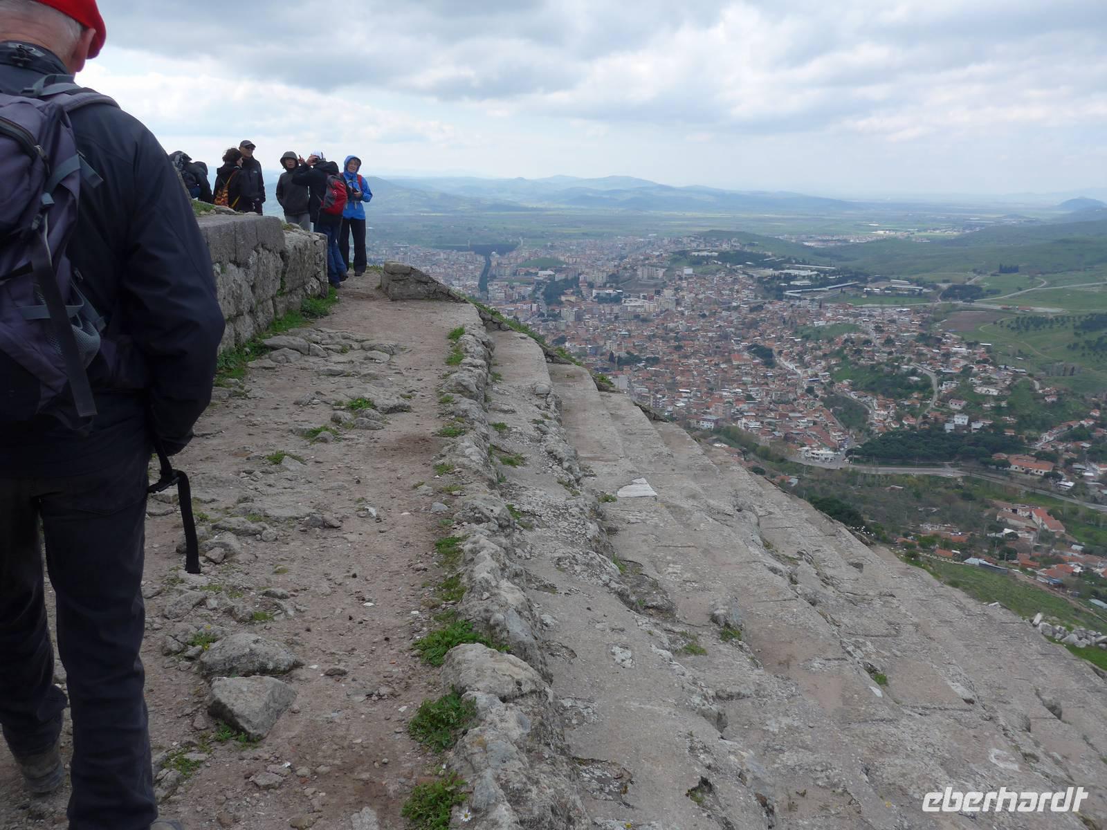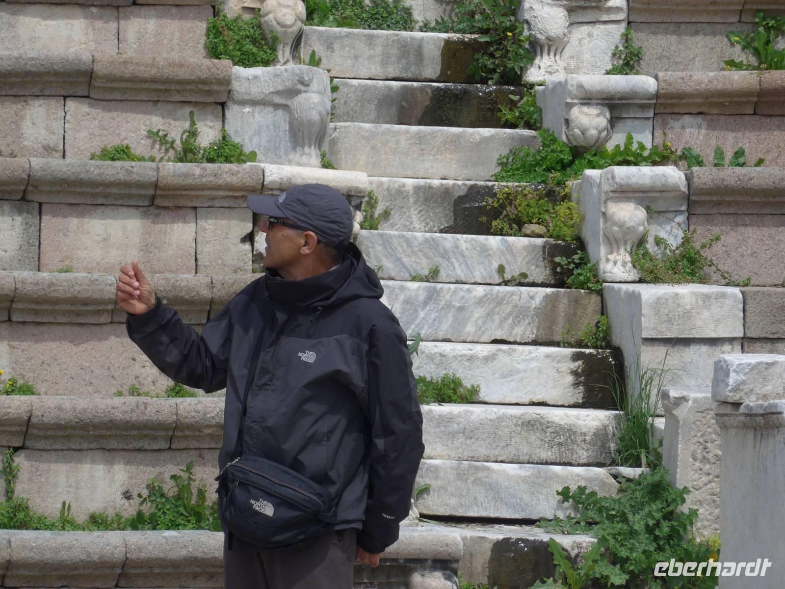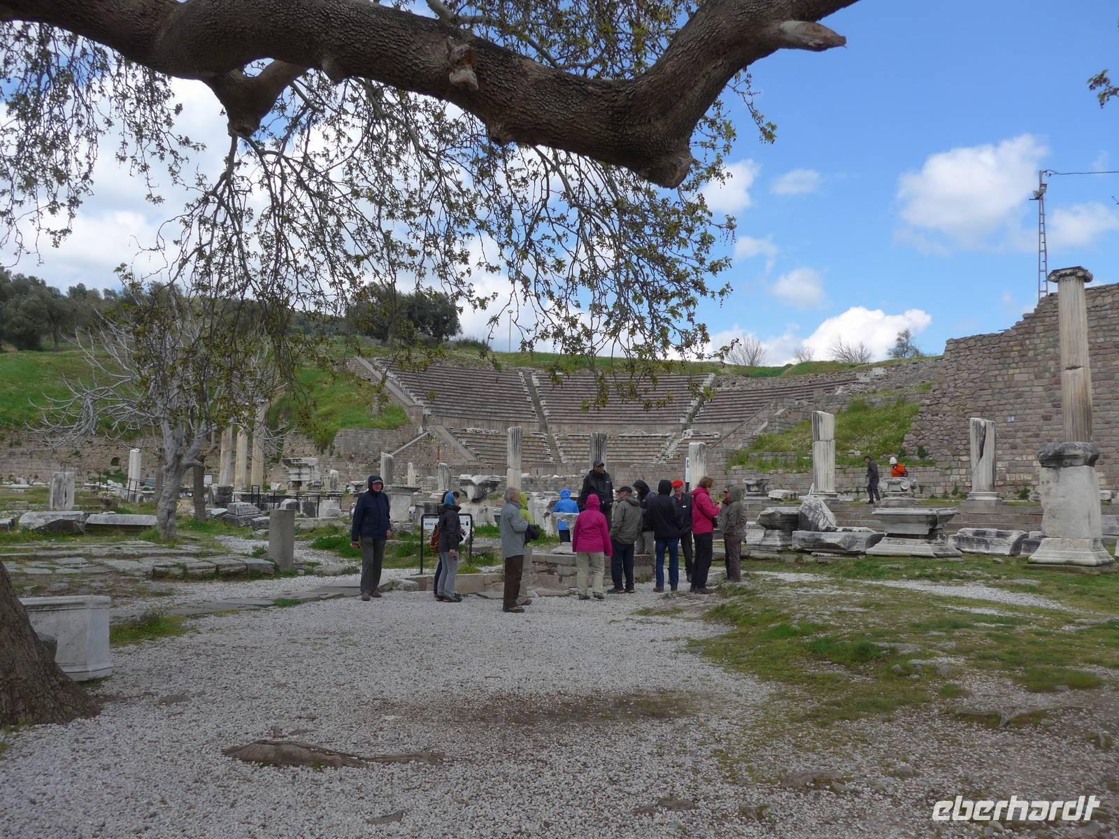 Wehmütig verließen wir nach dem Frühstück das Hotel Hünnap Han zu Fuß und fuhren mit unserem Bus immer entlang der Küste nach Pergamon. Es war mit 3 Grad Celsius recht frisch und oben auf dem Burgberg von Pergamon wehte ein starker Wind. Irgendwie hatten wir uns das Wetter zu Ostern in der Ägäis anders vorgestellt. Aber die Besichtigung von Pergamon war sehr beeindruckend und Hassan bot uns mit seinen ausführlichen Erzählungern einen guten Einblick in das Leben in der Antike. Am Ende der Führung trafen wir uns bei einem heißen Tee bevor wir weiter fuhren zum Asklepion. Dieses medizinische Zentrum der Antike wurde durch Zufall entdeckt. Es wurde im 4.Jahrhundert als Dank für die Heilung von einem Archias gestiftet und unter Kaiser Hadrian weiter ausgebaut. Das Theater ist noch sehr gut erhalten. Theaterbesuche waren damals ein fester Bestandteil einer Kur, die oft mehrere Monate dauerte.