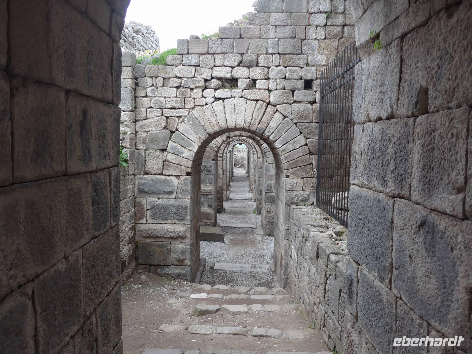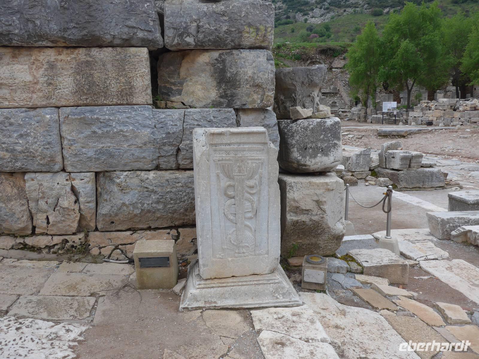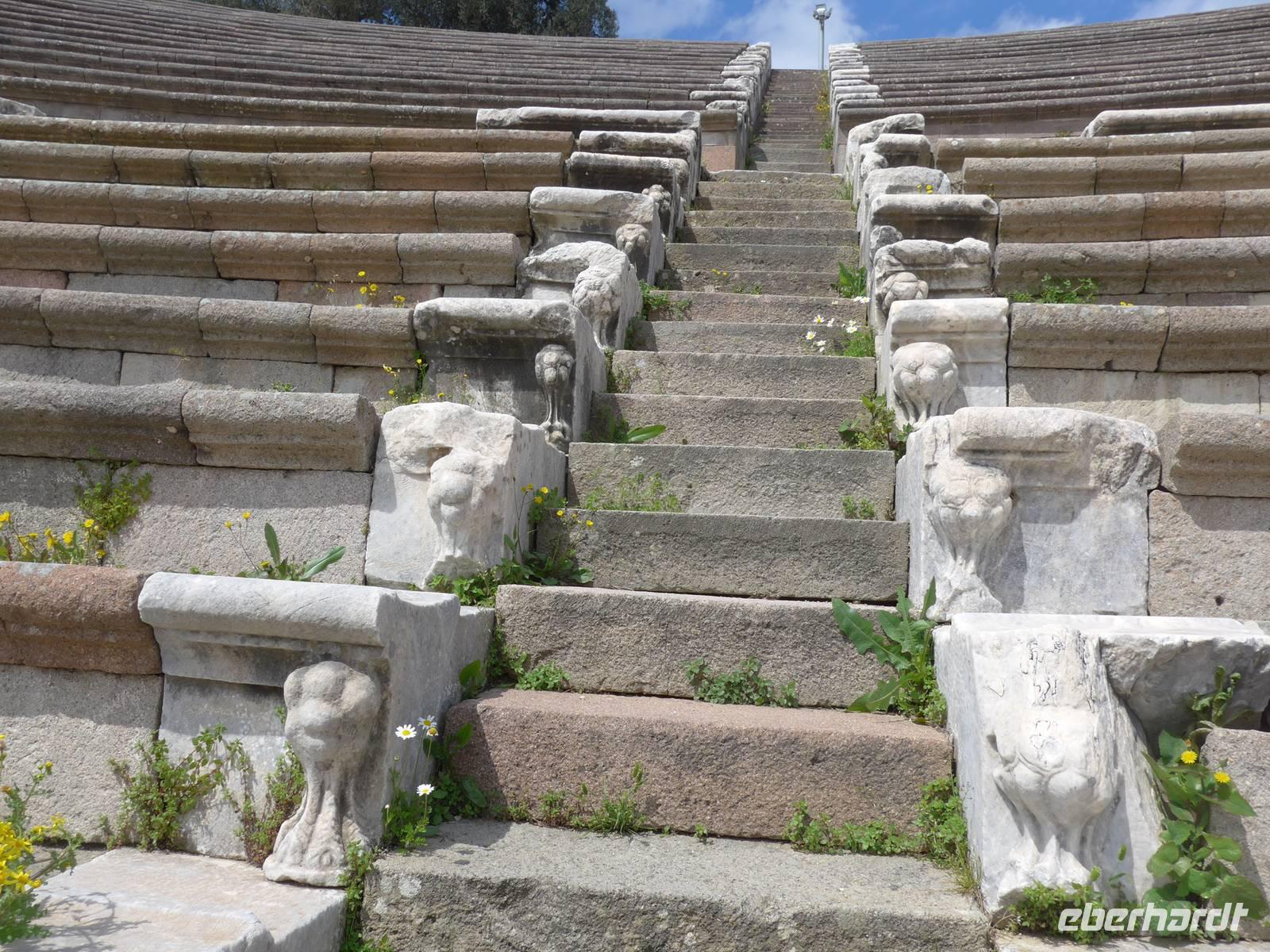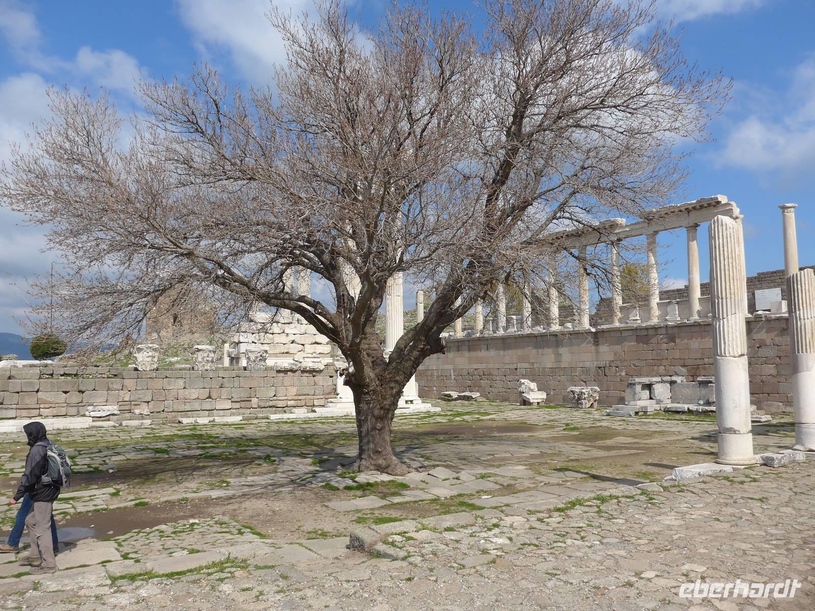 Wehmütig verließen wir nach dem Frühstück das Hotel Hünnap Han zu Fuß und fuhren mit unserem Bus immer entlang der Küste nach Pergamon. Es war mit 3 Grad Celsius recht frisch und oben auf dem Burgberg von Pergamon wehte ein starker Wind. Irgendwie hatten wir uns das Wetter zu Ostern in der Ägäis anders vorgestellt. Aber die Besichtigung von Pergamon war sehr beeindruckend und Hassan bot uns mit seinen ausführlichen Erzählungern einen guten Einblick in das Leben in der Antike. Am Ende der Führung trafen wir uns bei einem heißen Tee bevor wir weiter fuhren zum Asklepion. Dieses medizinische Zentrum der Antike wurde durch Zufall entdeckt. Es wurde im 4.Jahrhundert als Dank für die Heilung von einem Archias gestiftet und unter Kaiser Hadrian weiter ausgebaut. Das Theater ist noch sehr gut erhalten. Theaterbesuche waren damals ein fester Bestandteil einer Kur, die oft mehrere Monate dauerte.