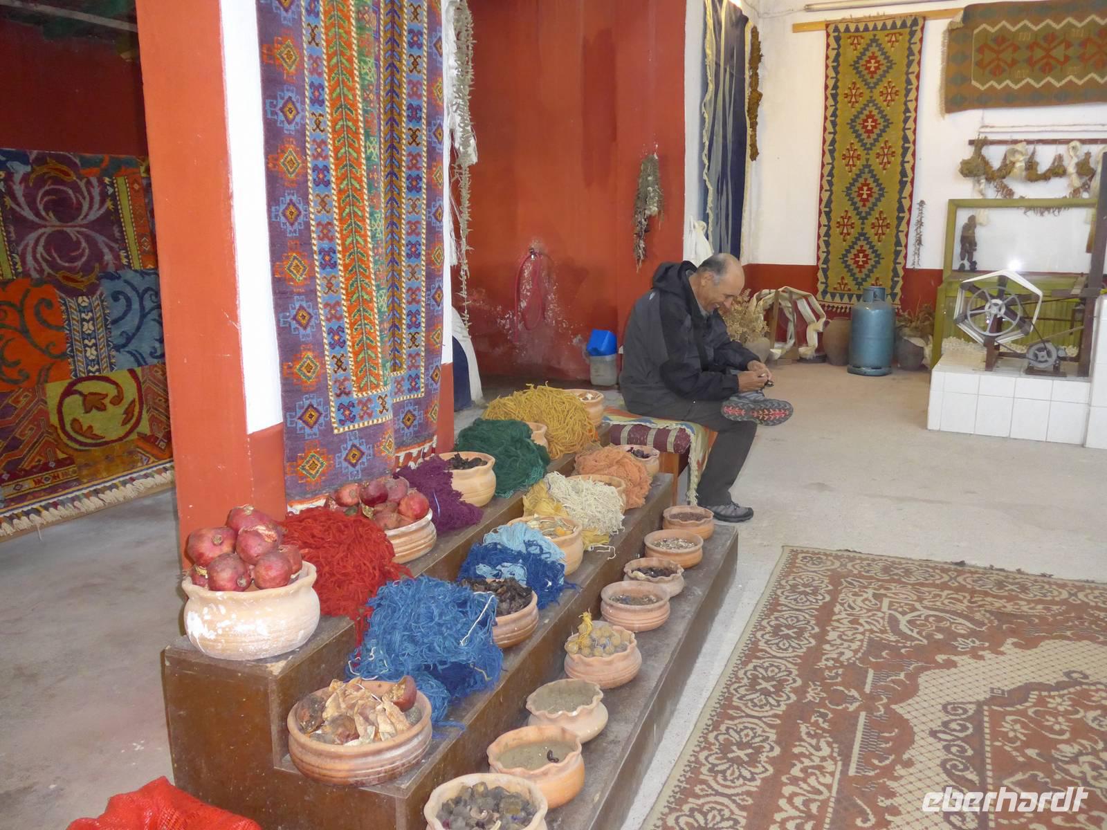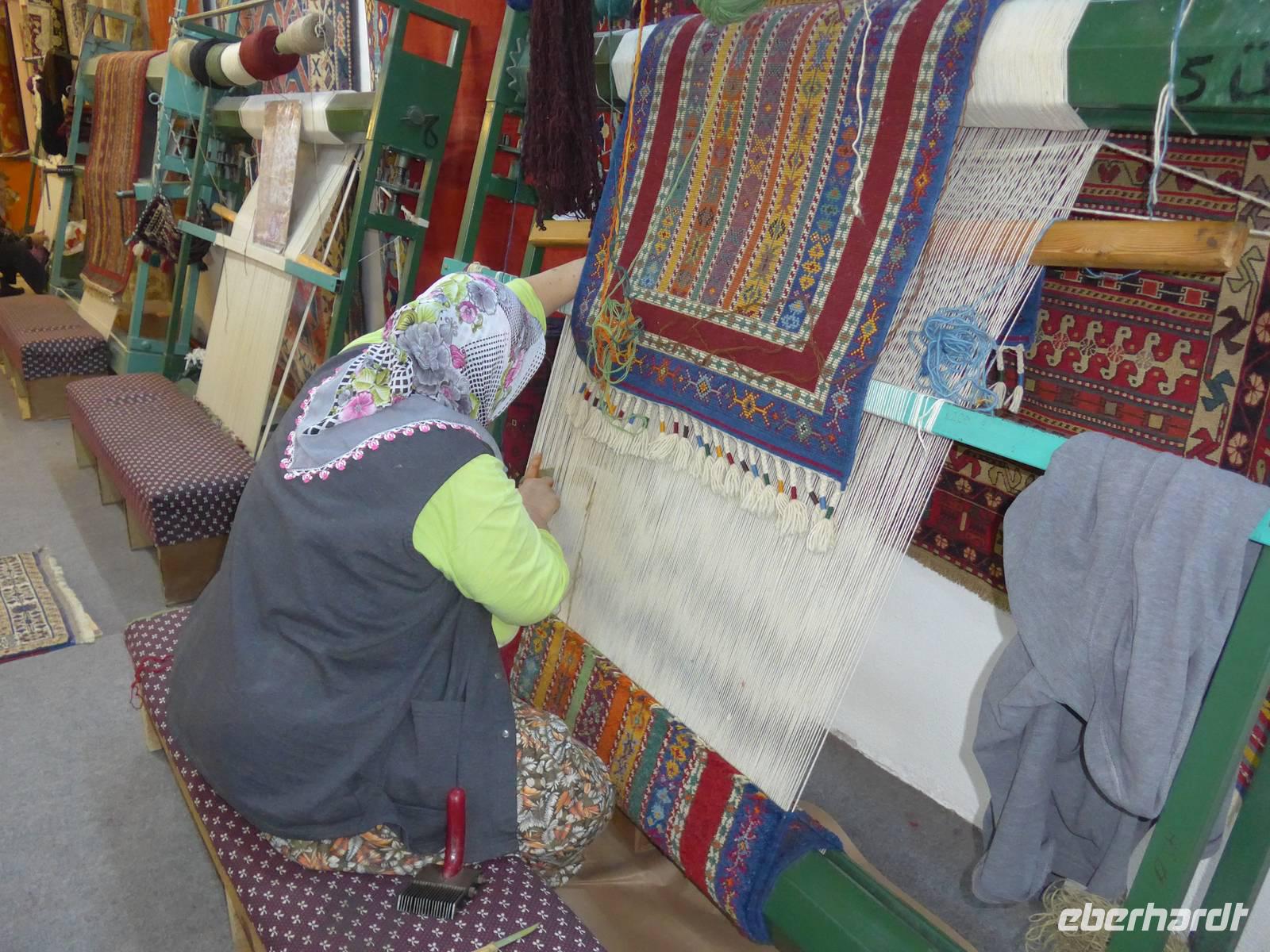 Unsere Mittagspause verbanden wir mit dem Besuch einer Teppichkooperative in einem Dorf nahe Pergamon. Wir wurden zunächst über die Herstellung der Farben und dann über die Produktion von Seide informiert. Die Frauen knüpften traditionelle aber auch moderne Teppiche aus Wolle, Baumwolle und Seide im Gebäude der Kooperative oder sie arbeiten zu Hause. Während wir unseren Mittagsimbiß verzehrten, wurden uns die Teppiche präsentiert und 2 unserer Teilnehmer wurden auch fündig. Es war recht interessant und kein Verkaufsdruck von den Mitarbeitern. Danach ging es wieder zum Bus, denn wir hatten noch 3 Stunden Fahrt bis nach Kusadasi vor uns. Am Hotel verabschiedeten wir uns von unserem Fahrer Ahmed. Er mußte zurück nach Istanbul fahren.