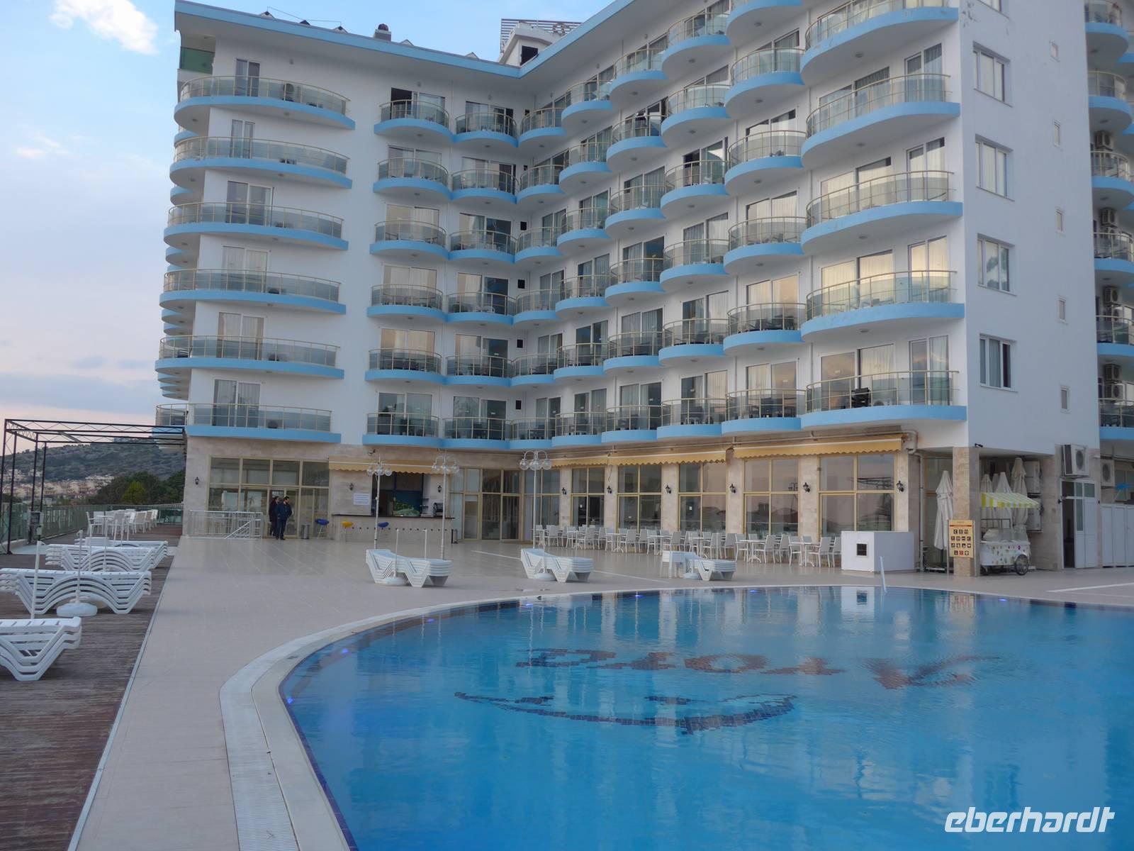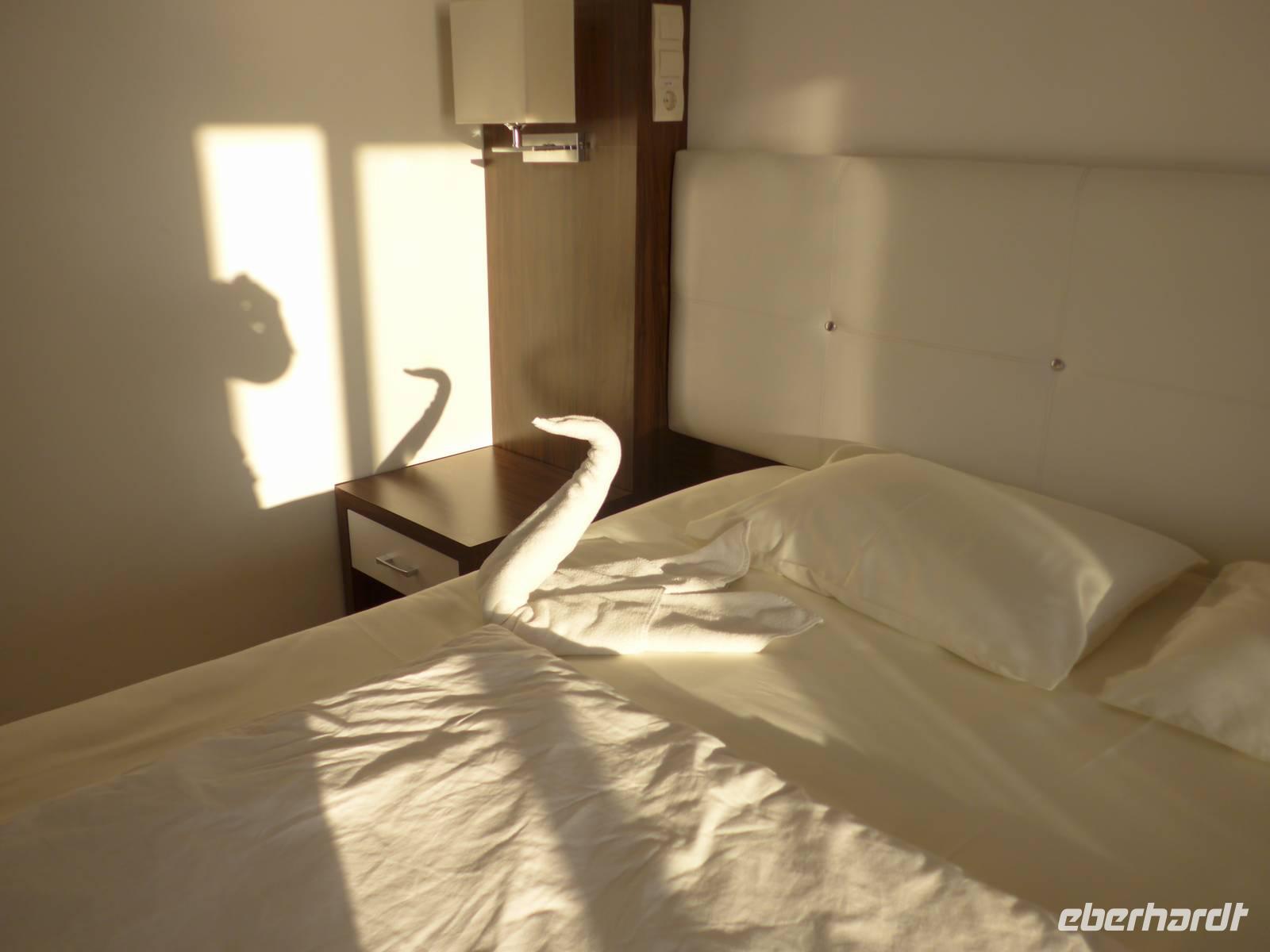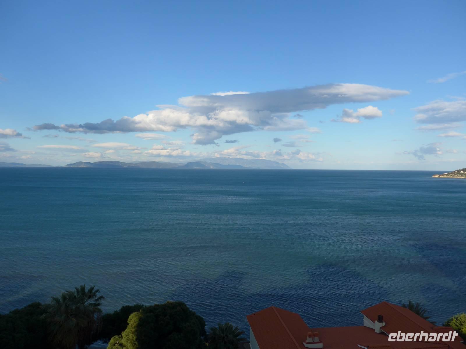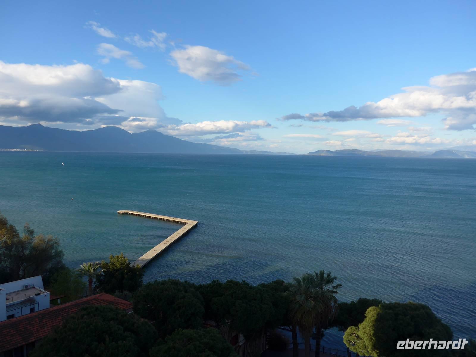 Das Hotel "Aurora" direkt am Meer war so ganz anders als unser gemütliches Bergdorfhotel. Unsere Zimmer in den oberen Etagen boten aber einen tollen Blick zum Sonnenuntergang über das Meer hinüber zur griechischen Insel Samos.