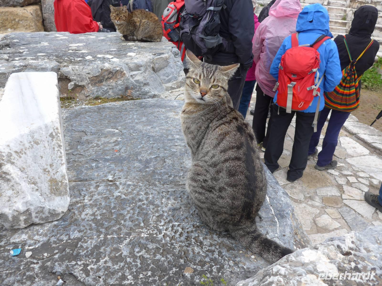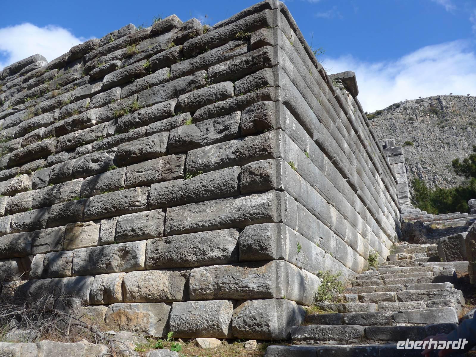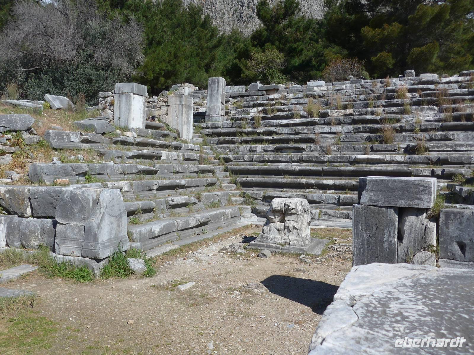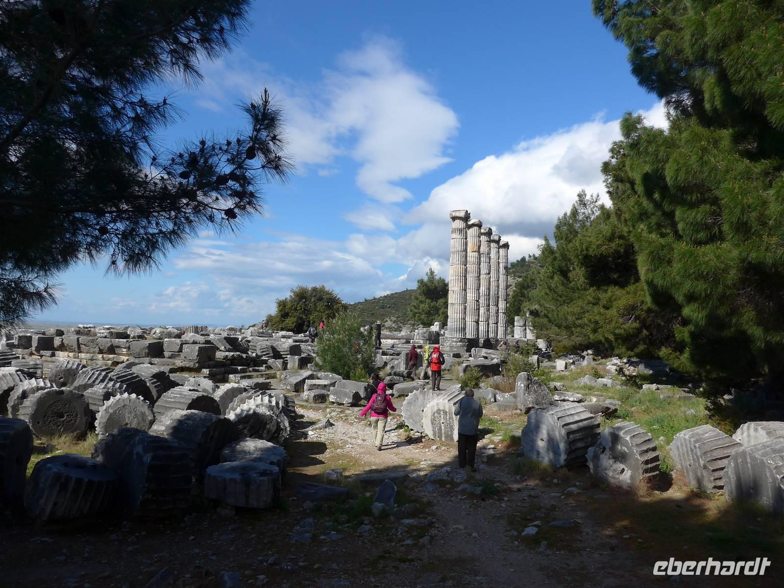Nach dem Frühstück brachen wir auf zur Besichtigung von Priene. Unterwegs erzählte uns Hassan, daß es in der Nacht am Paß geschneit hatte und wir den kältesten Winter seit 20 Jahren miterleben durften. Aber heute schien die Sonne und tauchte so das Ausgrabungsgelände in ein zauberhaftes Licht. Priene wurde um 350 v.Ch. neu gegründet, nachdem die erste Stadt unten im Tal langsam von Sedimenten begraben wurde. Die neue Stadt legte man in einem rechtwinkligen Straßenmuster oben am Berg an. Die Häuser auf den einzelnen Terrassen waren mit Treppen verbunden und am Hang entlang verliefen Straßen. Hoch über der Stadt thronte die Akropolis und sie ist heute nur mit einer Wanderung hinauf zu besichtigen. Wir sahen die vielen noch gut erhaltenen Stützmauern, machten im rein griechischen Theater ein Gruppenfoto und staunten über das große Areal des Tempel der Athena Polias. Unser Blick schweifte über das Mäandertal hinüber zum Latmos Gebirge, wo wir am Nachmittag wandern wollten. Nach knapp 2 Stunden verließen wir Priene und machten Stopp an einem Supermarkt, um für unser Picknick am Nachmittag einzukaufen.