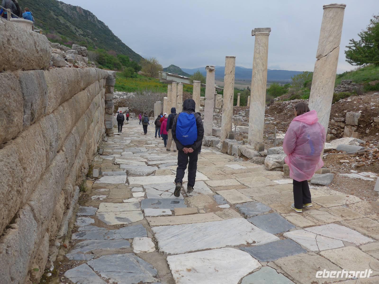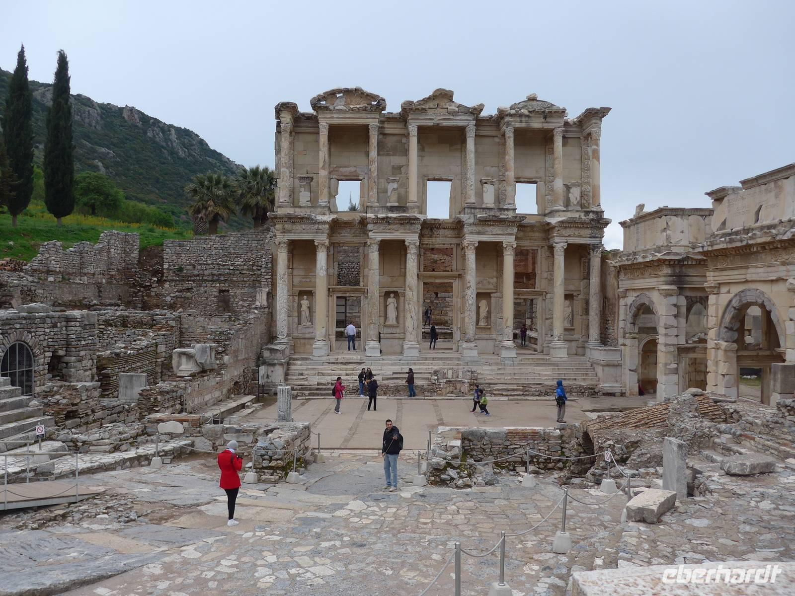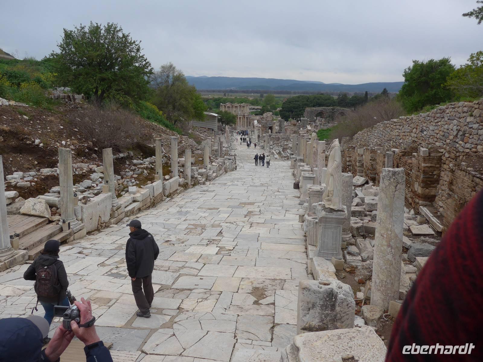 Nach dem Frühstück empfing uns Öndir unser neuer Fahrer mit einem größeren Bus und brachte uns nach kurzer Fahrt nach Ephesus. Hassan hatte 3 Stunden für die Besichtigung eingeplant und ging mit uns einmal quer von der Staatsagora bis zum Theater. Einst lag die Stadt am Meer, aber durch Verlandungen entstand eine große Mäanderebene, wo heute Baumwolle und Zitrusfrüchte angebaut werden. Ephesus wurde an 4 verschiedenen Stellen aufgebaut und verlassen. Das heutige 5. Ephesus ist die Stadt Selcuk mit einer großen Burganlage. Aber zurück zur antiken Stadt und zu unserer Besichtigung. Die heute noch vorhandenen Bauten, Straßen usw. stammen aus der Zeit der Römer und sind wegen des guten Erhaltungszustandes eine der wichtigsten Ausgrabungsstätten der Türkei. Uns hatte besonders die Kuretenstrasse mit dem Merkurtor, dem Trajans Brunnen, dem Hadrians Tempel, die Celsius Bibliothek und das große, einst 21000 Menschen fassende Theater beeindruckt. Auf dem Rückweg blieb dann Zeit zum Fotografieren und zum Besuch der Terrassenhäuser. Bei einem heißen Tee trafen wir uns alle wieder und fuhren mit unserem Bus danach zur Mittagspause.