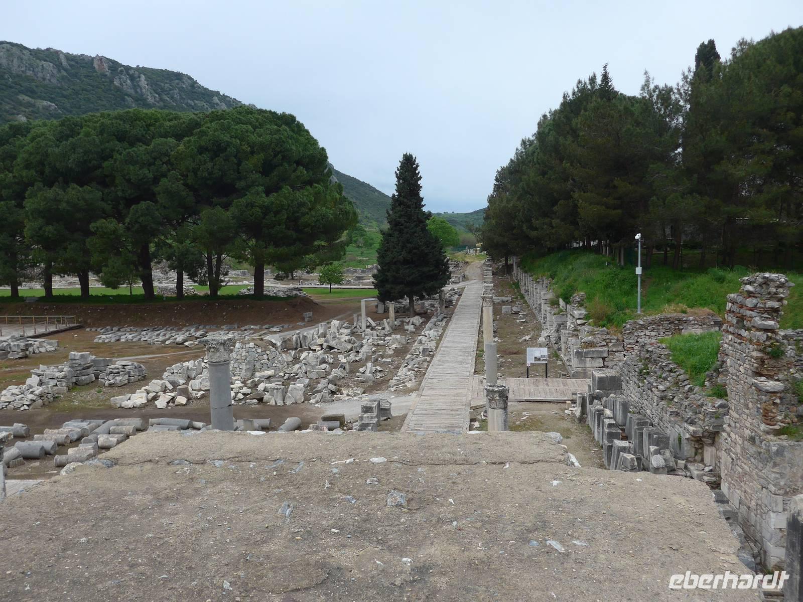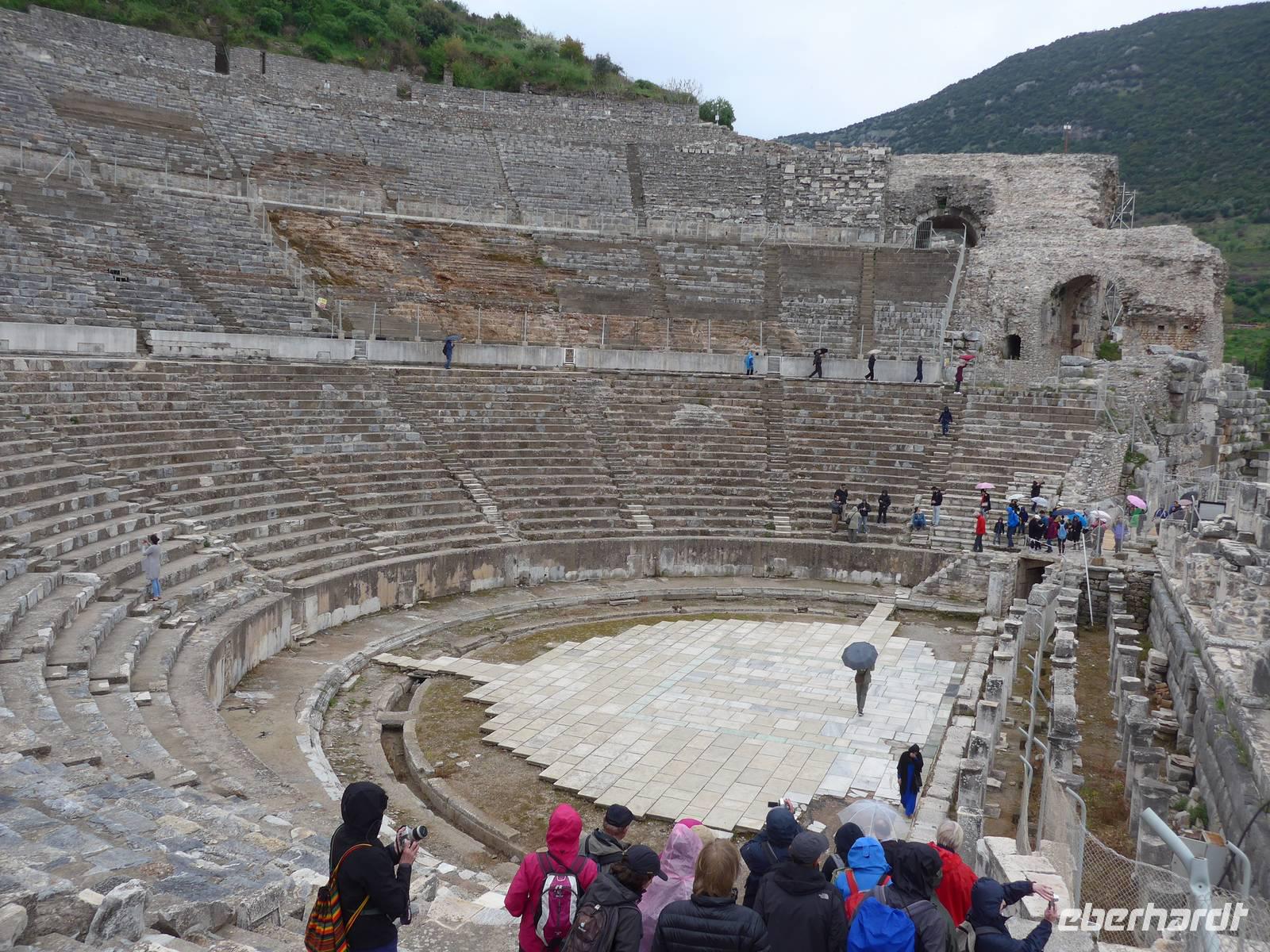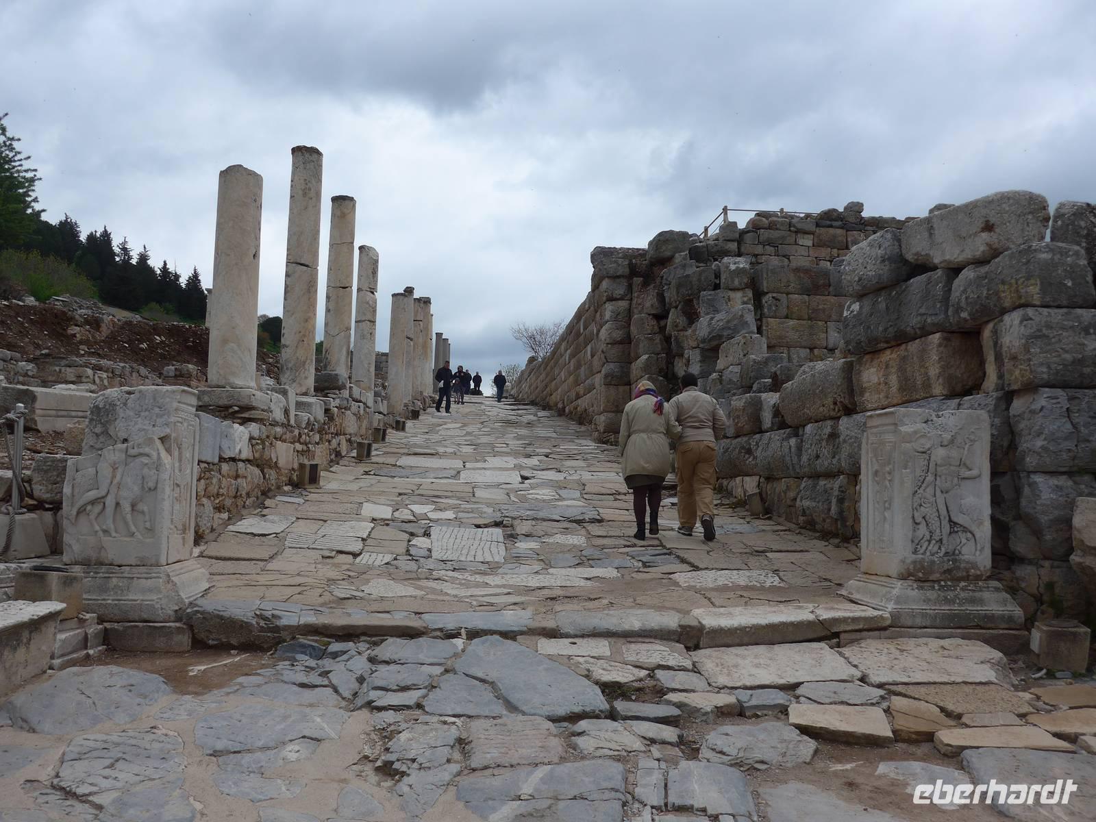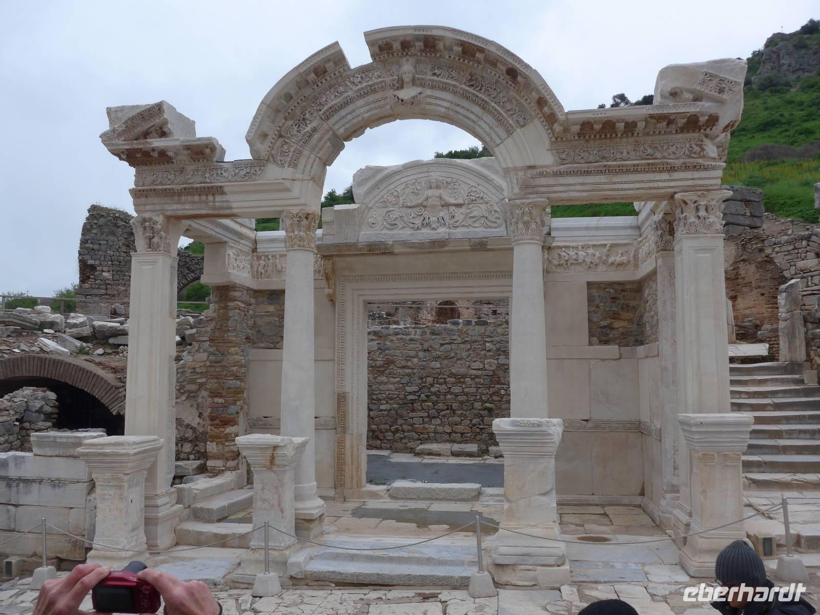 Nach dem Frühstück empfing uns Öndir unser neuer Fahrer mit einem größeren Bus und brachte uns nach kurzer Fahrt nach Ephesus. Hassan hatte 3 Stunden für die Besichtigung eingeplant und ging mit uns einmal quer von der Staatsagora bis zum Theater. Einst lag die Stadt am Meer, aber durch Verlandungen entstand eine große Mäanderebene, wo heute Baumwolle und Zitrusfrüchte angebaut werden. Ephesus wurde an 4 verschiedenen Stellen aufgebaut und verlassen. Das heutige 5. Ephesus ist die Stadt Selcuk mit einer großen Burganlage. Aber zurück zur antiken Stadt und zu unserer Besichtigung. Die heute noch vorhandenen Bauten, Straßen usw. stammen aus der Zeit der Römer und sind wegen des guten Erhaltungszustandes eine der wichtigsten Ausgrabungsstätten der Türkei. Uns hatte besonders die Kuretenstrasse mit dem Merkurtor, dem Trajans Brunnen, dem Hadrians Tempel, die Celsius Bibliothek und das große, einst 21000 Menschen fassende Theater beeindruckt. Auf dem Rückweg blieb dann Zeit zum Fotografieren und zum Besuch der Terrassenhäuser. Bei einem heißen Tee trafen wir uns alle wieder und fuhren mit unserem Bus danach zur Mittagspause.