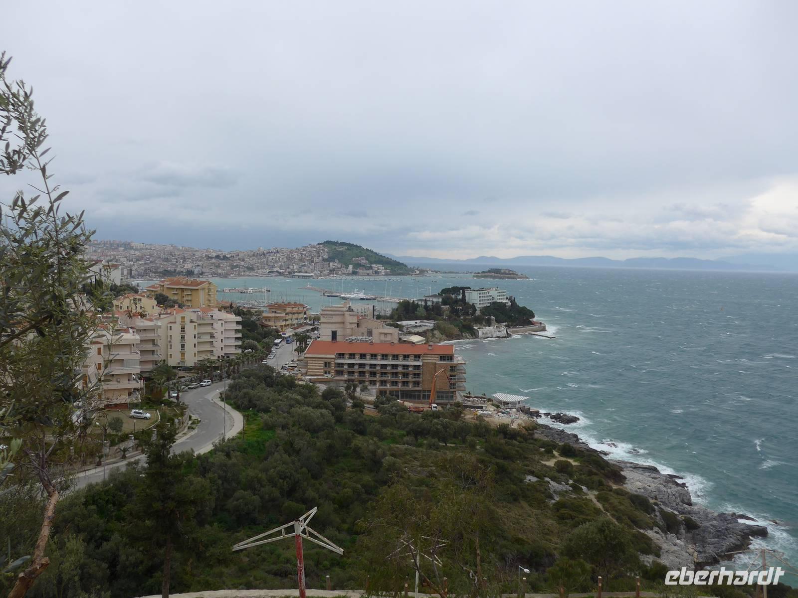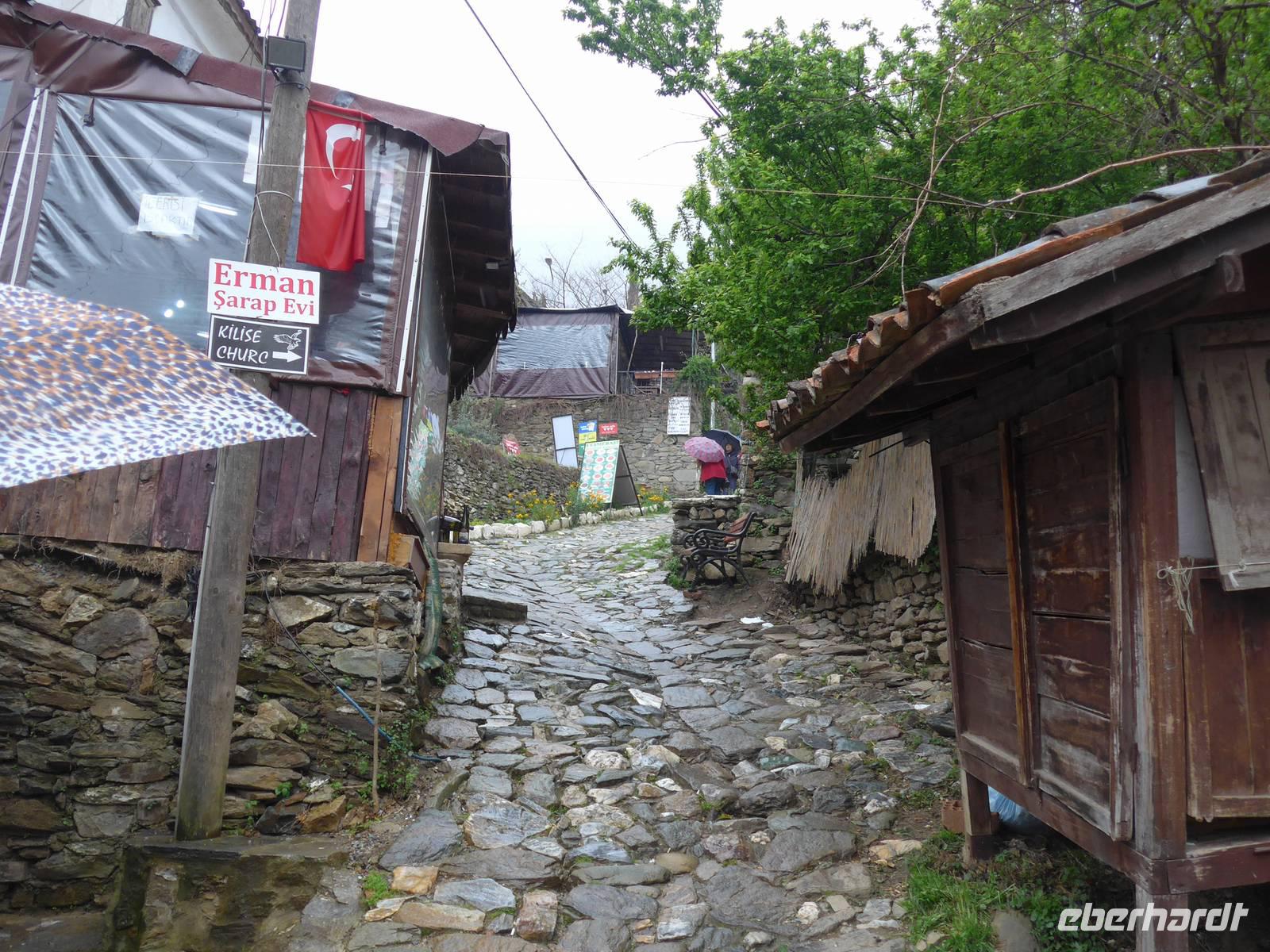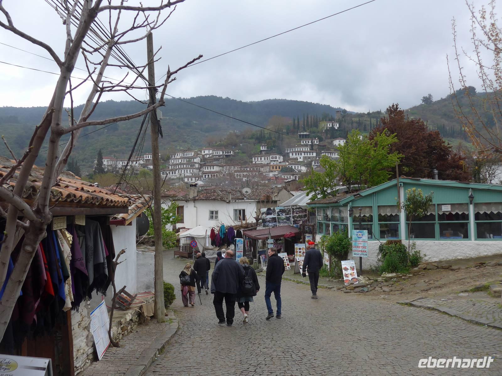 Bis zum 1. Weltkrieg war das Gebiet, welches wir auf unserer Reise entlang der ägäischen Küste besuchten, von Griechen bewohnt. Nach dem 1. Weltkrieg kam das Gebiet an die Türkei und es begann einer große Umsiedlung von Griechen nach Griechenland. So wurden ganze Dörfer verlassen und danach von Türken bewohnt. Ein solches ehemalds griechisches Dorf ist Sirince oben in den Bergen. Bei gutem Wetter sehr einladend für einen Spaziergang. Wir aber hatten Regen und besuchten deshalb zunächst ein Weinlokal mit Kamin. Sirince ist bekannt für Obstweine und es gab sogar Glühwein passend zur Termperatur. Danach besuchten wir dann die vielen Verkaufsstände. Lohnend war auch ein Spaziergang hinauf zur alten griechisch-orthodoxen Kirche mit einem schönen Blick über das Dorf. Auf der Rückfahrt ins Hotel machte unser Bus einen Stop im Zentrum von Kusadasi.