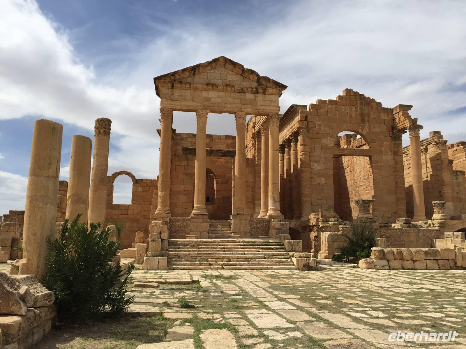 Unser Weg führte uns immer weiter landeinwärts zur Ruinenstadt Sbeitla. Schon von Weitem wurden wir vom Triumphbogen des römischen Kaisers Diocletian empfangen. Nach einer erholsamen Pause mit Kaffee und Tee erkundeten wir das außerordentlich gut erhaltene bzw. detailliert hergerichtete archäologische Gelände. Mit seinen unzähligen Ruinen römischer Tempel und Bäder, einem Theater, der frühchristlichen Kirchen und der byzantinischen Festungen ist das frühere Sufetula eine der größten archäologischen Stätten des Landes.