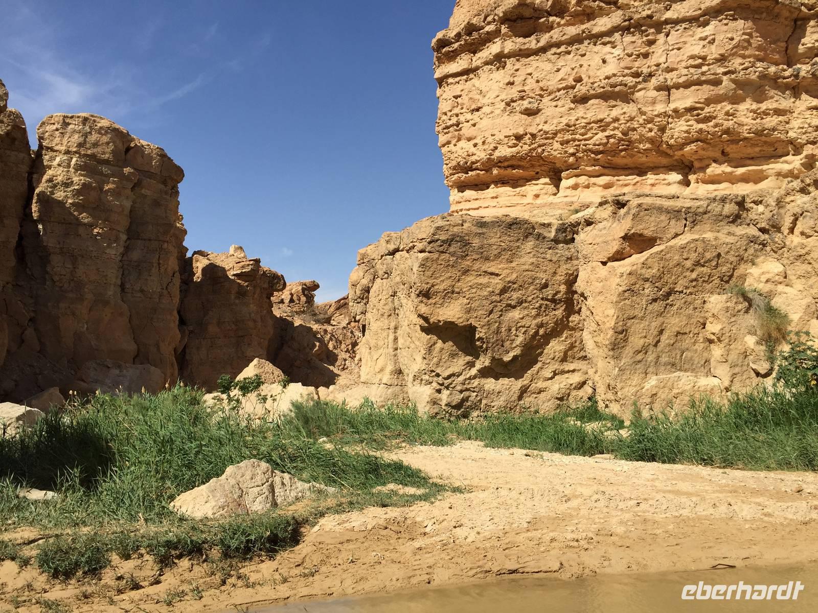 In der Gebirgsregion des Djebel en-Negueb, die von tiefen Schluchten durchzogen wird, liegt die Oase Tamerza. Schon die Römer kannten den Ort und nannten ihn "Tripolitanus Ad Torres" (Tamerza) - er war ein Teil ihrer Grenzbefestigung (Limes). Gemeinsam wanderten wir einige Meter hinunter zum Wasserfall mitten in der felsigen Wüste.