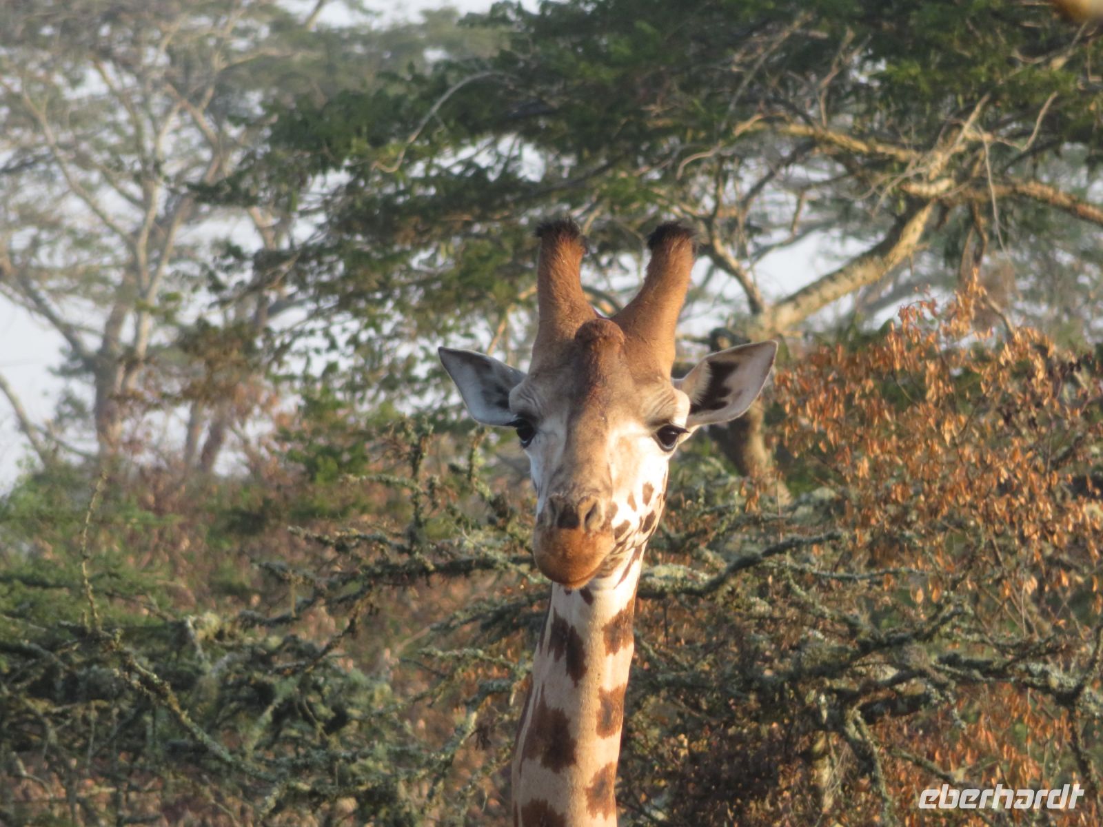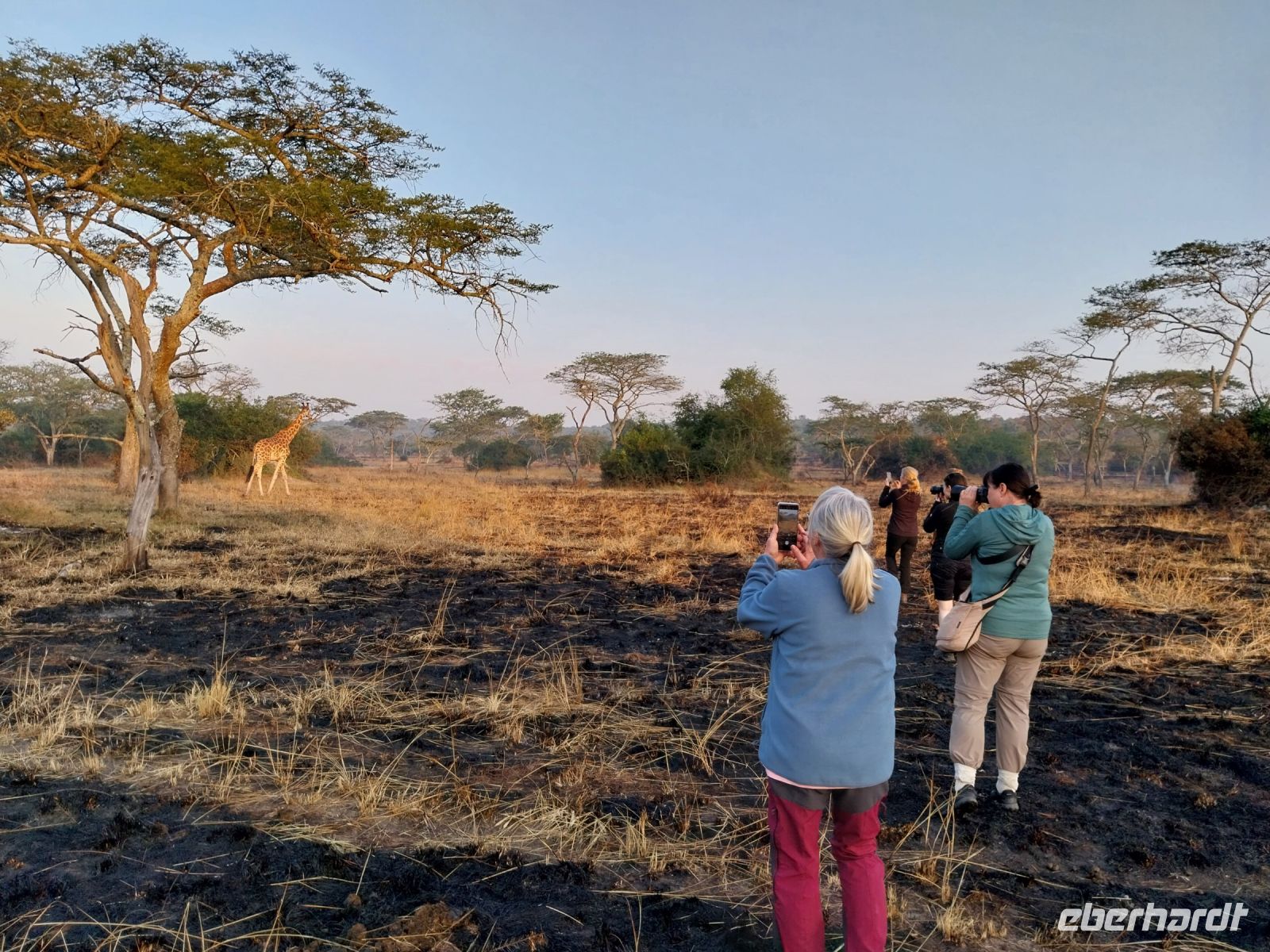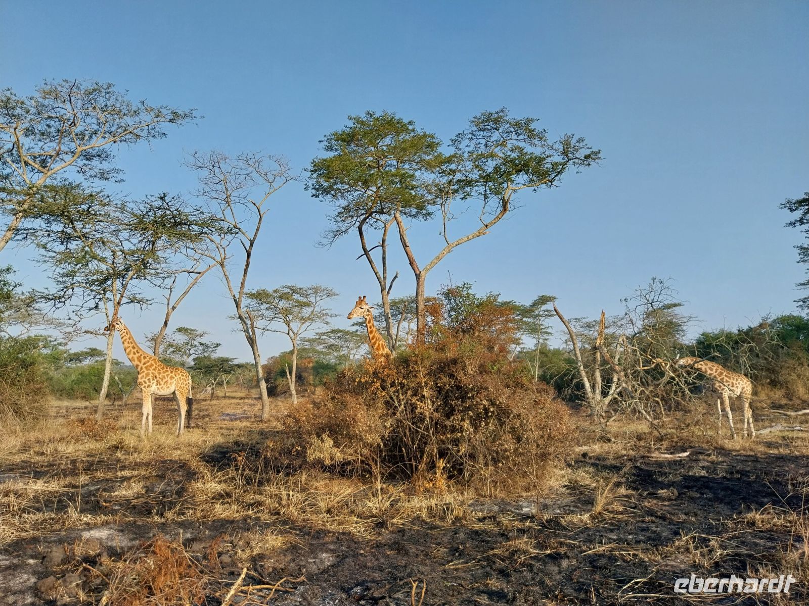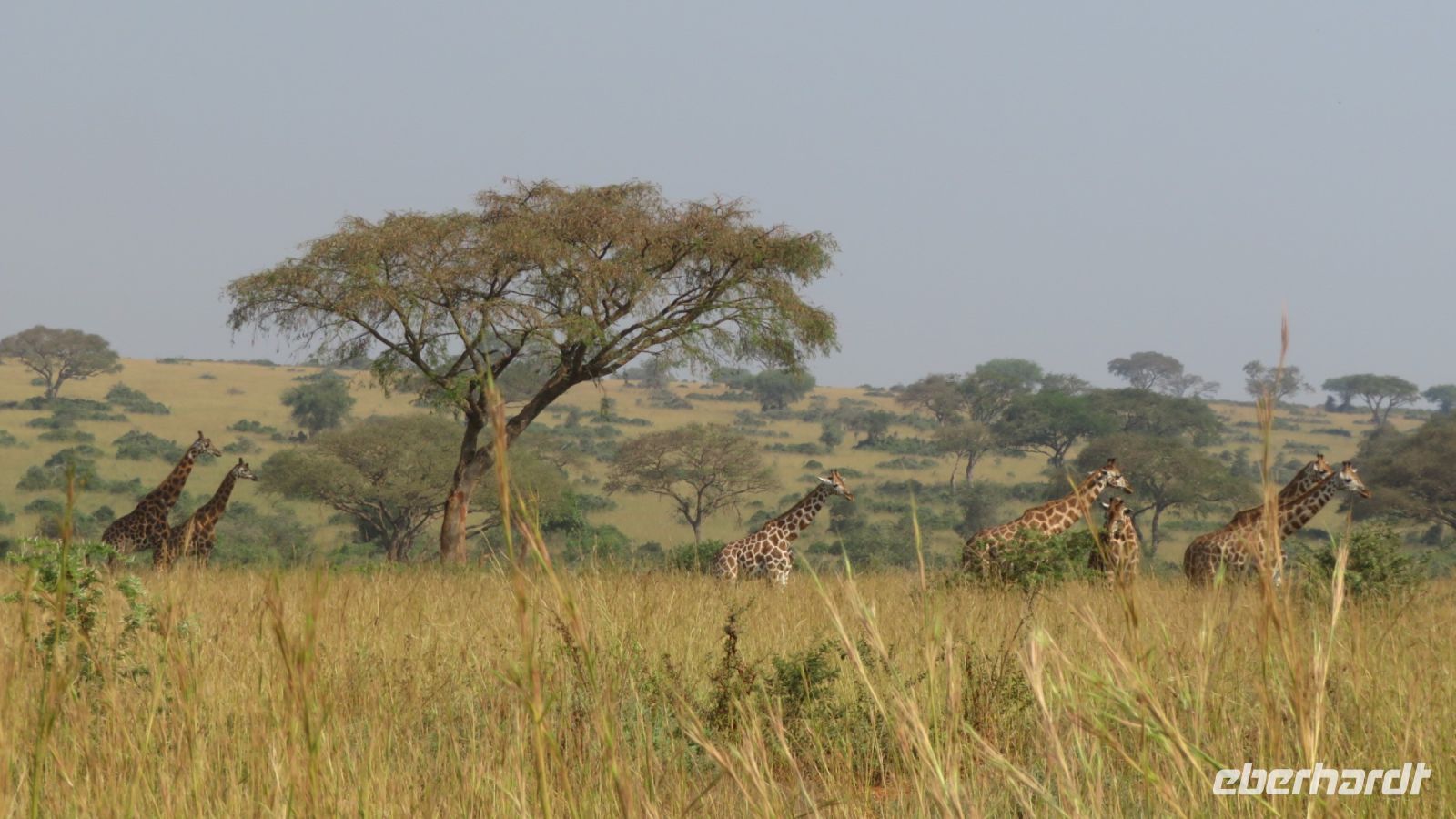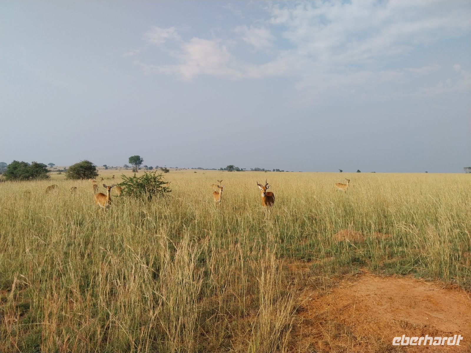 Am frühen Morgen, kurz vor Sonnenaufgang, starteten wir zu unserem Gamedrive im Murchison Falls-Nationalpark. Zuerst sahen wir eine Hyäne und anschließend viele weitere Tiere, z. B. Oribis, Kuhantilopen, Schlangenadler, Büffel, Kop (das Nationaltier Ugandas), unzählige Giraffen, Abdomenstörche, einige Elefanten, Warzenschweine sowie Hornraben, Geier und Patas-Affen.
