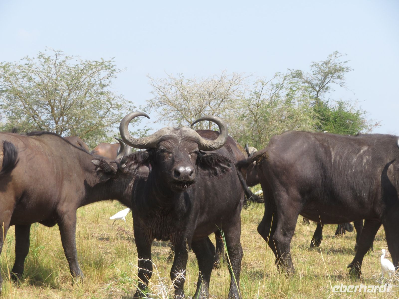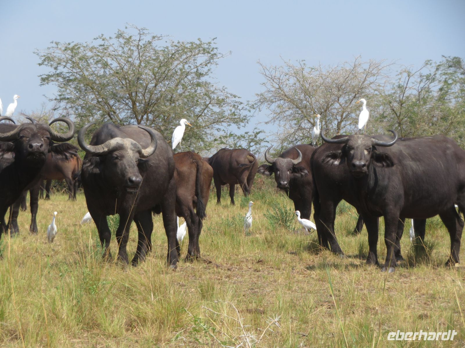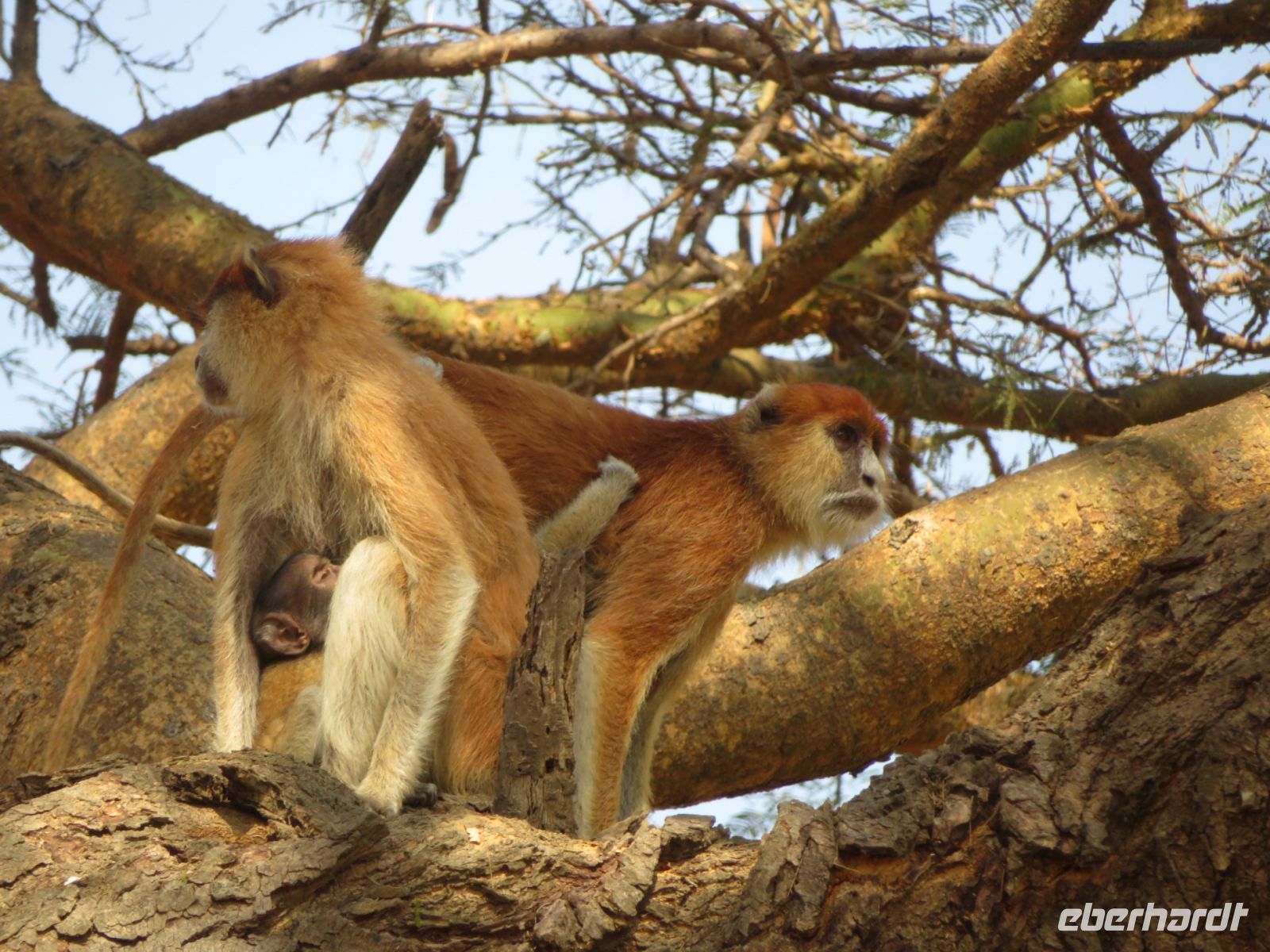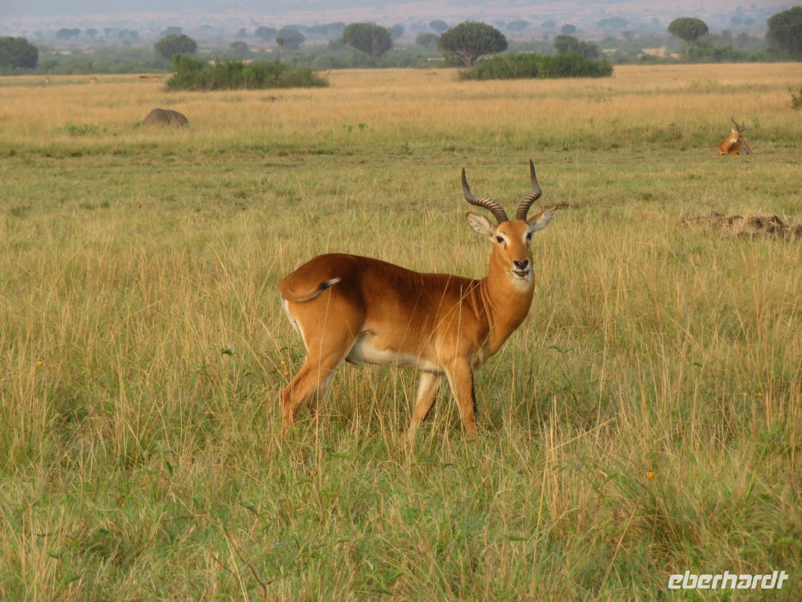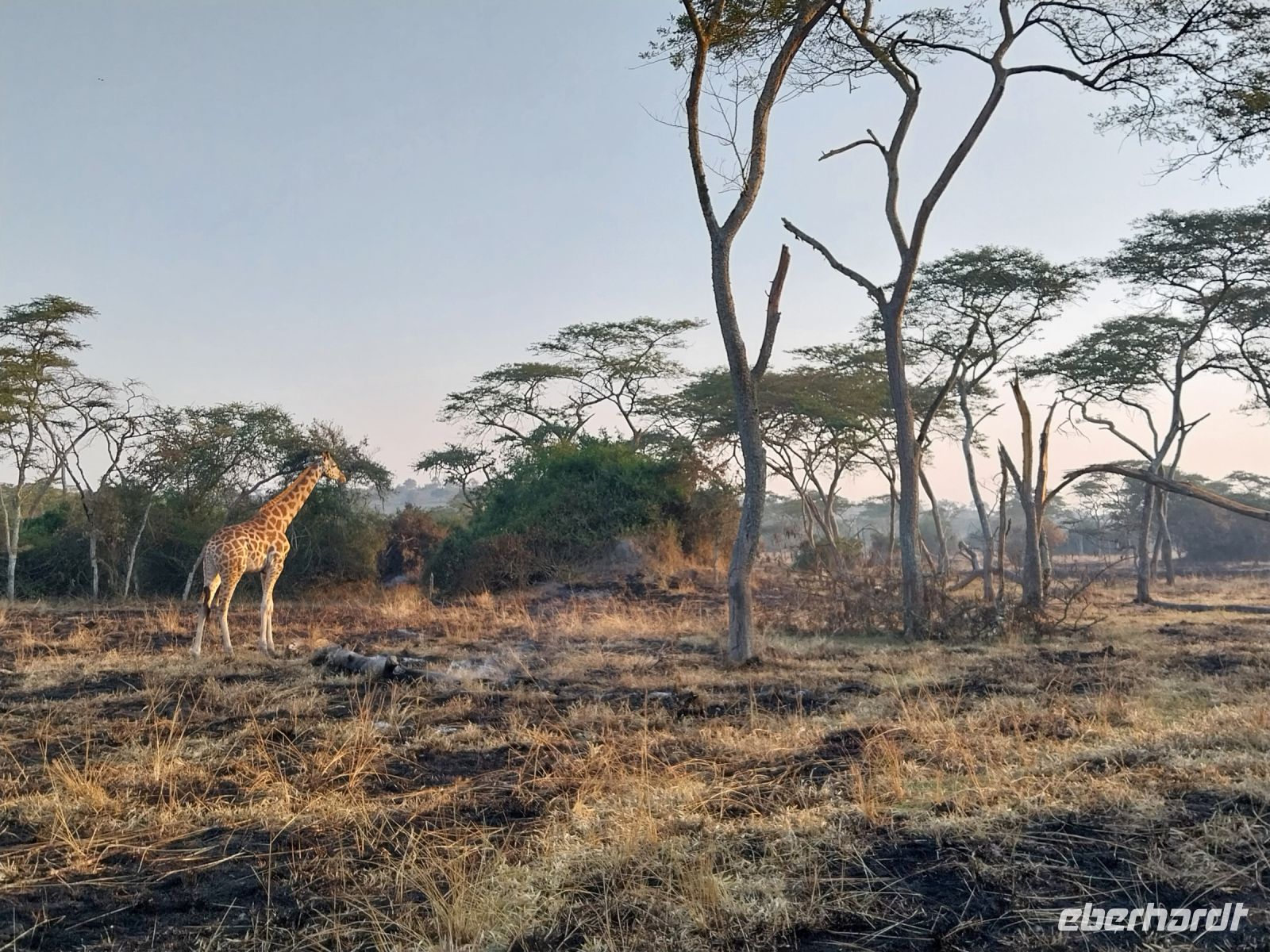 Am frühen Morgen, kurz vor Sonnenaufgang, starteten wir zu unserem Gamedrive im Murchison Falls-Nationalpark. Zuerst sahen wir eine Hyäne und anschließend viele weitere Tiere, z. B. Oribis, Kuhantilopen, Schlangenadler, Büffel, Kop (das Nationaltier Ugandas), unzählige Giraffen, Abdomenstörche, einige Elefanten, Warzenschweine sowie Hornraben, Geier und Patas-Affen.