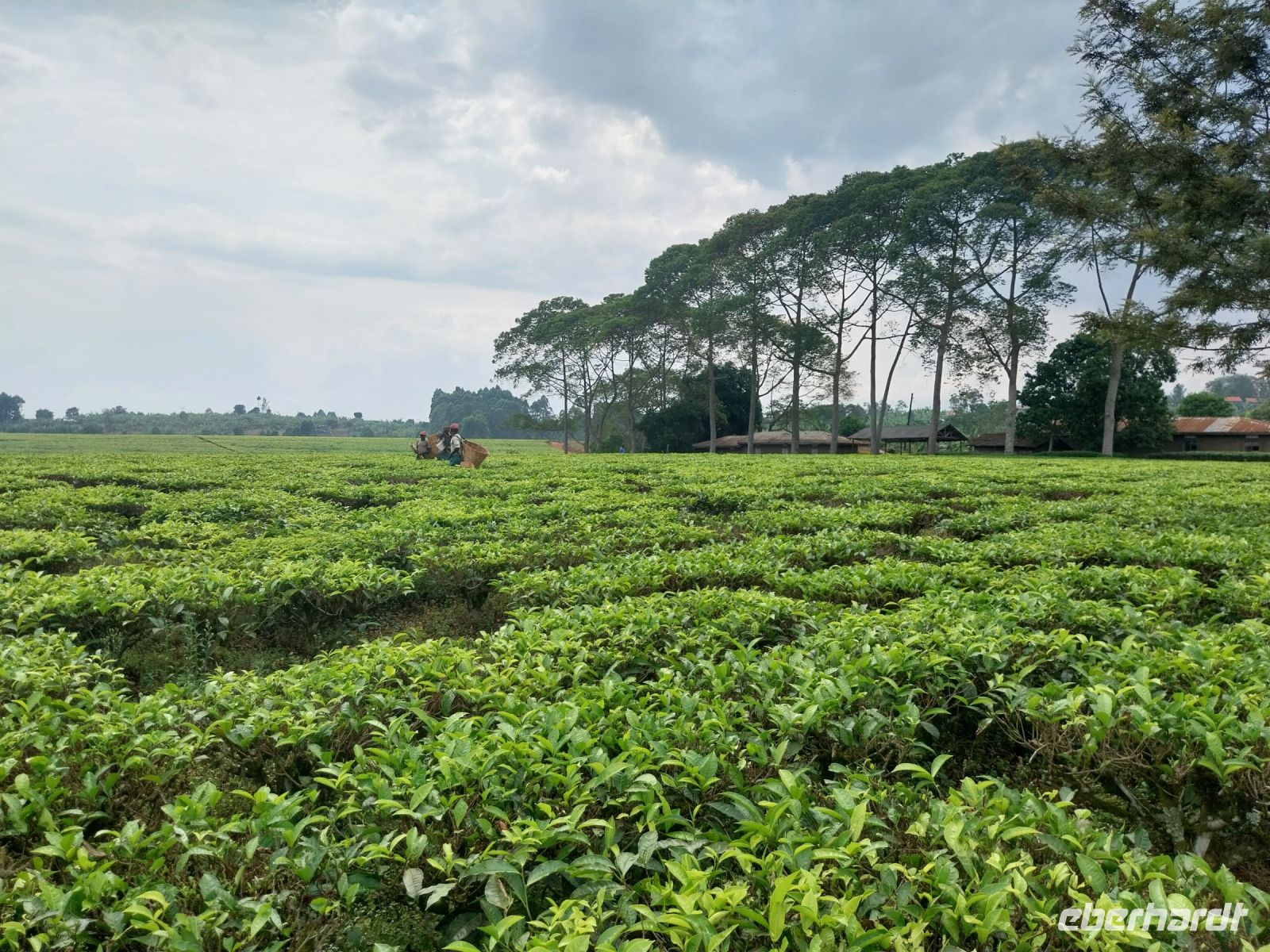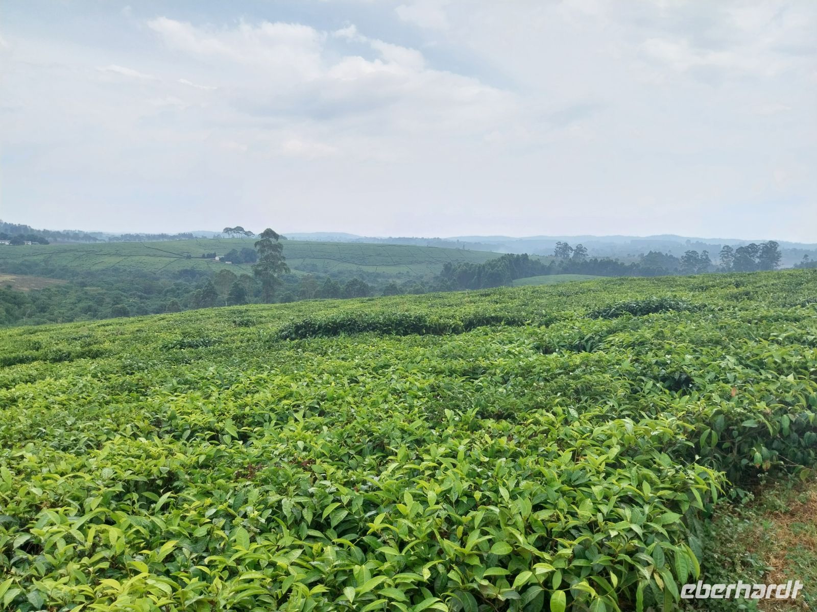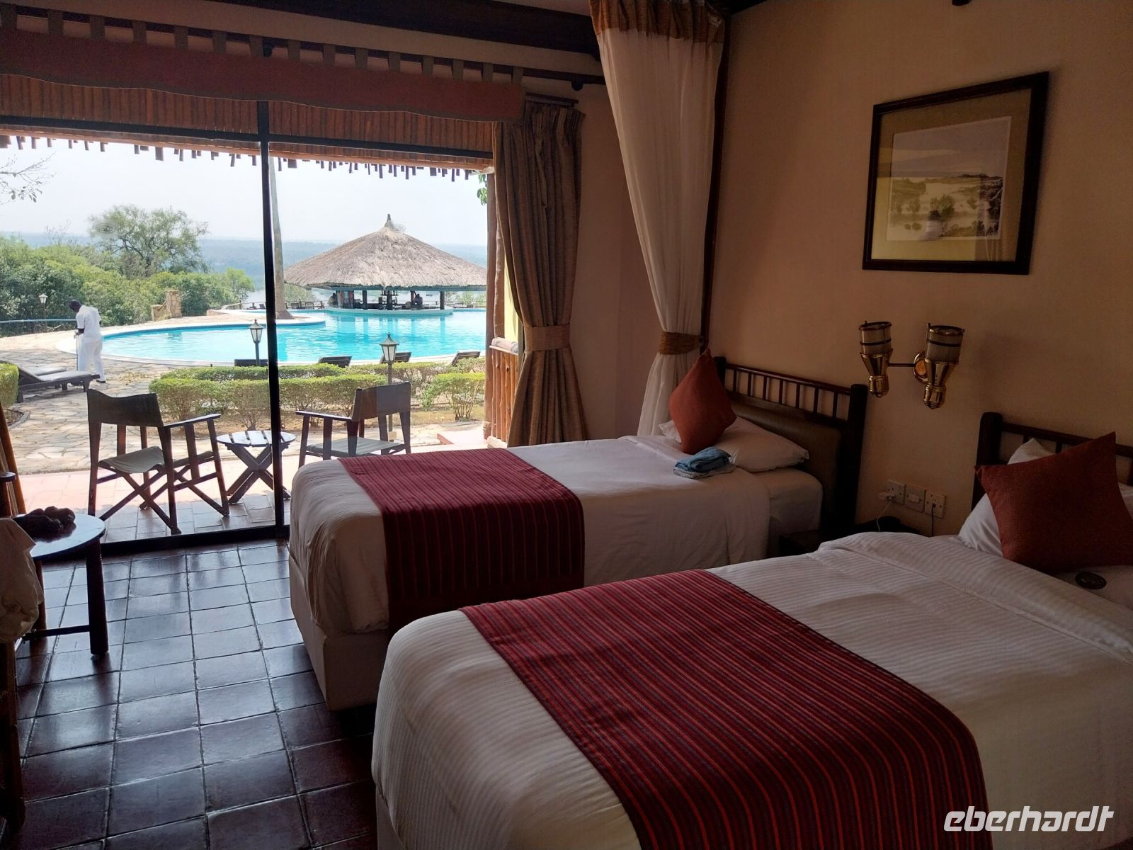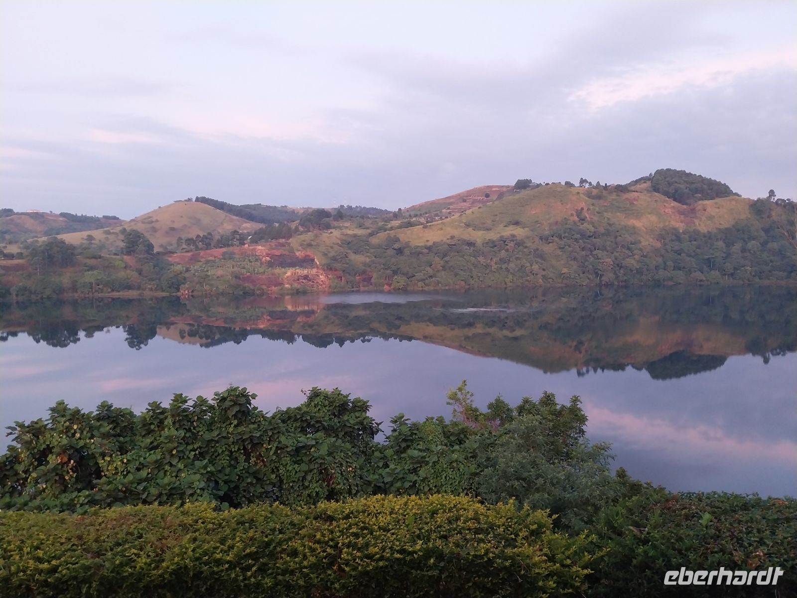 Im weiteren Verlauf auf ca. 1500 m Höhe sahen wir außerdem riesige Teeplantagen, wo der ugandische Schwarztee angebaut wird. Auch wir versuchten uns an der Teeernte. Am Nachmittag erreichten wir schließlich unsere luxuriöse Unterkunft - die Crater Safari Lodge. All unsere Zimmer boten einen unverbauten Blick auf den Kratersee eines erloschenen Vulkans. Wir genossen das Ambiente als einzige Gäste des Hotels.