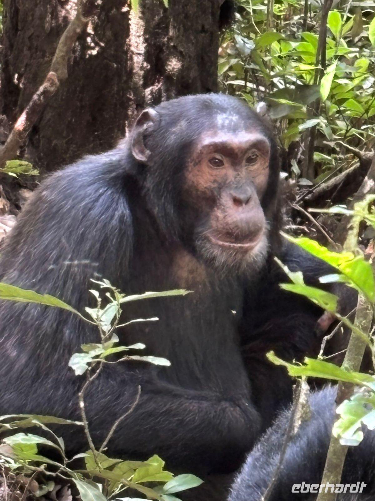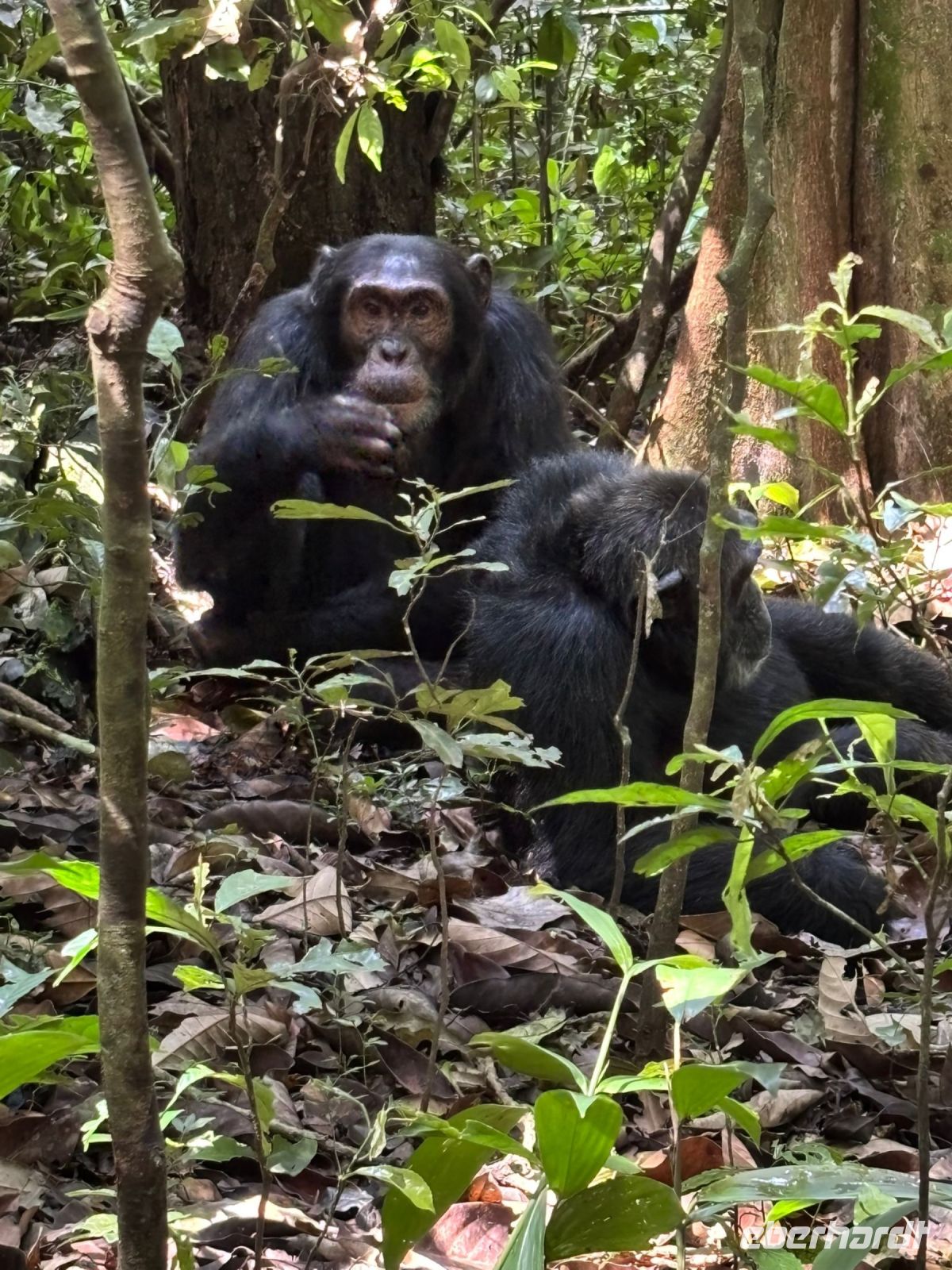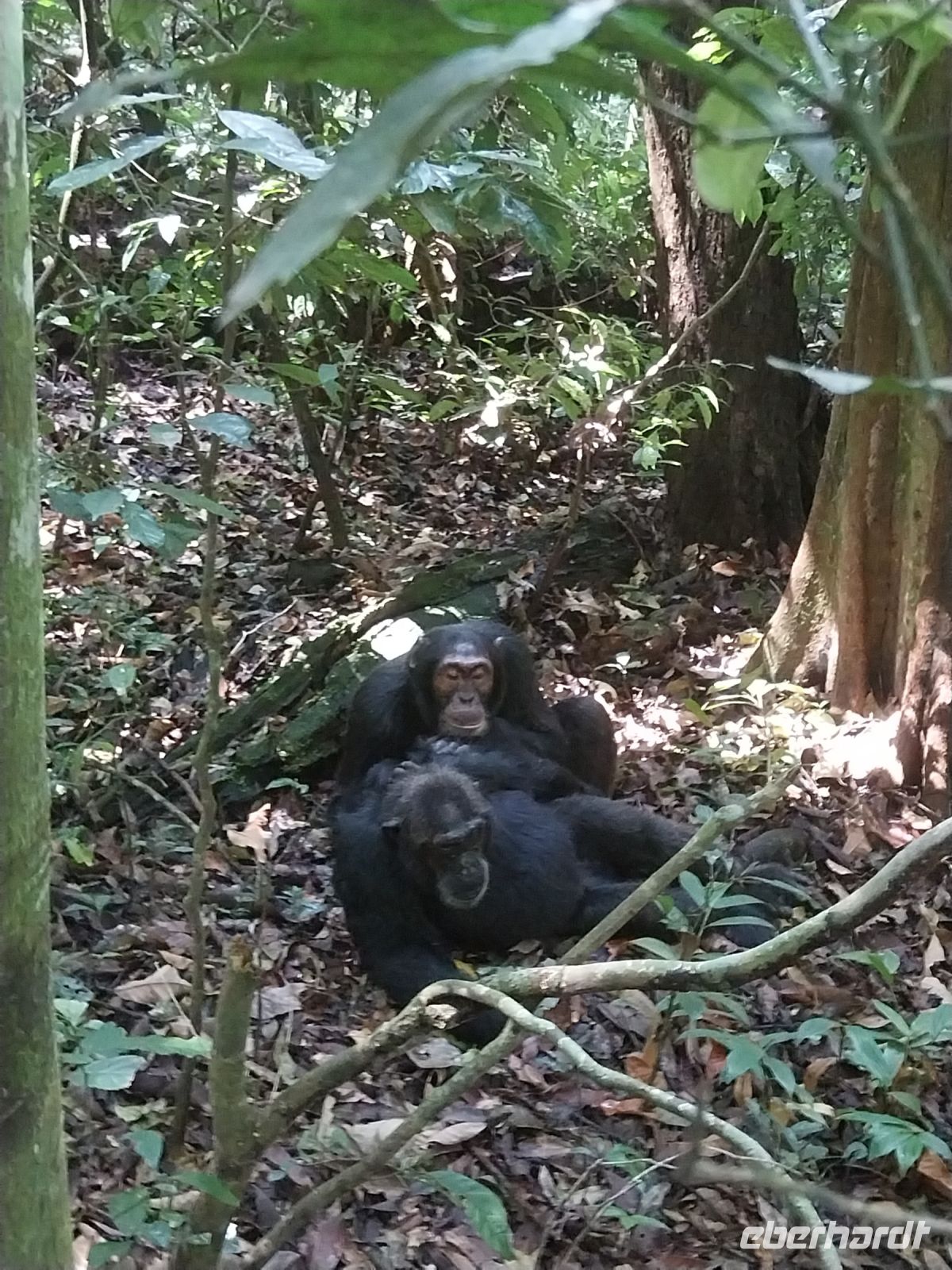 Wir hörten Vogelstimmen und sahen riesige Bäume und erhielten von unserer Rangerin Erklärungen. Schließlich sahen wir sie hoch oben in den Bäumen und nach einem weiteren Fußmarsch im unteren Geäst. Ein Weibchen spielte mit einem Baby, andere Schimpansen riefen laute Töne aus um auf die gefundenen Früchte aufmerksam zu machen. Schließlich kletterten sogar 2 Schimpansen direkt neben uns den Baum herunter und begutachteten gegenseitig ihr Fell nur wenigen Meter von uns entfernt.