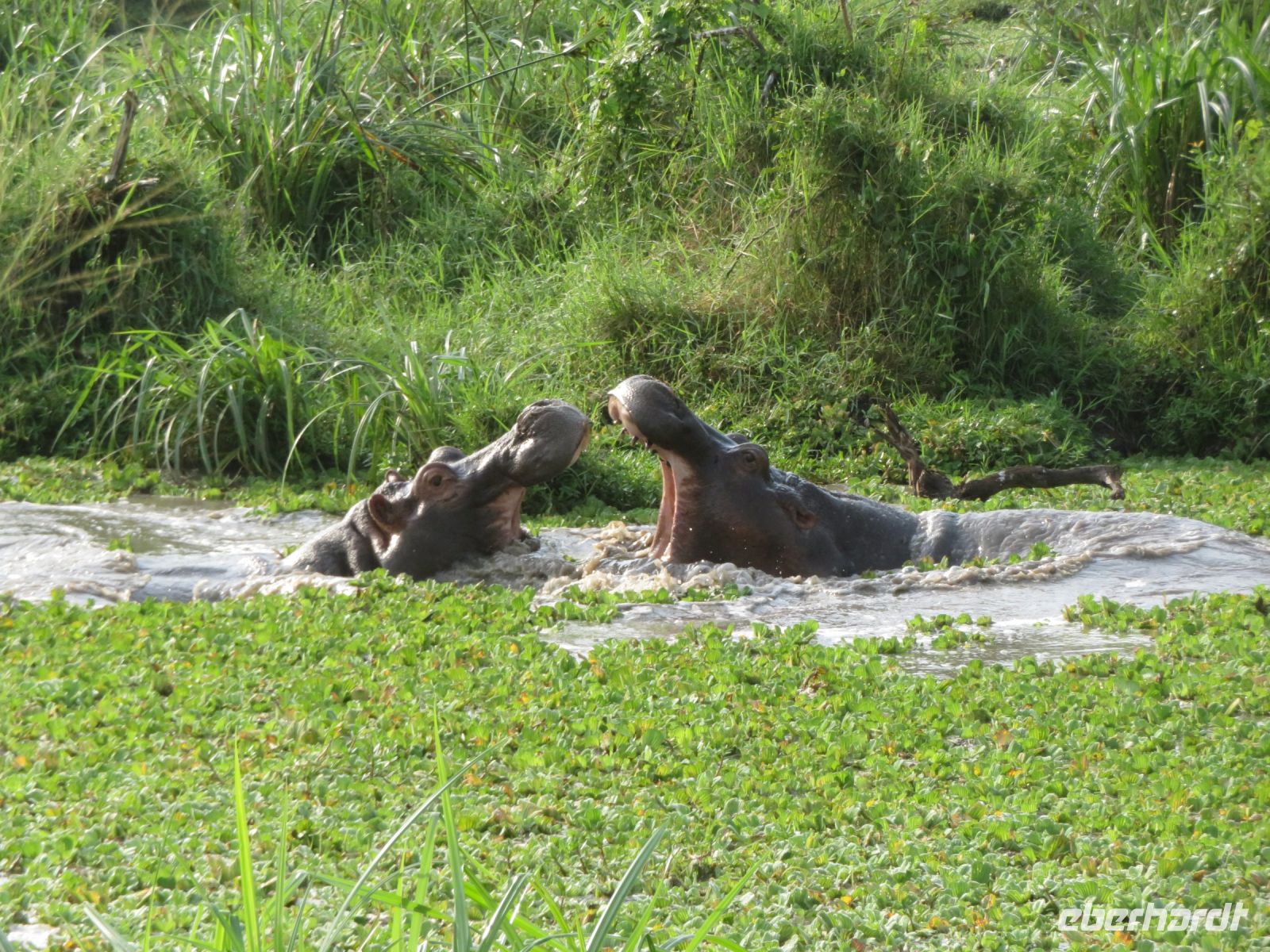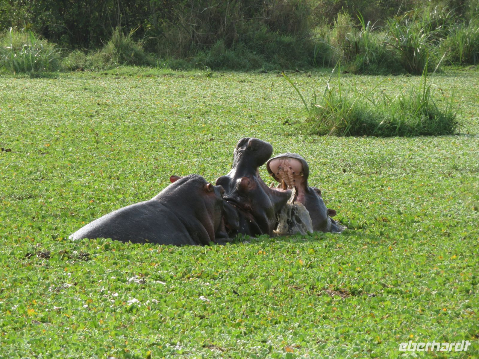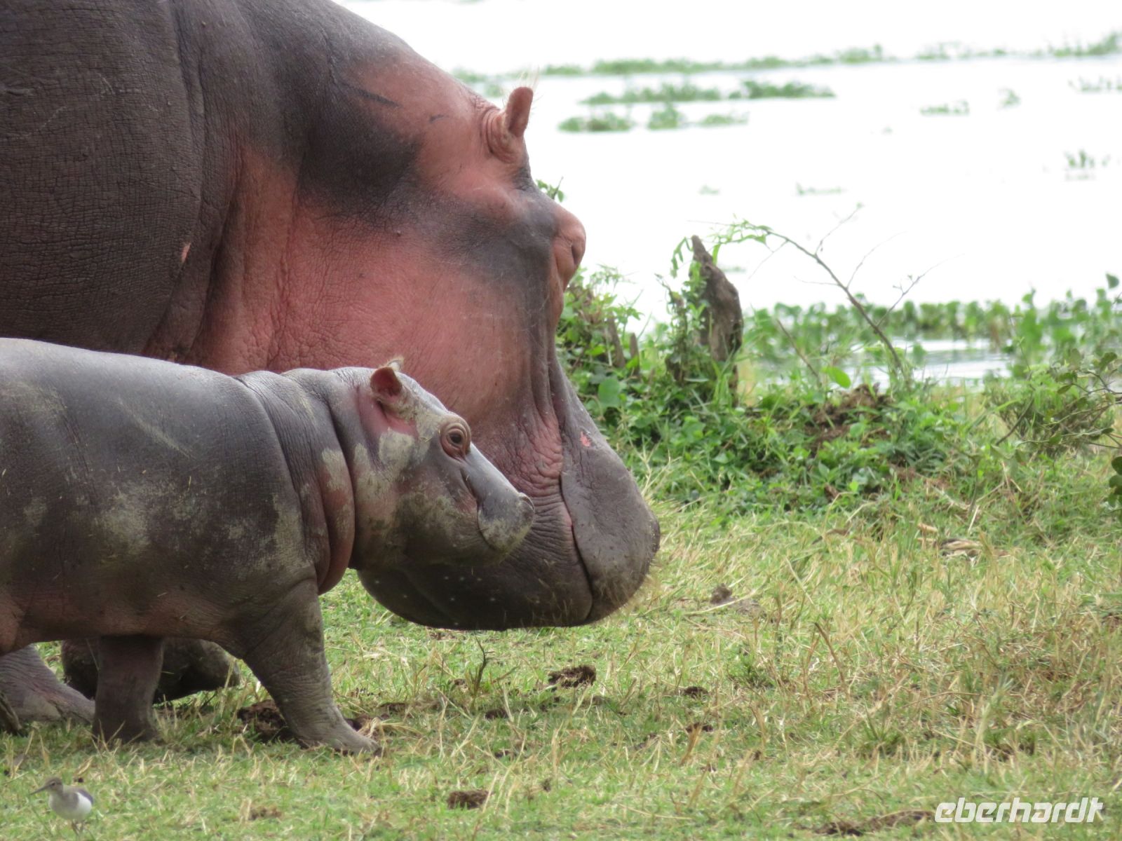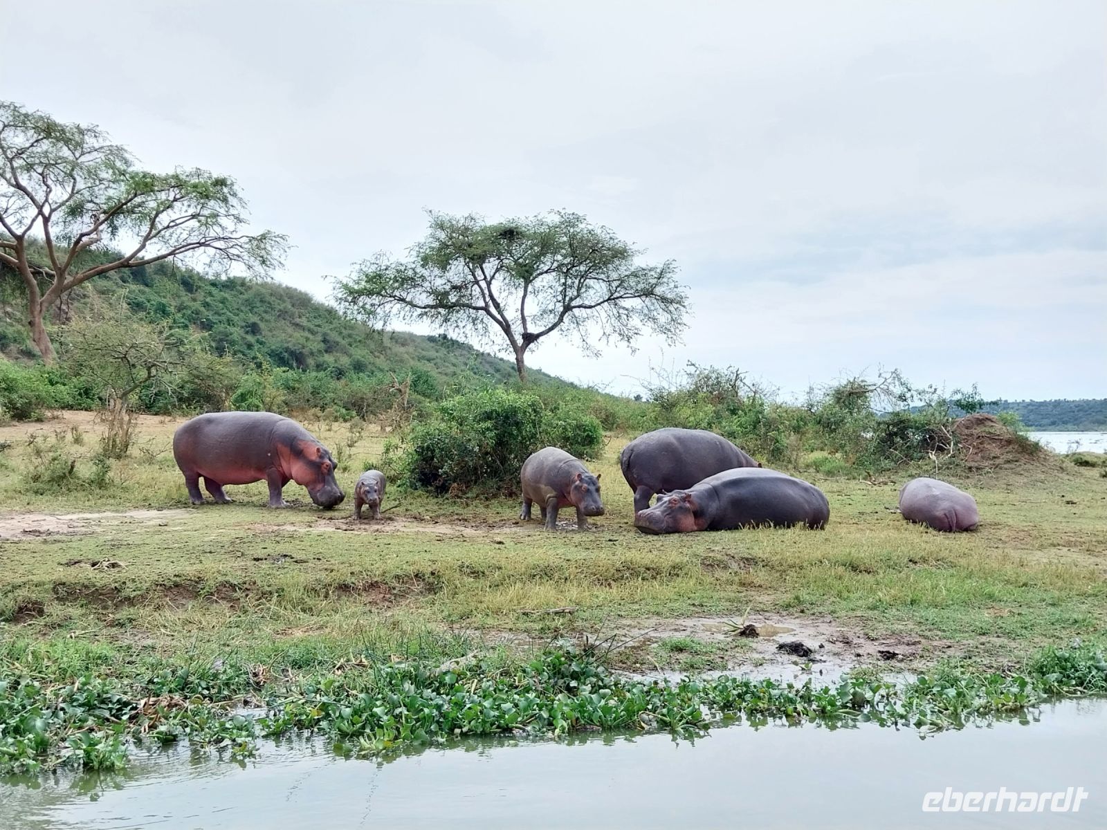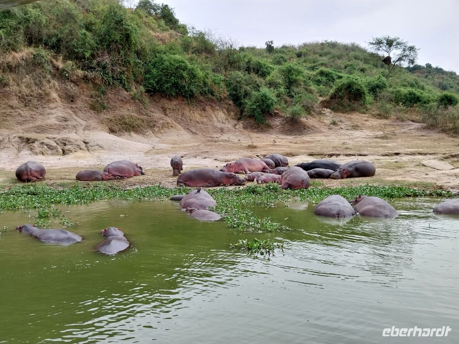 Am Nachmittag fuhren wir über drei Stunden mit dem Schiff auf dem Victoria-Nil bis kurz vor die Murchison Falls, welchen wir aus sicherer Entfernung bestaunten. Unterwegs beobachteten wir von den besten Plätzen Nilpferde, Krokodile, Elefanten mit Nachwuchs und unzählige verschiedene Vögel, wie den Afrikanischen Friedensadler sowie Eisvögel.