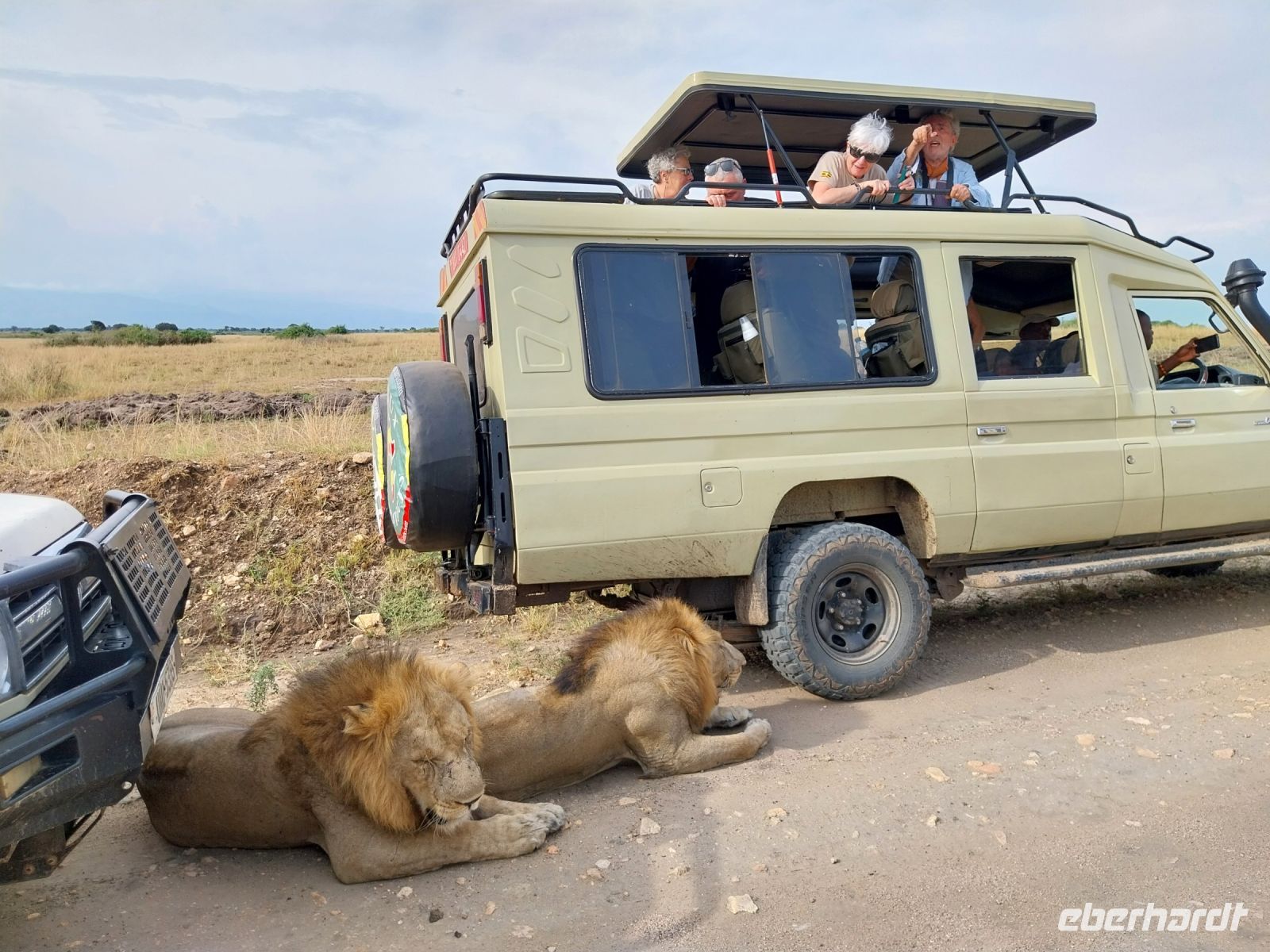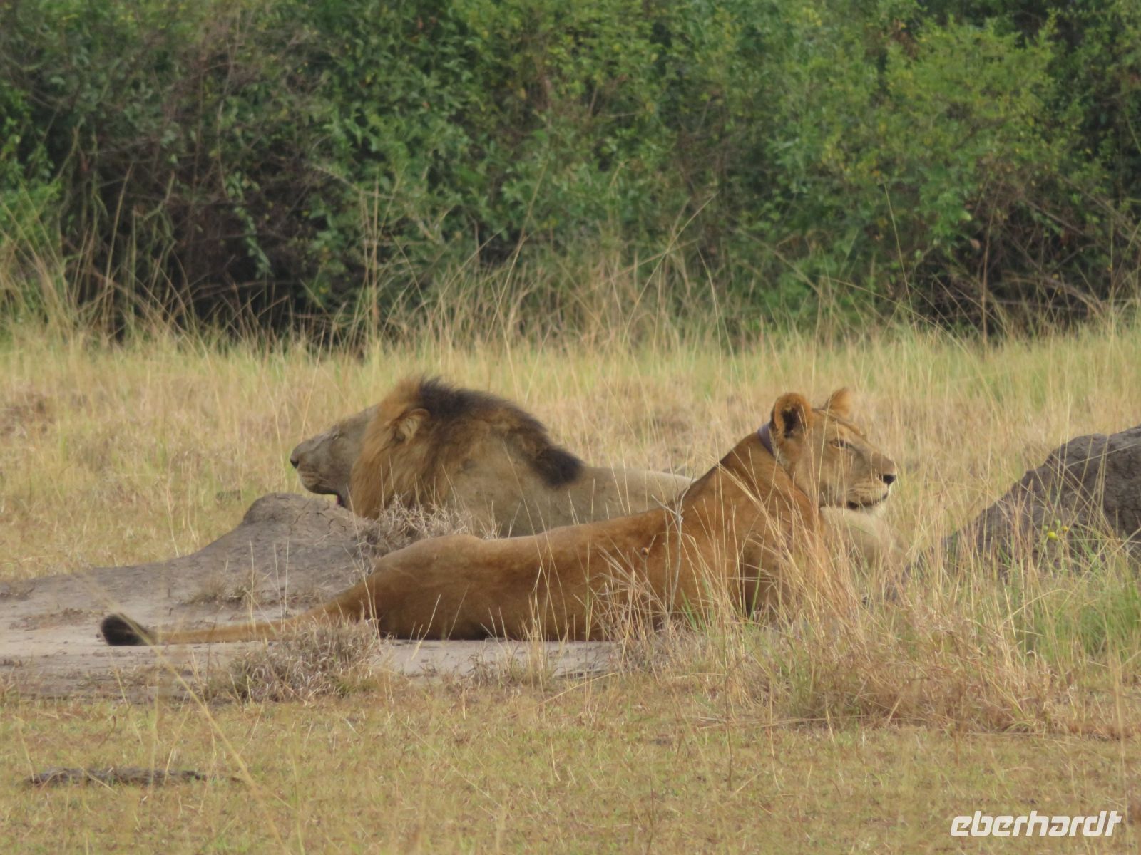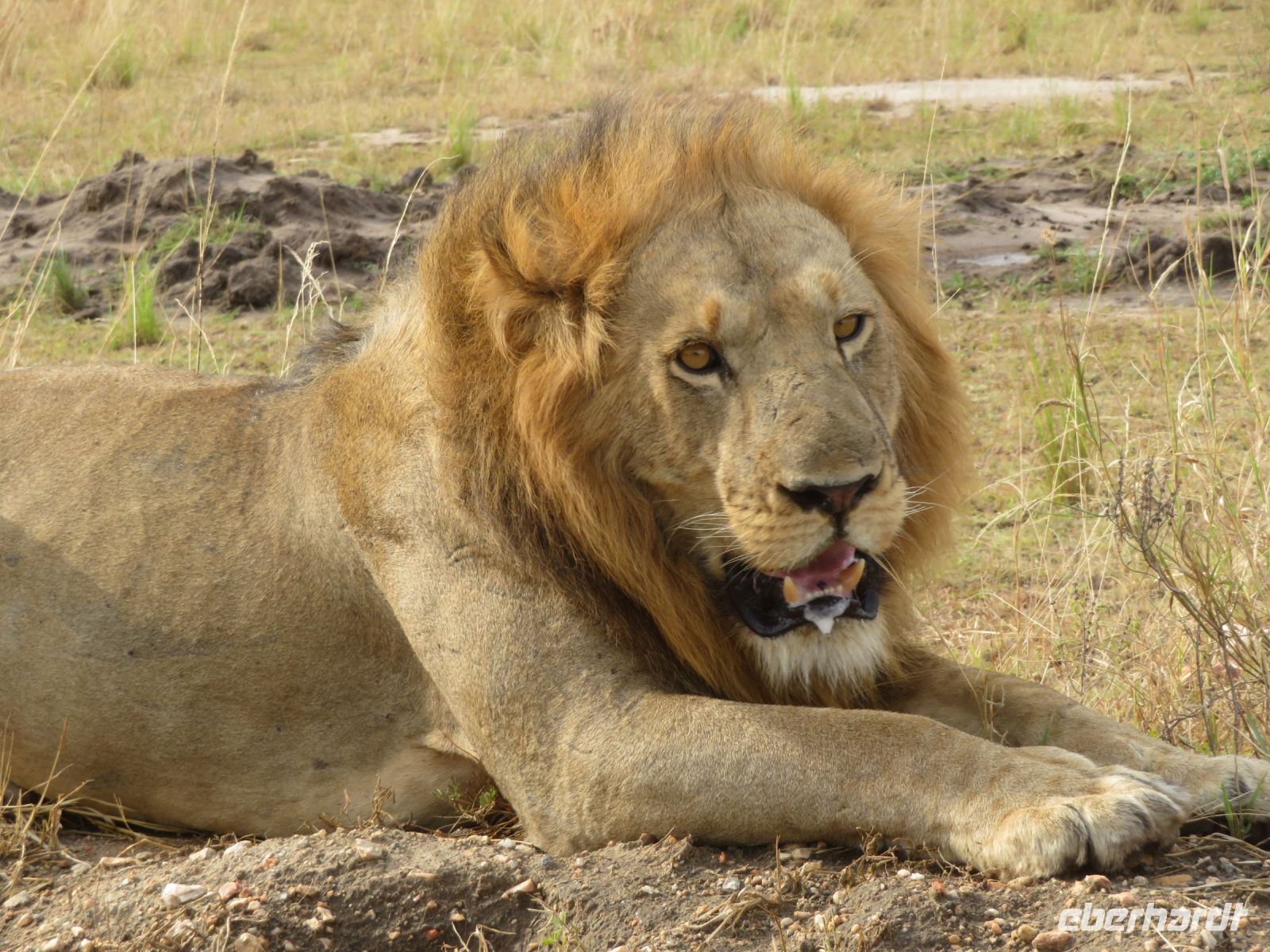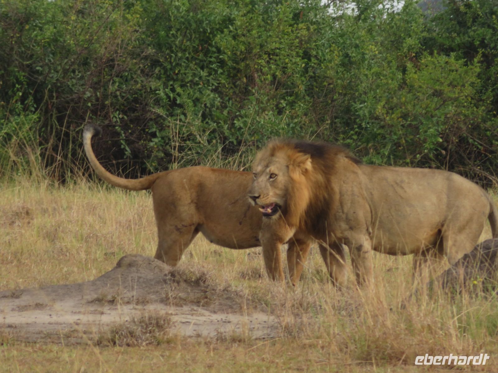 Nach dem Mittag unternahmen wir eine Bootsfahrt auf dem Kazinga-Kanal. Wir sahen wieder eine Vielzahl unterschiedlicher Vögel, Nilpferde, Krokodile und einen Lizard. Im Anschluss fuhren wir noch durch den Queen Elizabeth-Nationalpark. Hier sahen wir in unmittelbar Nähe zu unserem Jeep zwei Löwenmännchen. Diese legten sich schließlich direkt vor unser Auto. Es entstanden tolle Fotos.