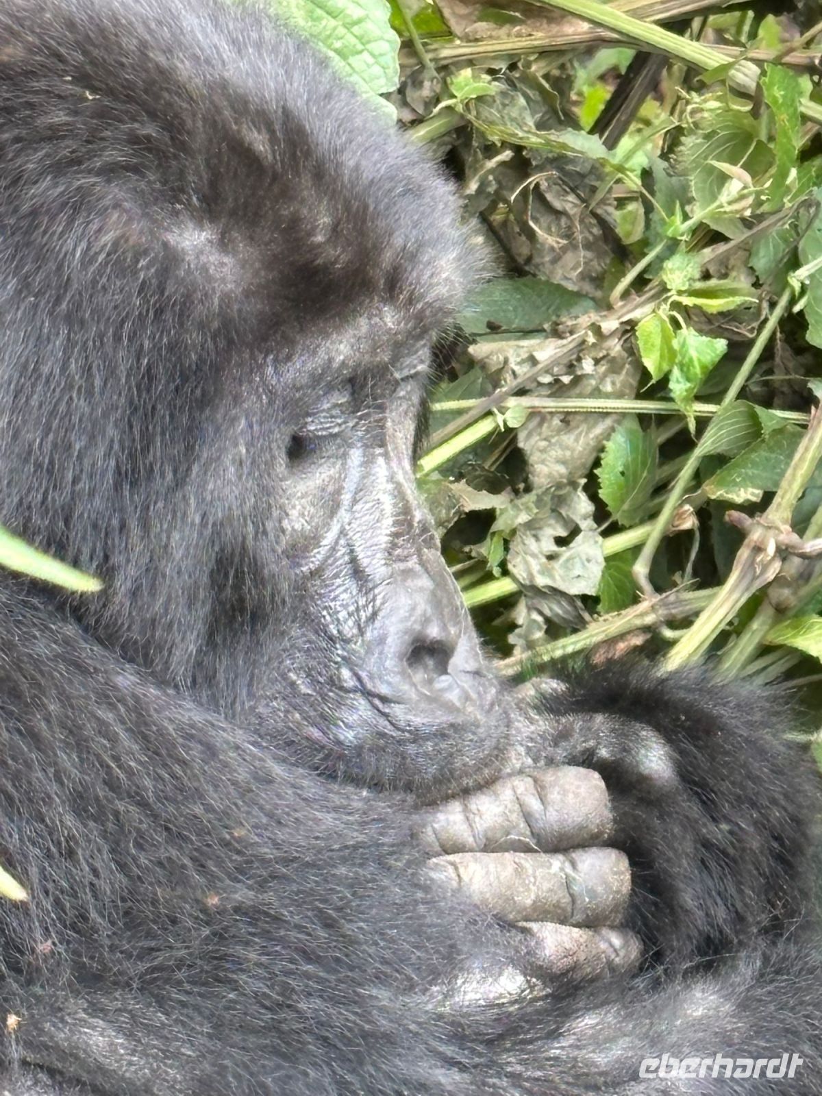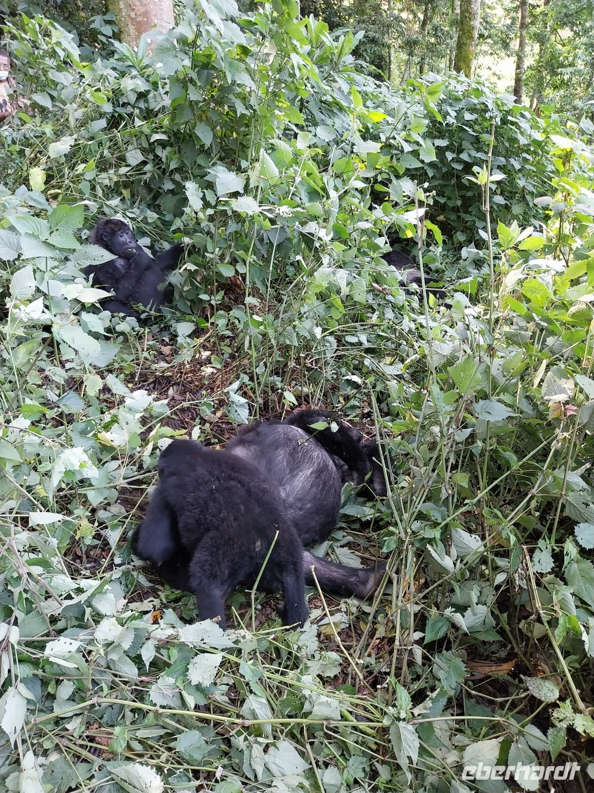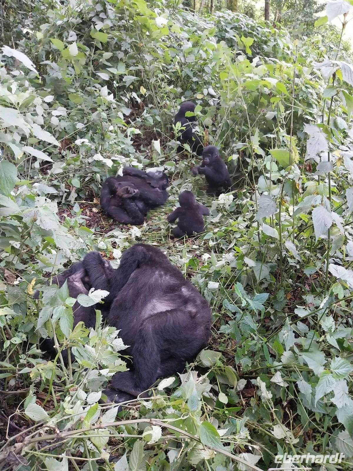 Es dauerte auch nicht lange, bis uns die ersten spielenden Gorillas in über 2000 m Höhe über den Weg liefen. Schnell setzten wir die Masken auf und konnten sie eine knappe Stunde zum Beispiel beim Spielen, Fressen und Nuckeln an der Brust beobachten, knipsten Fotos und drehten Videos. Leider verging die Zeit viel zu schnell und der sehr steile Abstieg, welchen alle meisterten, folgte.